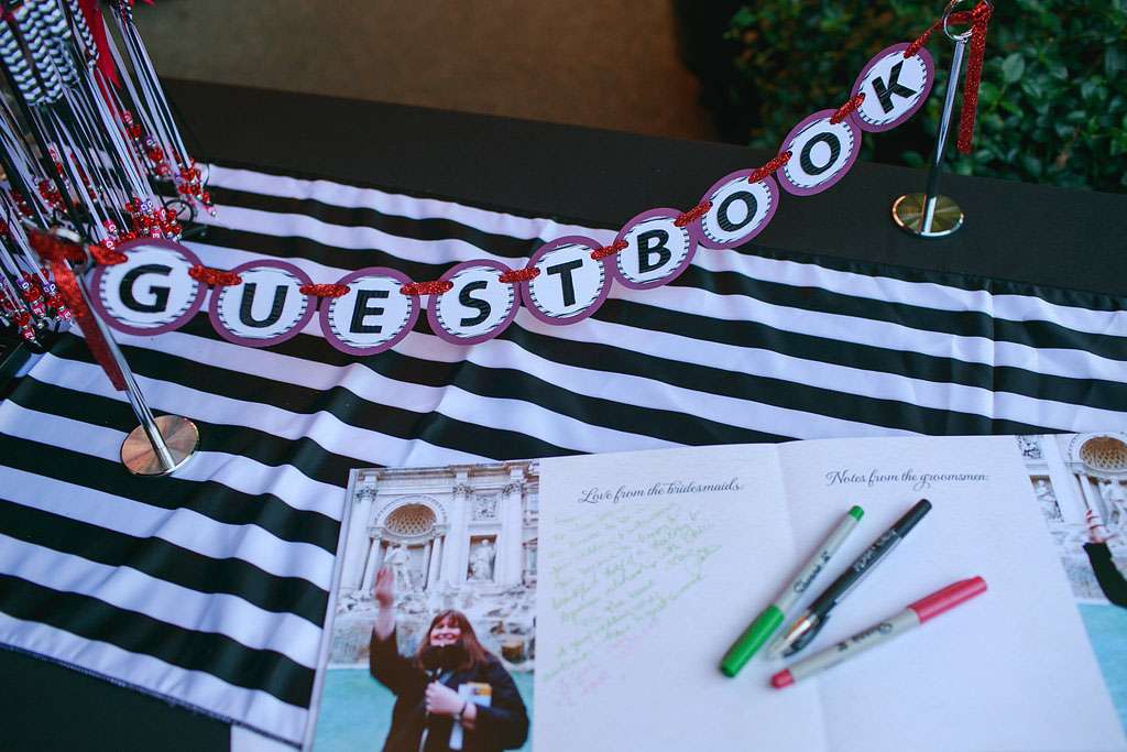 There were plenty of craft projects in the wedding, including most of the décor at the reception. “I love to do DIY projects!” explained Gina. “We had 14 months to prepare the wedding so I was able to make many parts of it myself. Once we decided on a theme and general look for the day, I scoured every blog and wedding website for inspiration and ideas. I made the stationery in a retro style, printing record labels and record sleeves using photo sticker paper sheets and my home inkjet printer. I also made our ceremony programs using the photo sticker paper sheets applied to chipboard and finished with a black and white striped ribbon.”