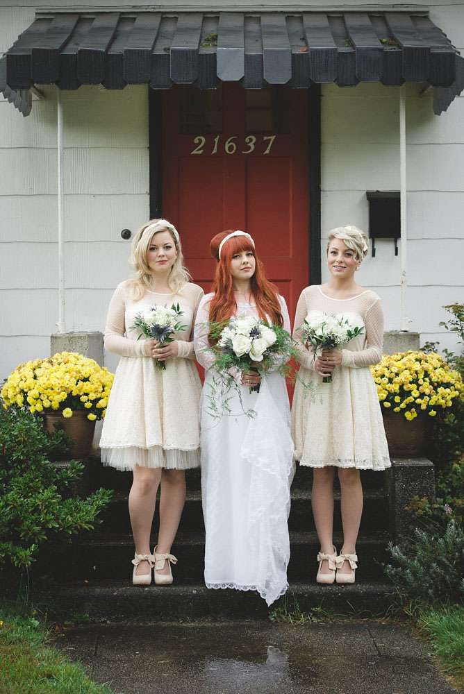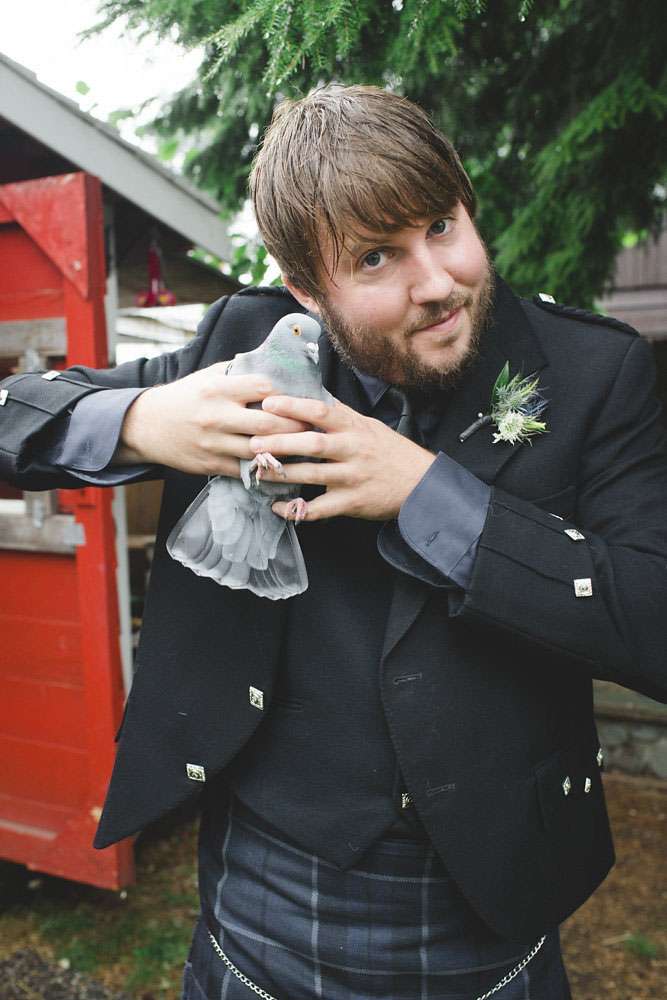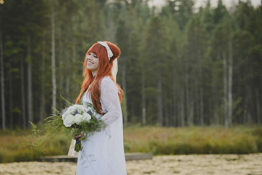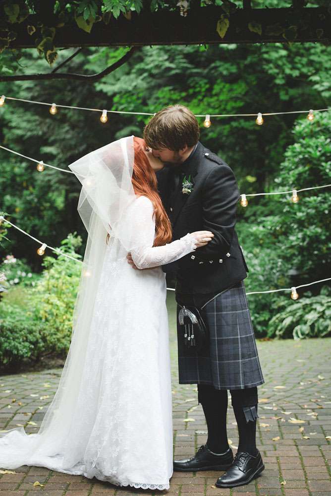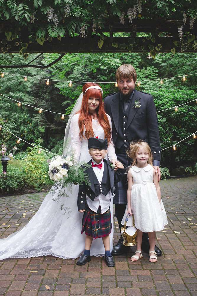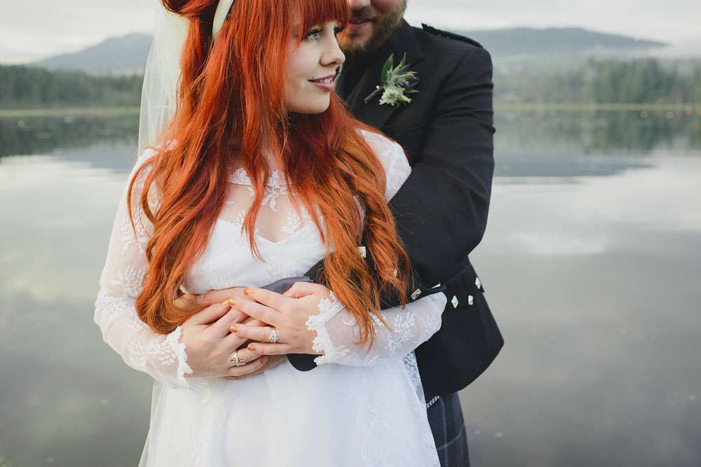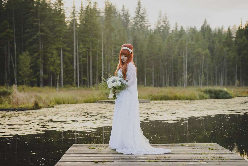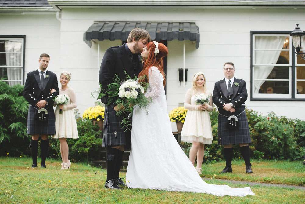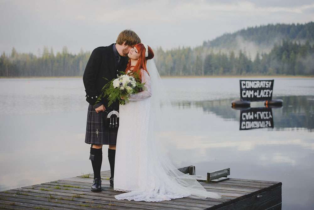 The day was held at Whonnock Lake Centre in Maple Ridge, just outside of Vancouver. “I would call our wedding theme ‘Mystical Mod'”, Lacey-Lee continued. “The moody, enchanted forest backdrop with traditional Scottish styling representing the mystical elements, and the vintage brass décor and sixties styling represented the Mod.”