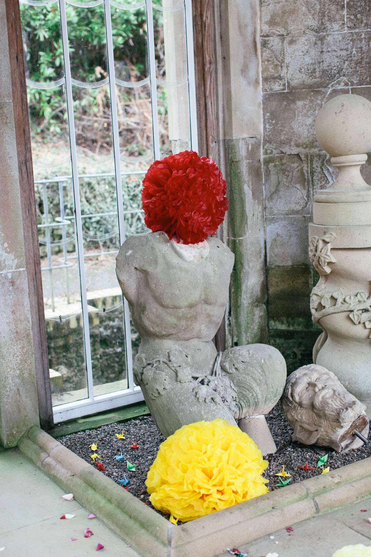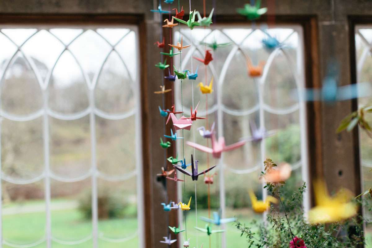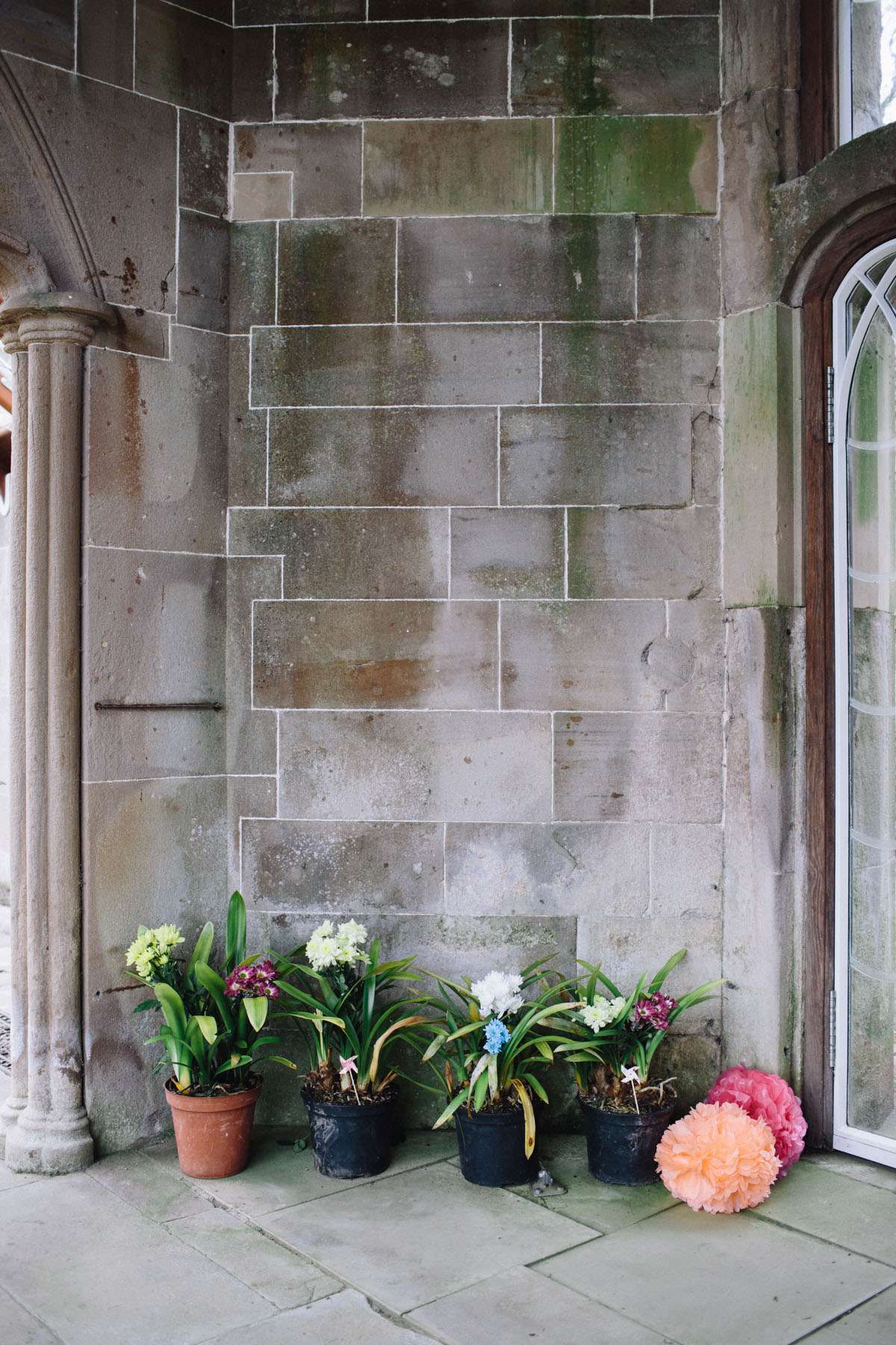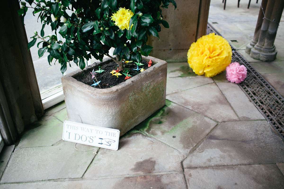 With the venue being so grand, not a whole lot of extra décor was needed, but they did get some flowers from Tesco, paper poms and over 1000 multicoloured cranes (made by the groom’s brother!) to add some extra touches. “I also bought various coloured ribbon from Paperchase which we hung from tree branches and I found a few little signs and wooden decorations which we hung around the place. I bought jars and moss and lights to fill them from Amazon and sat them on the path. Steven’s dad made us a huge wooden frame which our Groomsman Garry hung expertly on a huge branch. We bought lights on Amazon which the boys wrapped around the columns.”