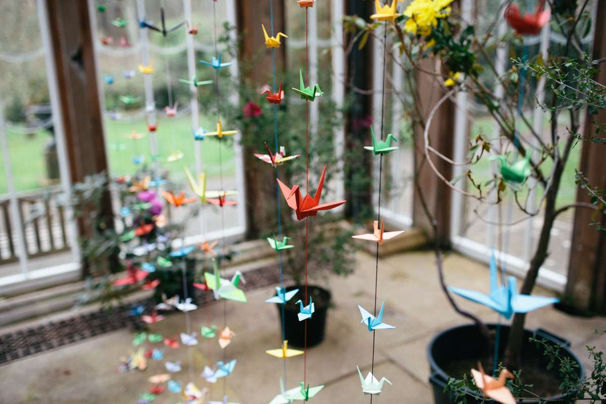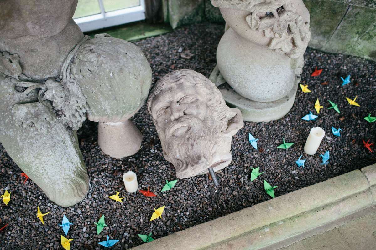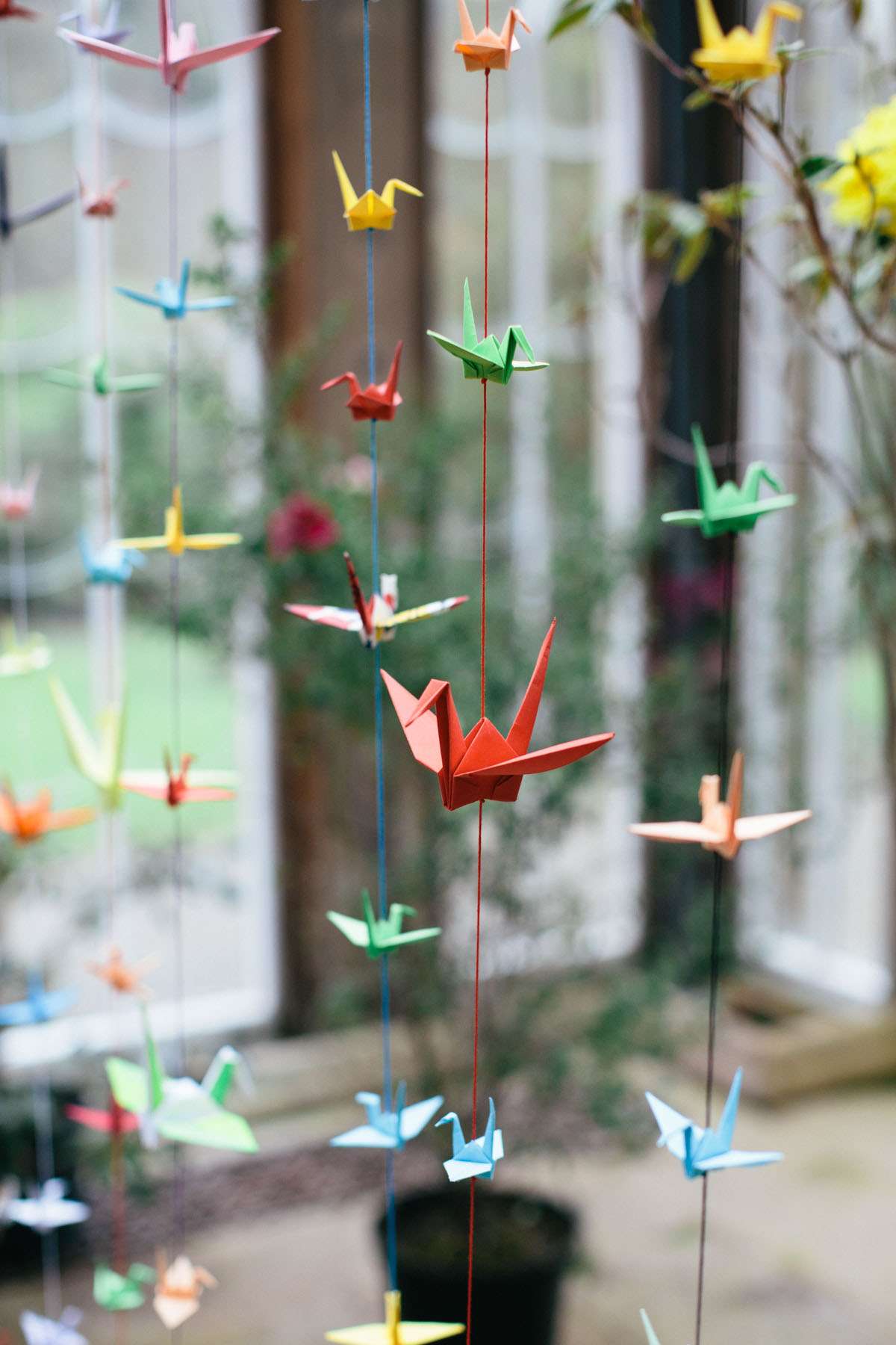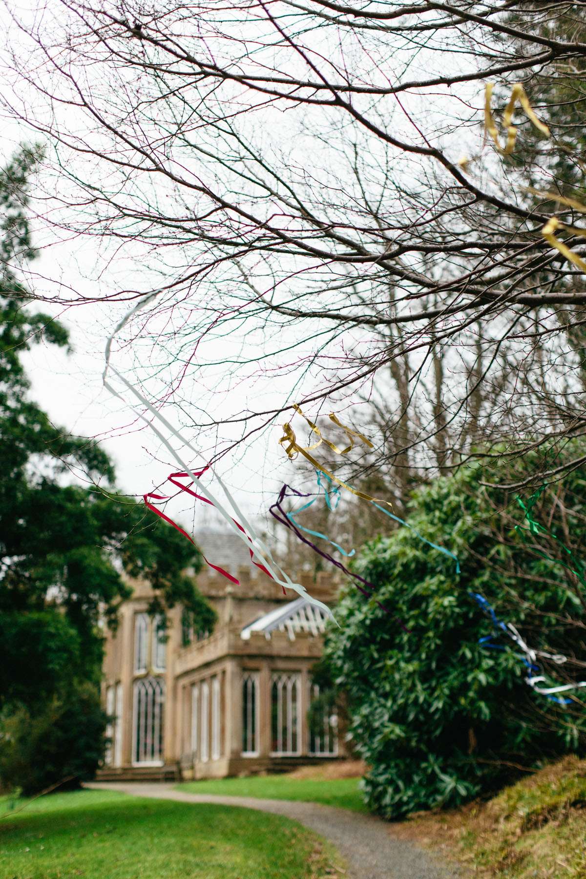 With the venue being so grand, not a whole lot of extra décor was needed, but they did get some flowers from Tesco, paper poms and over 1000 multicoloured cranes (made by the groom’s brother!) to add some extra touches. “I also bought various coloured ribbon from Paperchase which we hung from tree branches and I found a few little signs and wooden decorations which we hung around the place. I bought jars and moss and lights to fill them from Amazon and sat them on the path. Steven’s dad made us a huge wooden frame which our Groomsman Garry hung expertly on a huge branch. We bought lights on Amazon which the boys wrapped around the columns.”