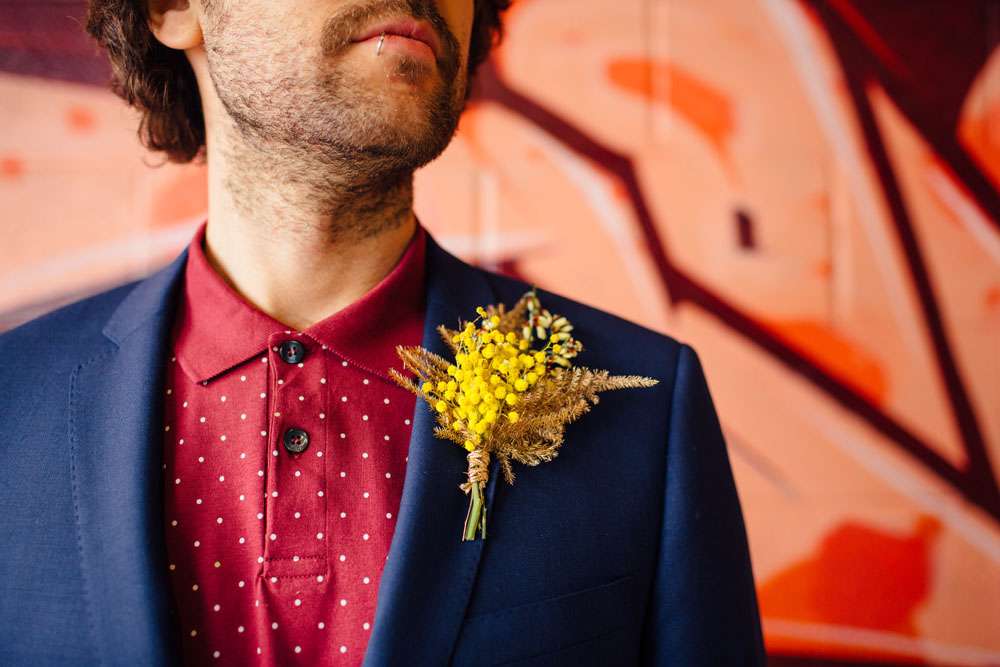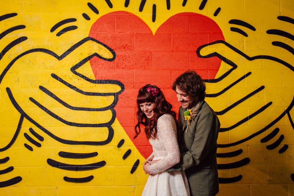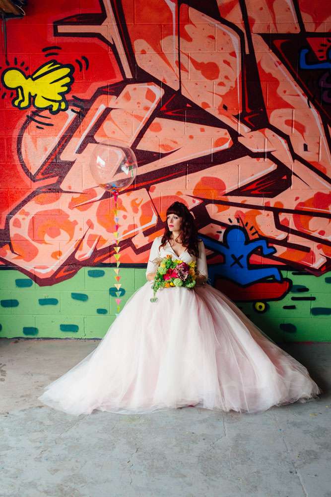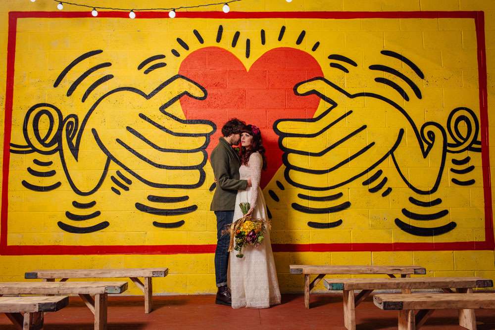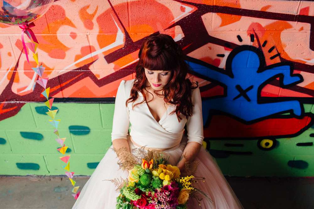 “The shoot took place at The Boiler House in Cardiff”, said Erica, “and it was the perfect backdrop with its Keith Haring inspired graffiti wall art. I was keen to turn the industrial unit into something couples could envisage as a wedding reception space.”