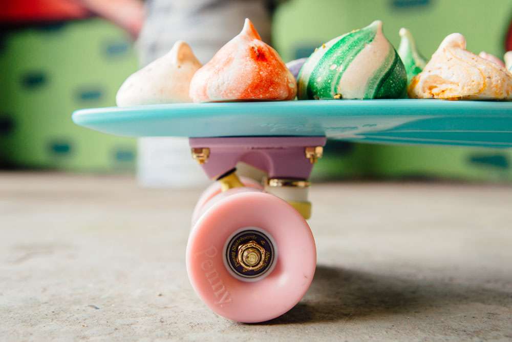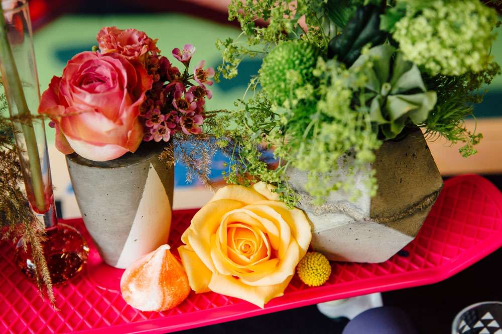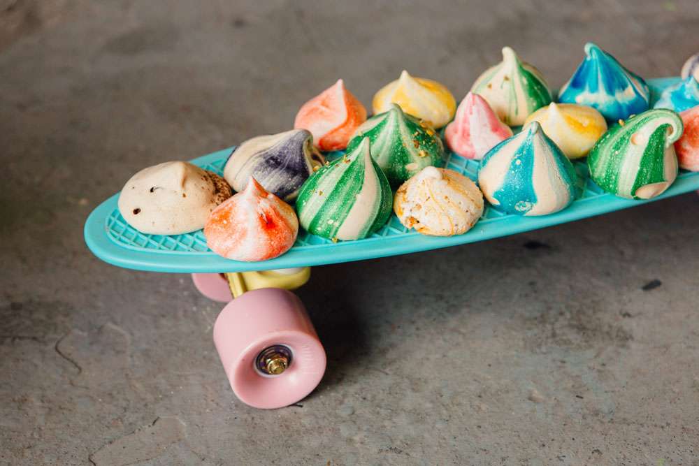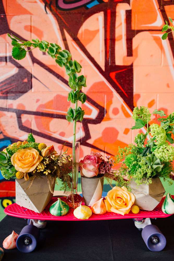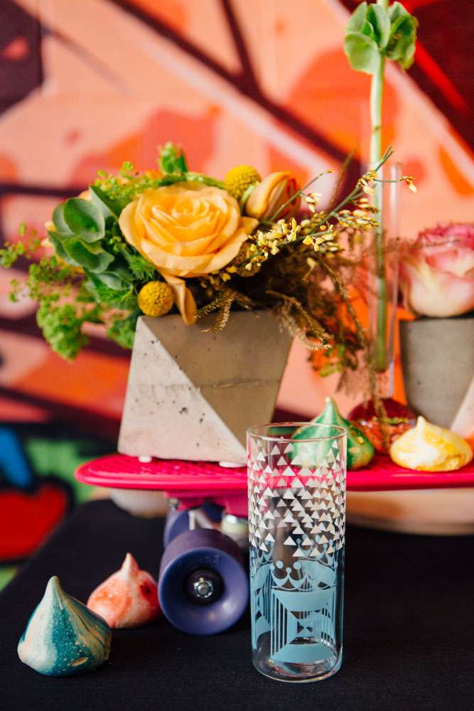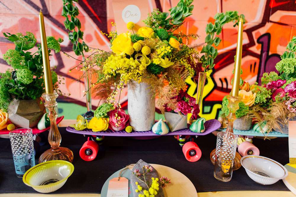 “We filled it with bright, beautiful blooms, paint splattered giant balloons and adorned the tables with skateboards and concrete floral displays. We also used glassware, glitter taped stationery and colourful mini meringues.”