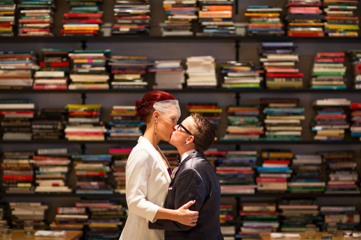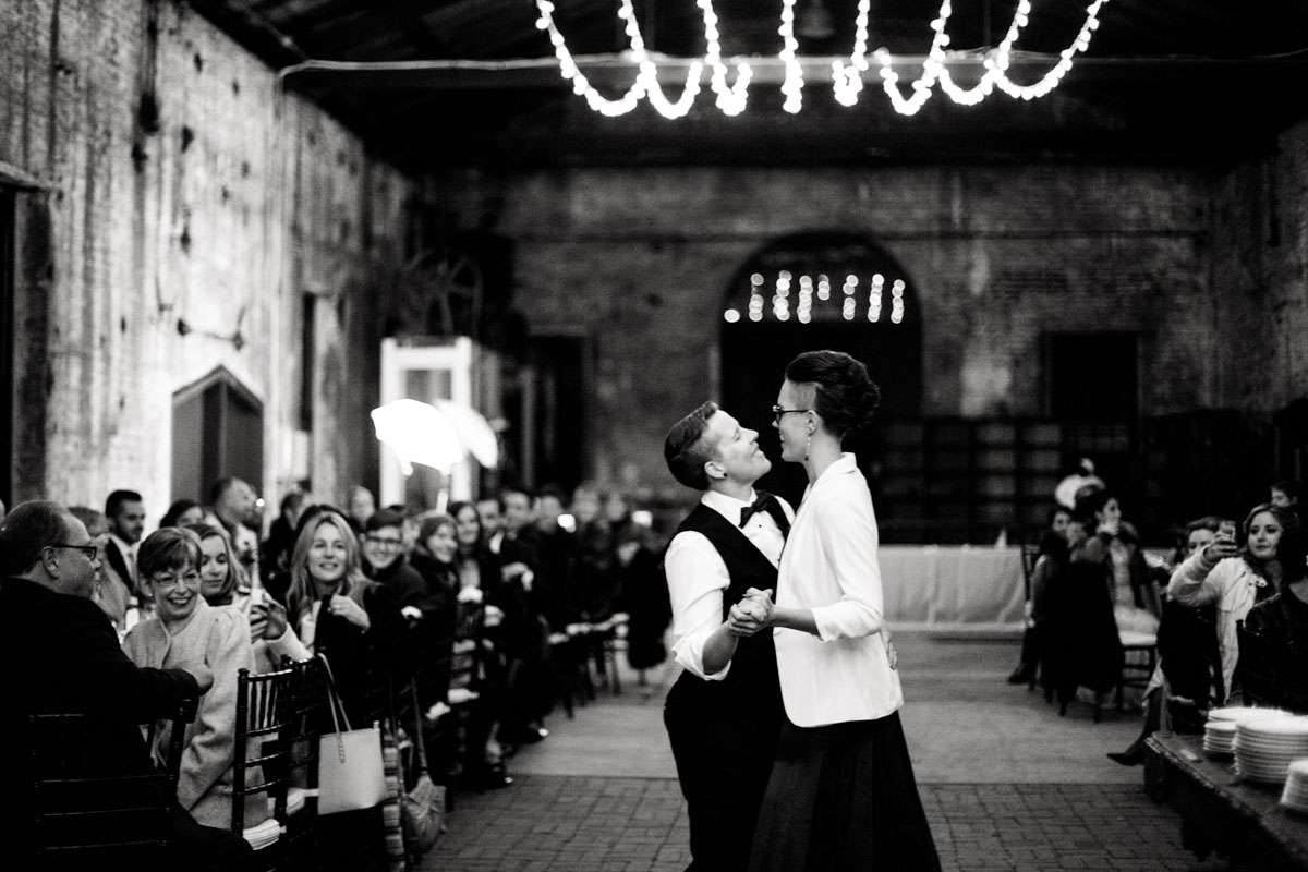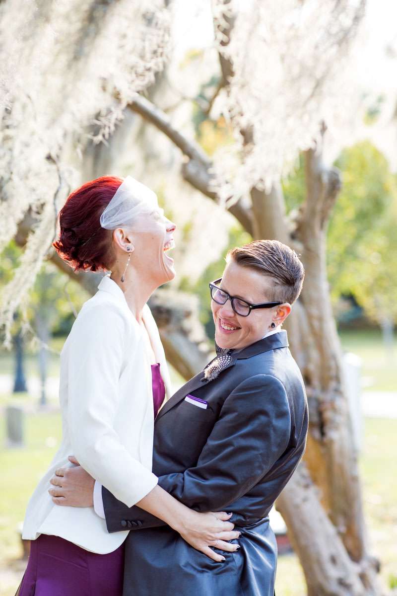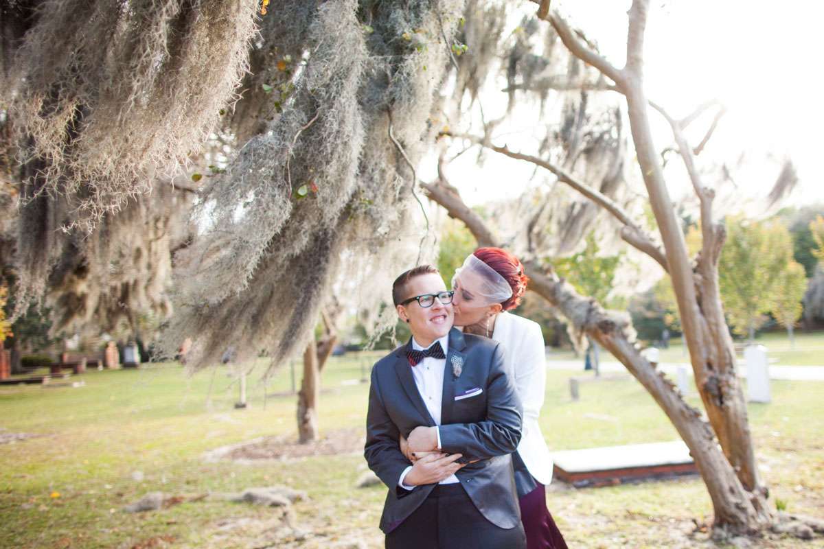 “Our wedding was so full of the love of our friends and family”, they continued. “Since same-sex marriage isn’t legal in Georgia, we asked our dear friend to ‘officiate’ the ceremony. Liz’s niece held our rings during the ceremony and then passed them to our bridal party, each of whom read a line from Louis de Bernières’ Captain Corelli’s Mandolin (“Love is temporary madness…”) as they warmed our rings and passed them up to us. Since we’re not religious, we had our officiant recite a poem during our ring exchange. We wanted our parents to be involved, but knew that after two years of living together no one was ‘giving us away’ so we had our parents walk us two separate aisles at the same time, we hugged them, and then we walked the rest of the way ourselves, meeting in the middle and walking to the altar holding hands.”