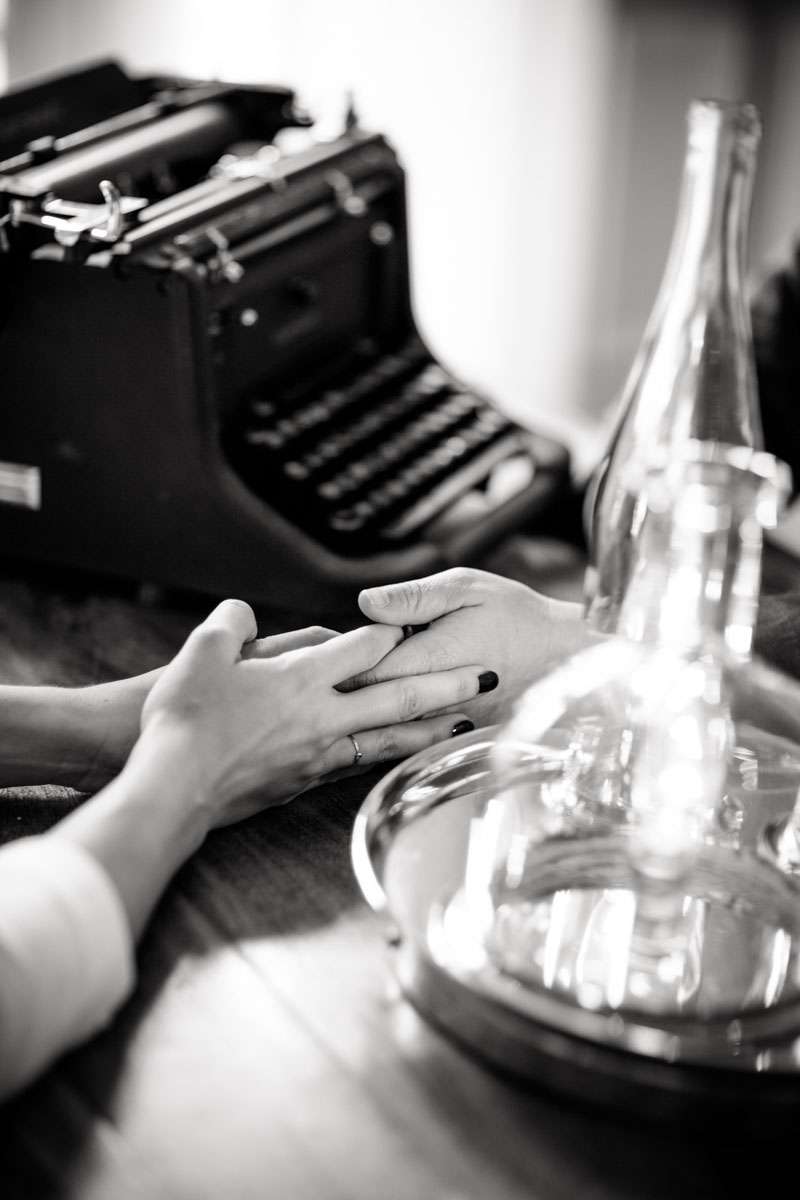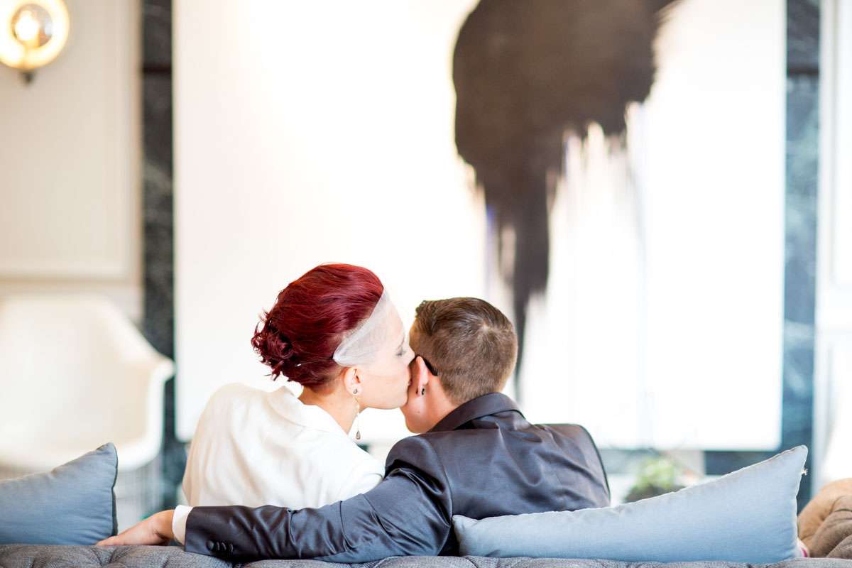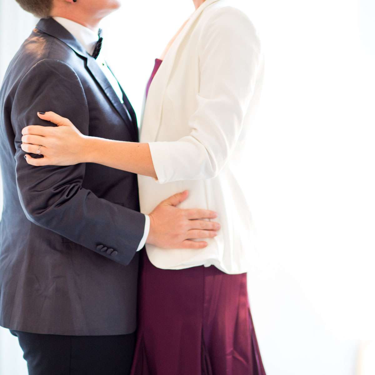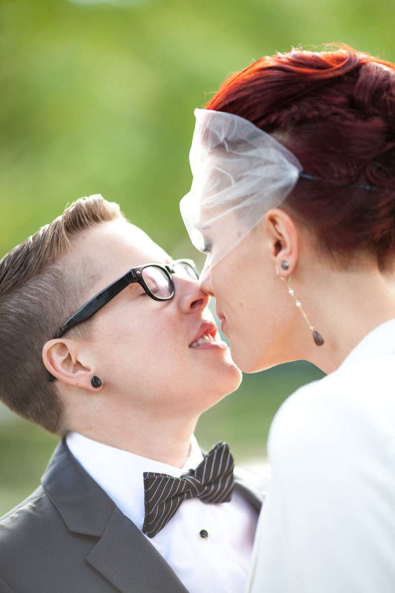 “Our wedding was so full of the love of our friends and family”, they continued. “Since same-sex marriage isn’t legal in Georgia, we asked our dear friend to ‘officiate’ the ceremony. Liz’s niece held our rings during the ceremony and then passed them to our bridal party, each of whom read a line from Louis de Bernières’ Captain Corelli’s Mandolin (“Love is temporary madness…”) as they warmed our rings and passed them up to us. Since we’re not religious, we had our officiant recite a poem during our ring exchange. We wanted our parents to be involved, but knew that after two years of living together no one was ‘giving us away’ so we had our parents walk us two separate aisles at the same time, we hugged them, and then we walked the rest of the way ourselves, meeting in the middle and walking to the altar holding hands.”