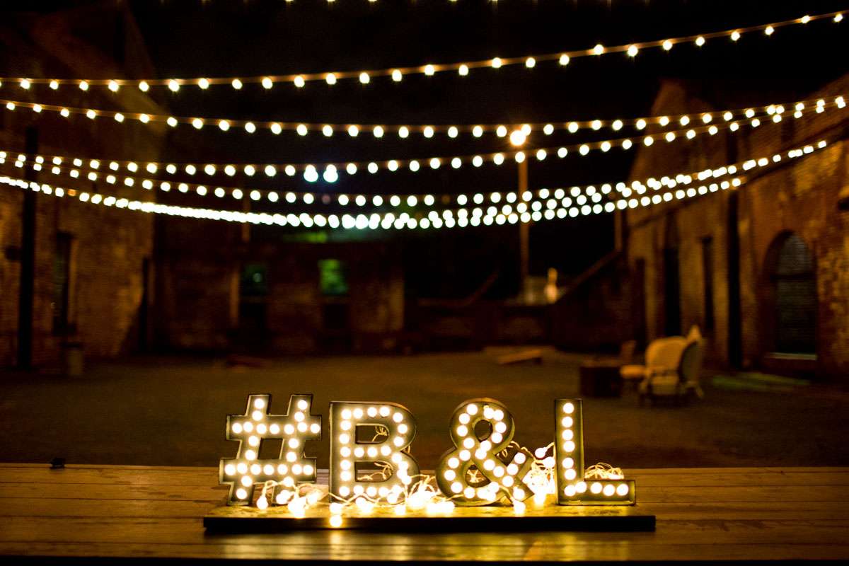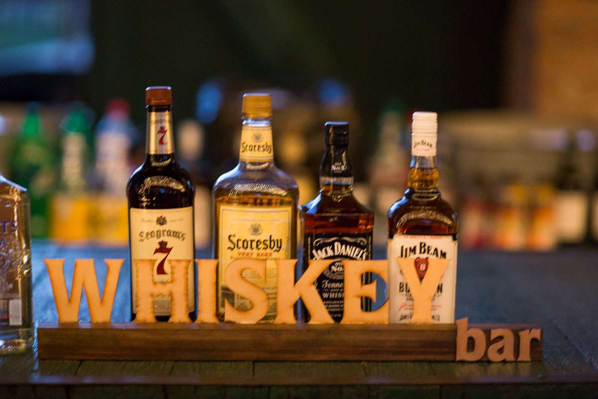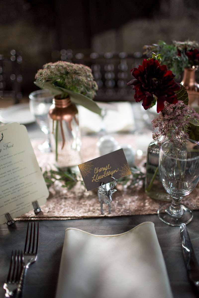 Liz was a master DIYer and made as much as she could for the reception. “I made the lawn games for cocktail hour, including ladder golf and corn hole boards. I went to Home Depot and cut raw lumber pieces exactly to measurement and then screwed, nailed, and glued them all together. I also customised the corn hole bags with L and B for each team. My other major project was creating all of the signage for the wedding, including a #L&B marquee, a whiskey bar sign, a ‘treat-yo-self’ sign for the dessert table, and signs for the ceremony and reception seating. I also customised the bottles and vases for the tables with a spray paint drip and turned miniature plastic woodland creatures into place card holders for the guests. Bethany created the bar menus (with descriptions of our custom wedding cocktails), the photo booth sign, the DJ song request cards and the guestbook sign.”