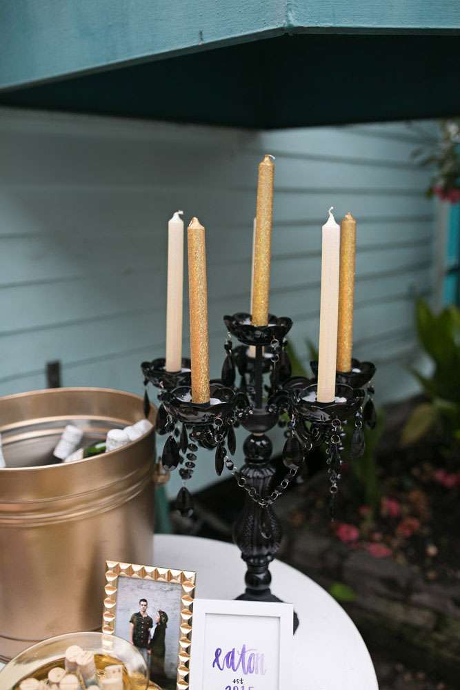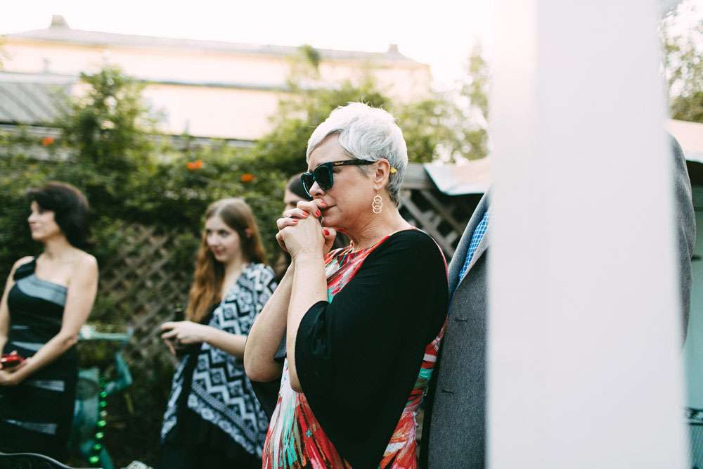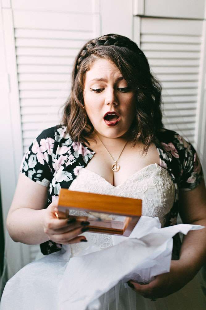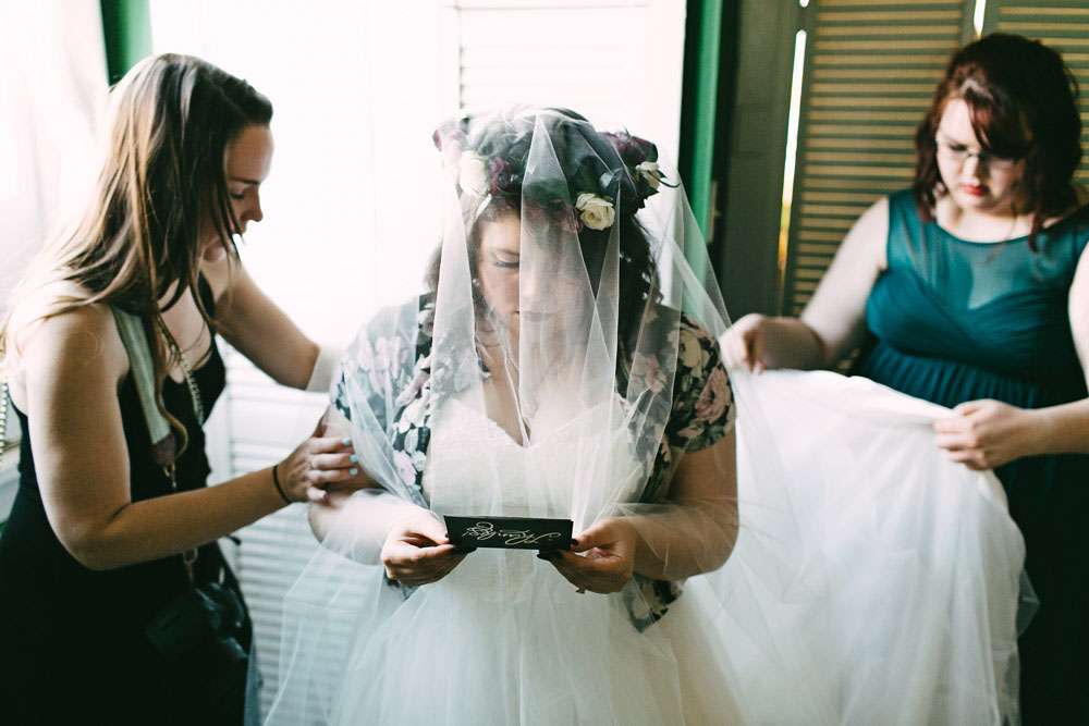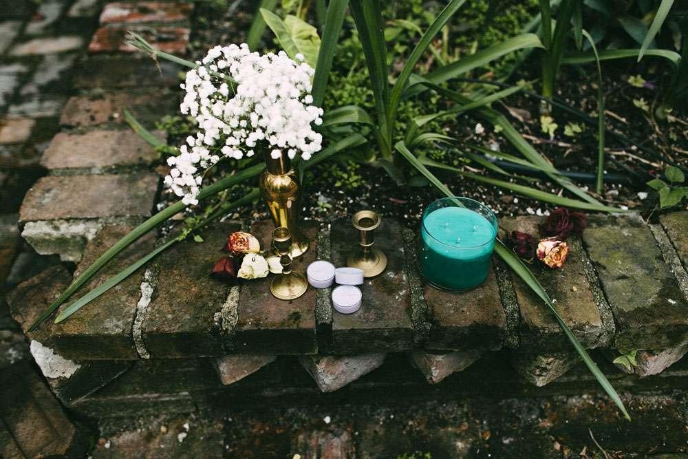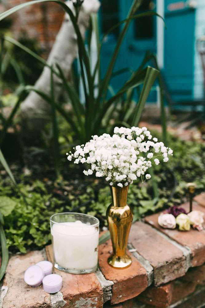 “The entire wedding was DIY”, she continued. “Thanks to this we were able to invest in the important things (such as food, the brass band and our photographer) while still achieving the beautifully cluttered ceremony I dreamed of. We had lots of brass candle sticks, candles and dried flowers. I also carried a dried flower bouquet, just like my mother had when she got married. Instead of a typical reception, we had a FANTASTIC dinner at Vacherie and then went bar hopping (because we’re classy folks).”