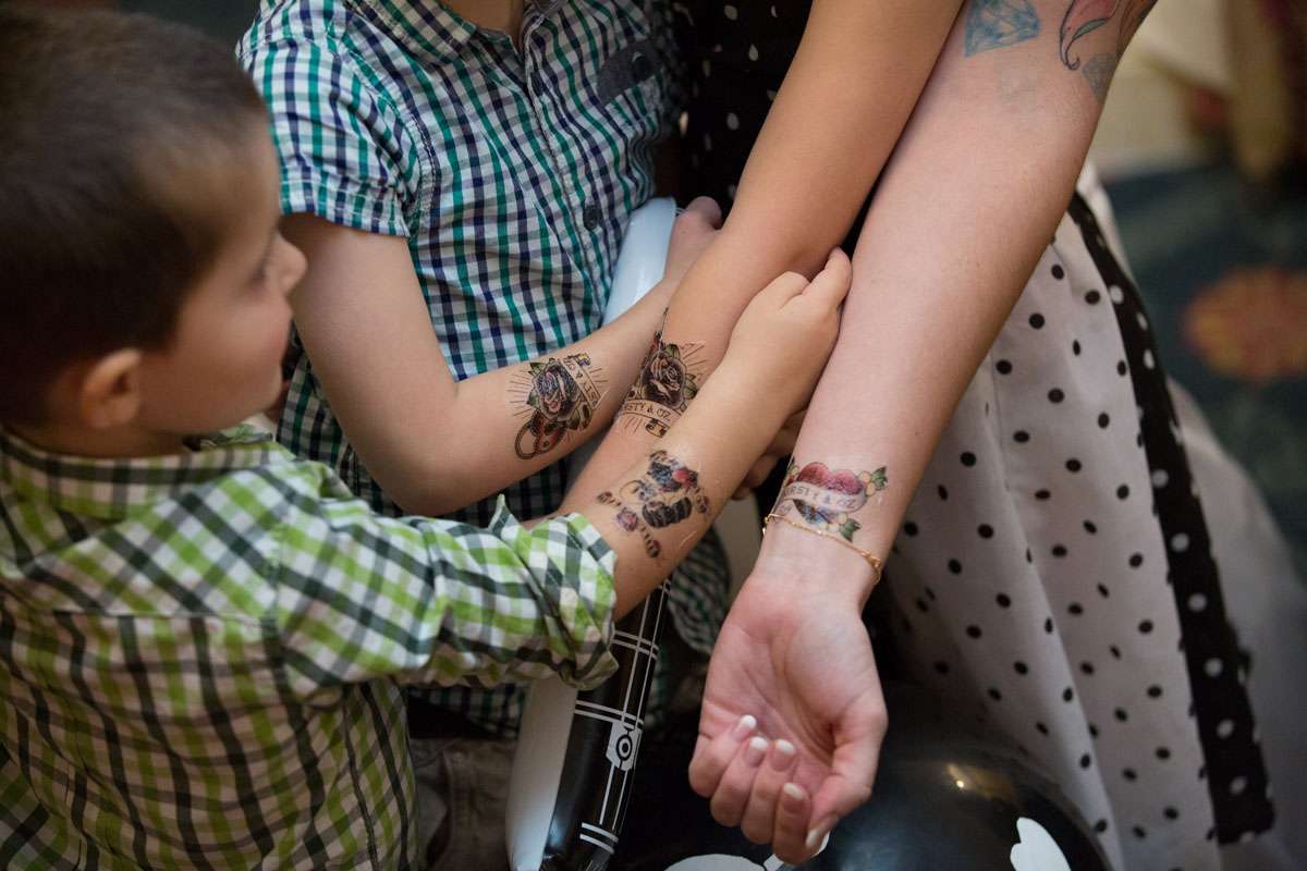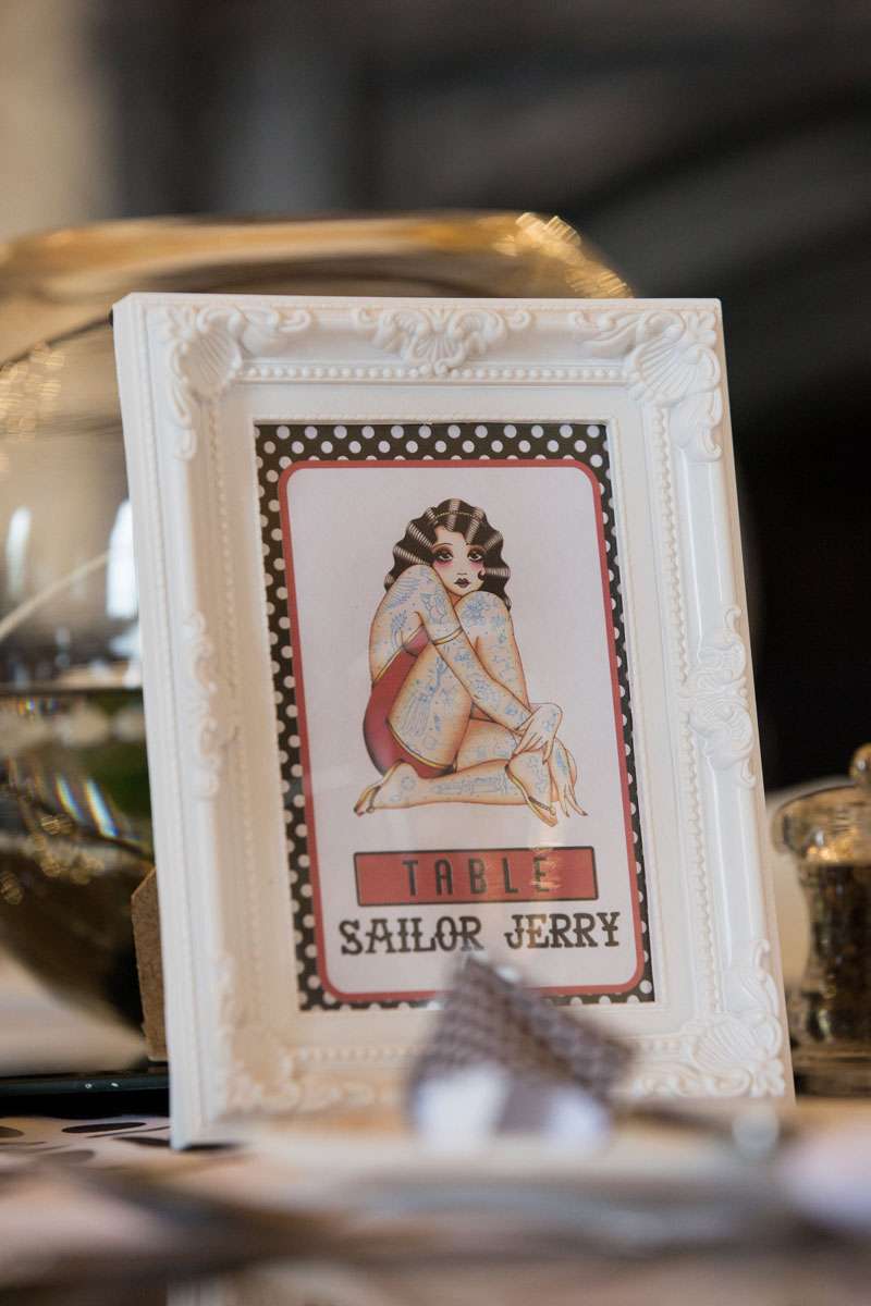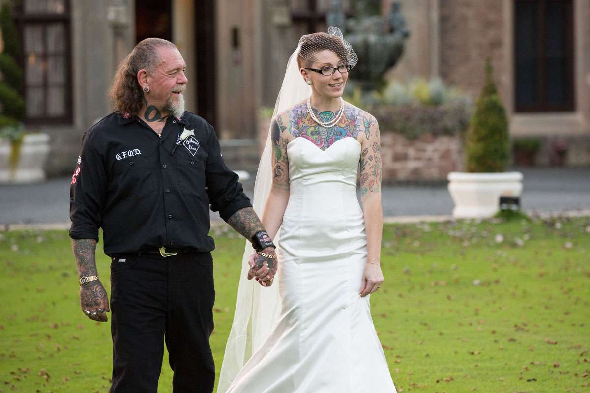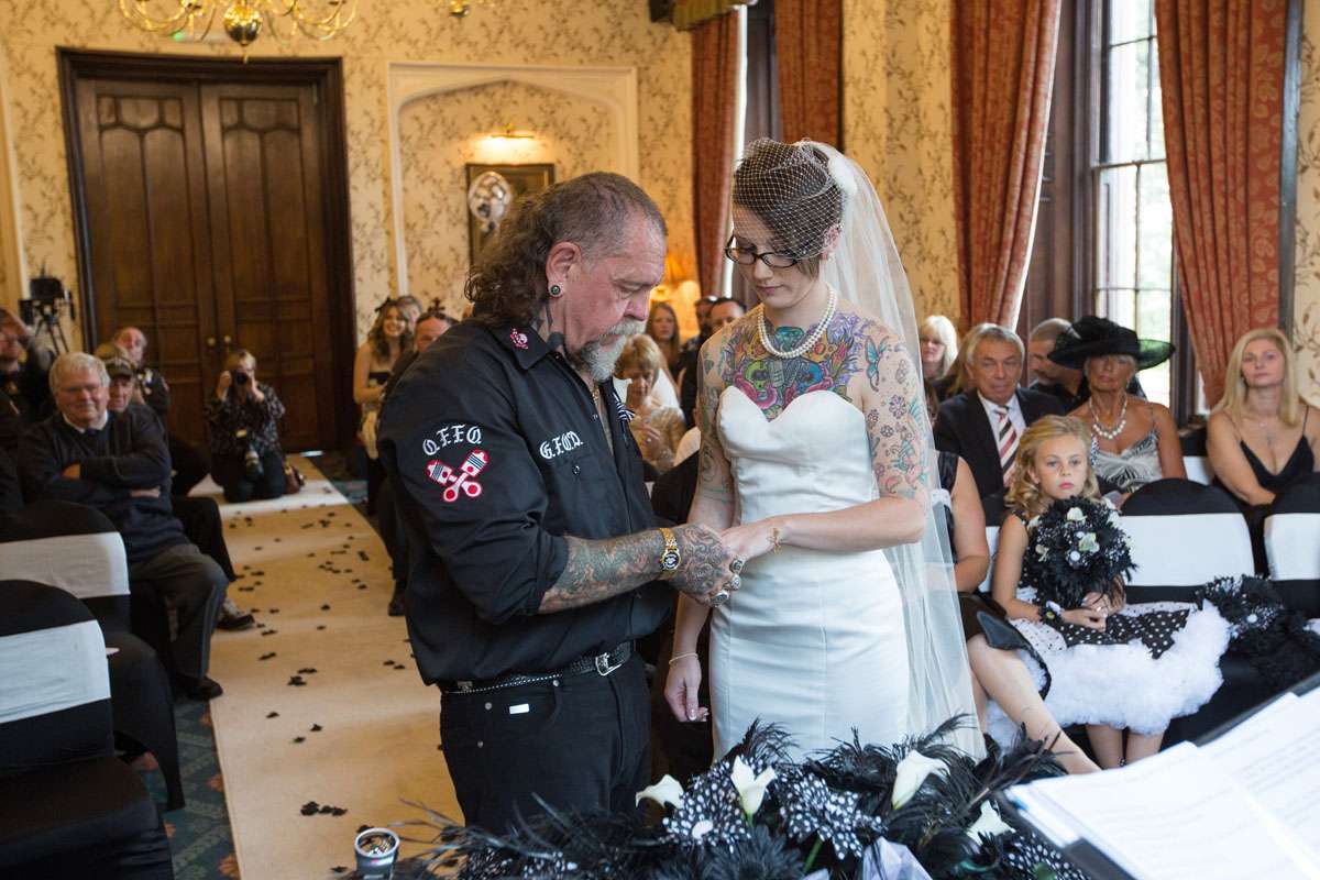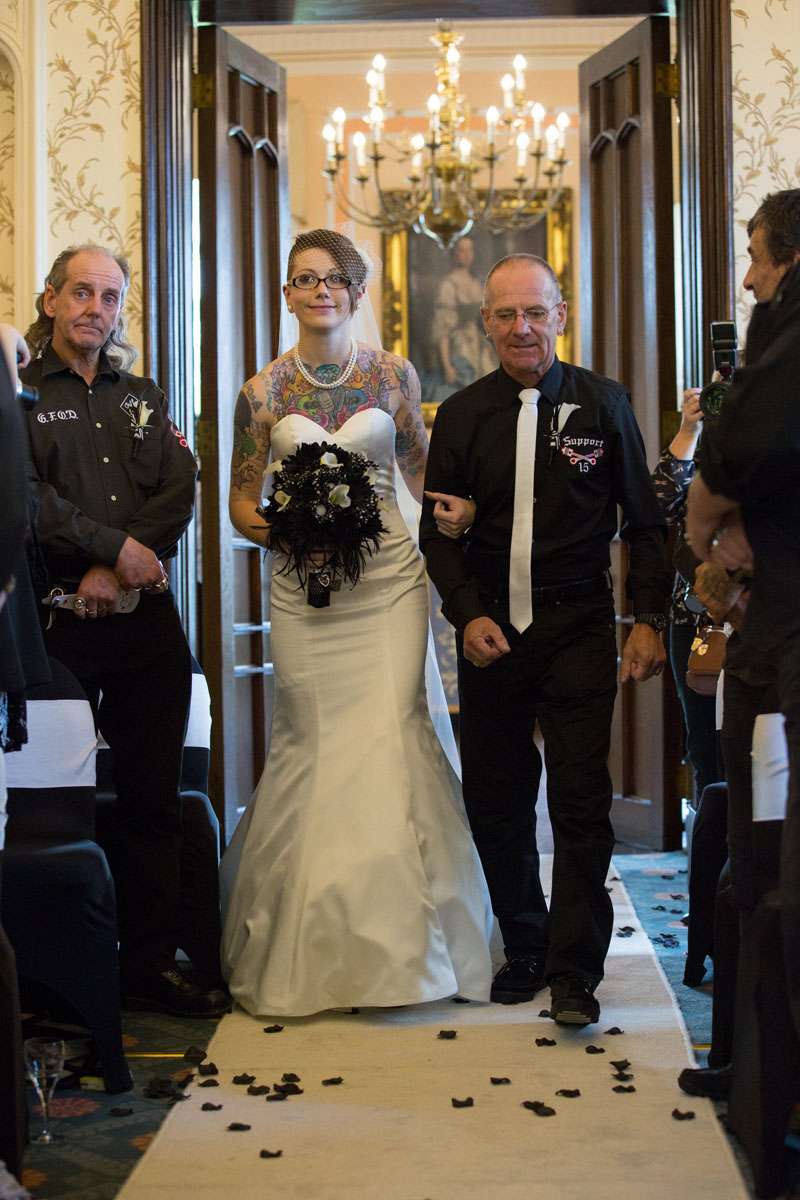 The wedding was held at Rowton Castle in Shropshire. “Our main inspiration was tattoos”, she continued, “since that’s how we met and is such a huge part of both our lives. Oz’s motorcycle club colours are black and white so those are the colours that we chose to go with and I love polka dots so we threw that in there as well. We also chose to go with a vintage, rockabilly style, which goes hand in hand with the tattooing and polka dots. Everything right down to the wedding favours, which were the temporary tattoos, screamed ‘us’. People were blown away with the attention to detail.”
