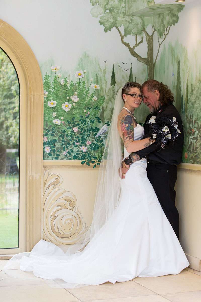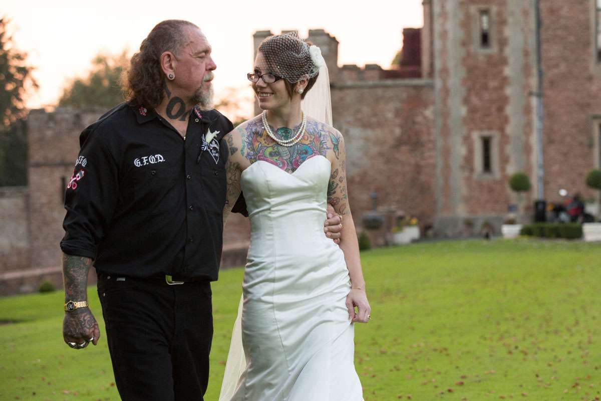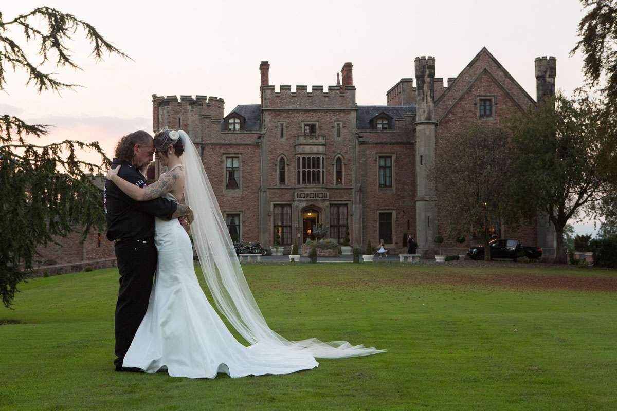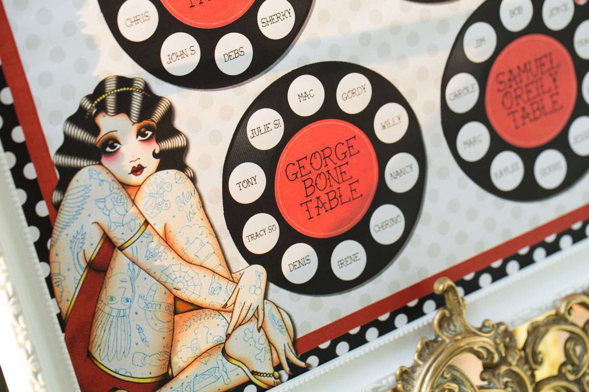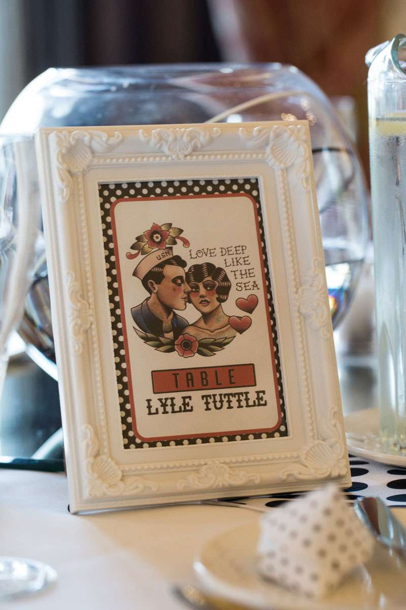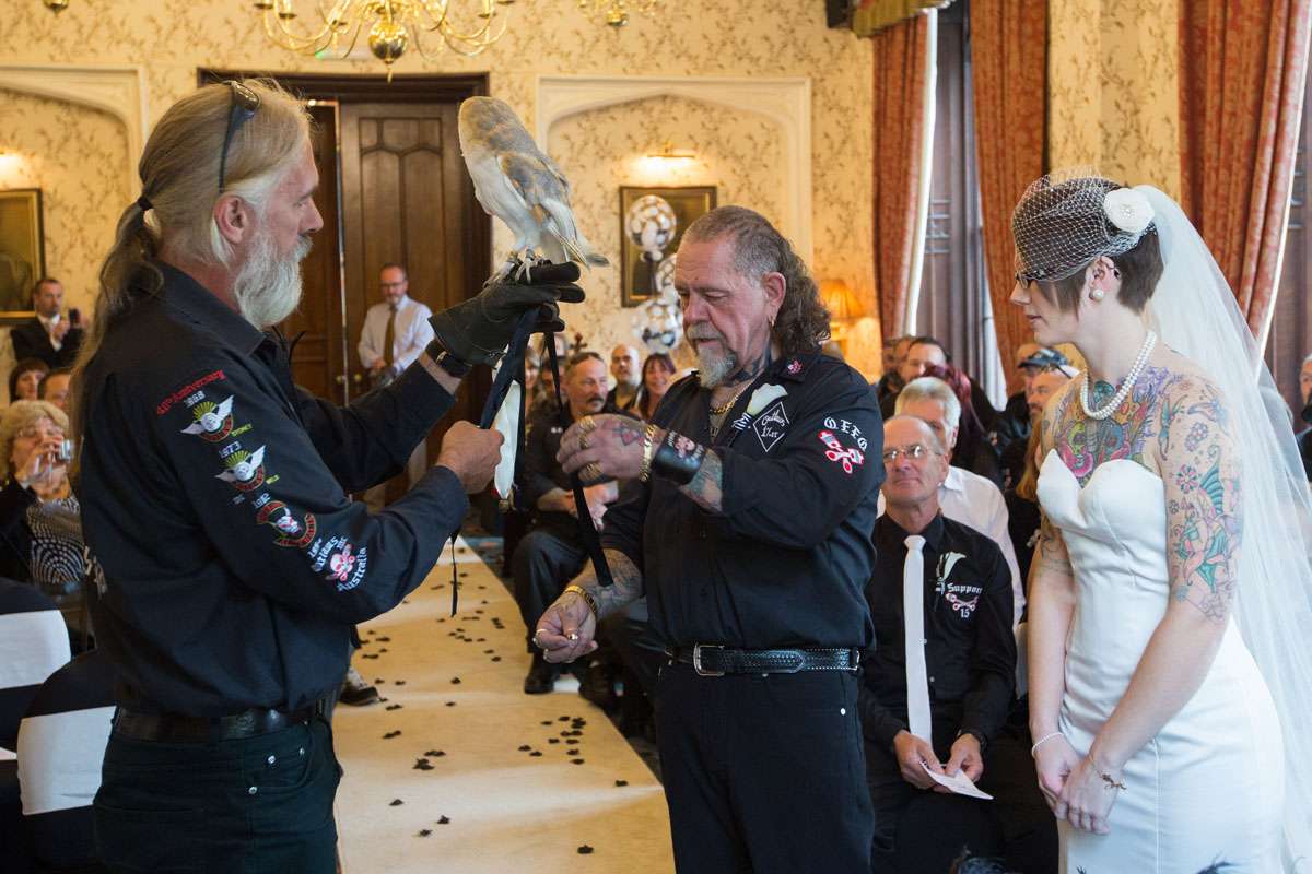 The wedding was held at Rowton Castle in Shropshire. “Our main inspiration was tattoos”, she continued, “since that’s how we met and is such a huge part of both our lives. Oz’s motorcycle club colours are black and white so those are the colours that we chose to go with and I love polka dots so we threw that in there as well. We also chose to go with a vintage, rockabilly style, which goes hand in hand with the tattooing and polka dots. Everything right down to the wedding favours, which were the temporary tattoos, screamed ‘us’. People were blown away with the attention to detail.”