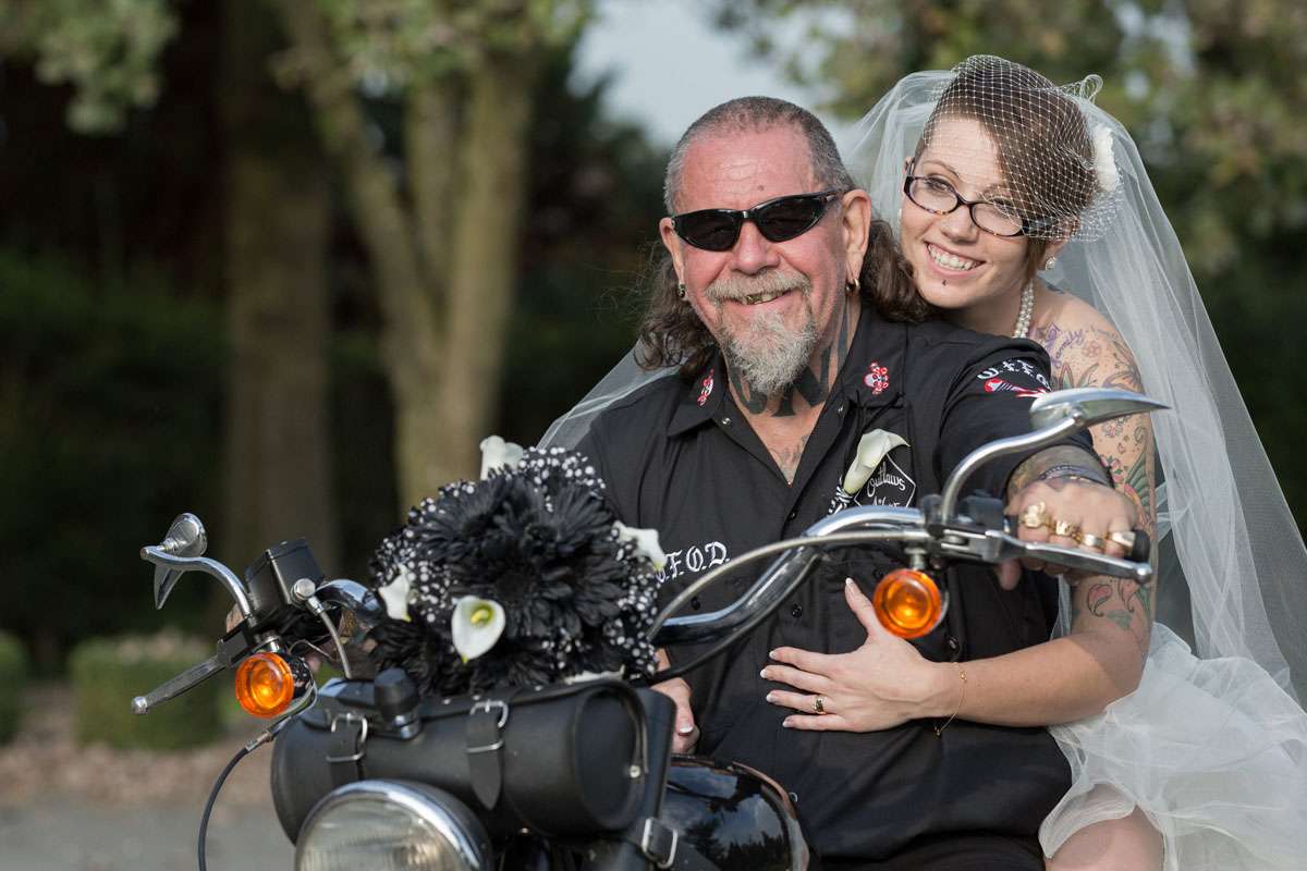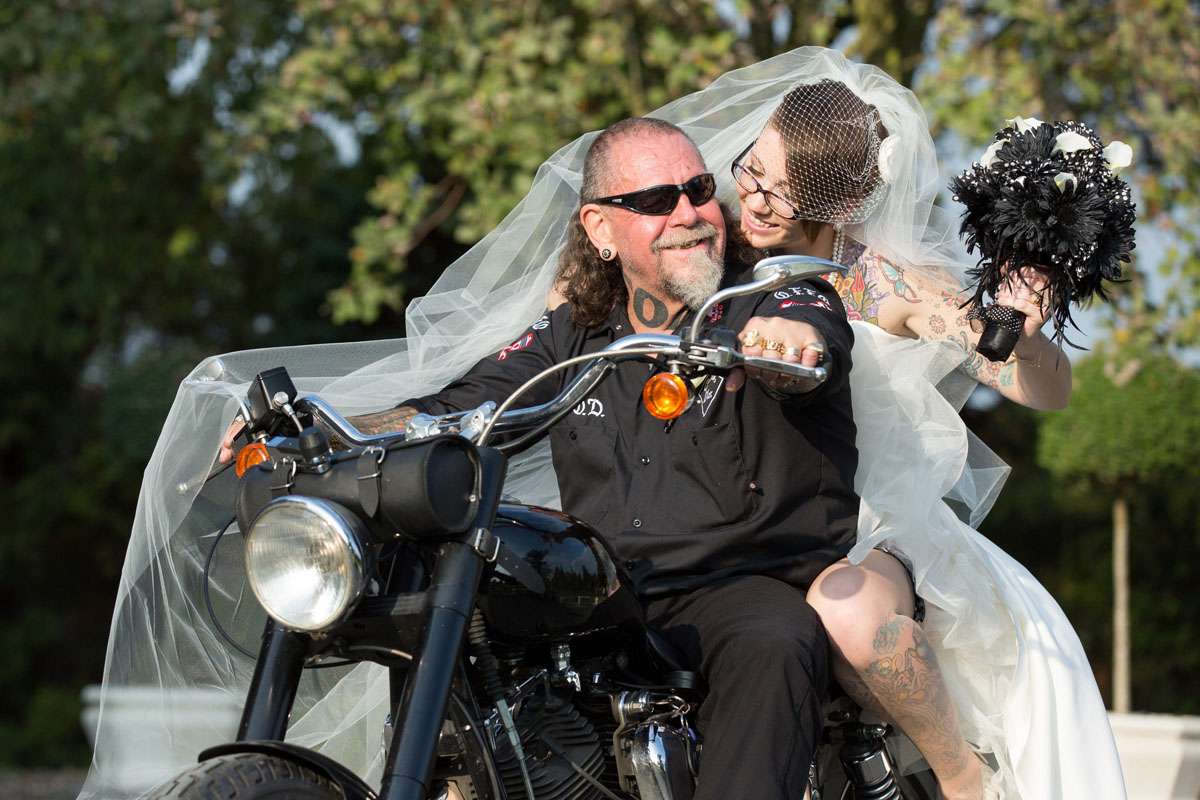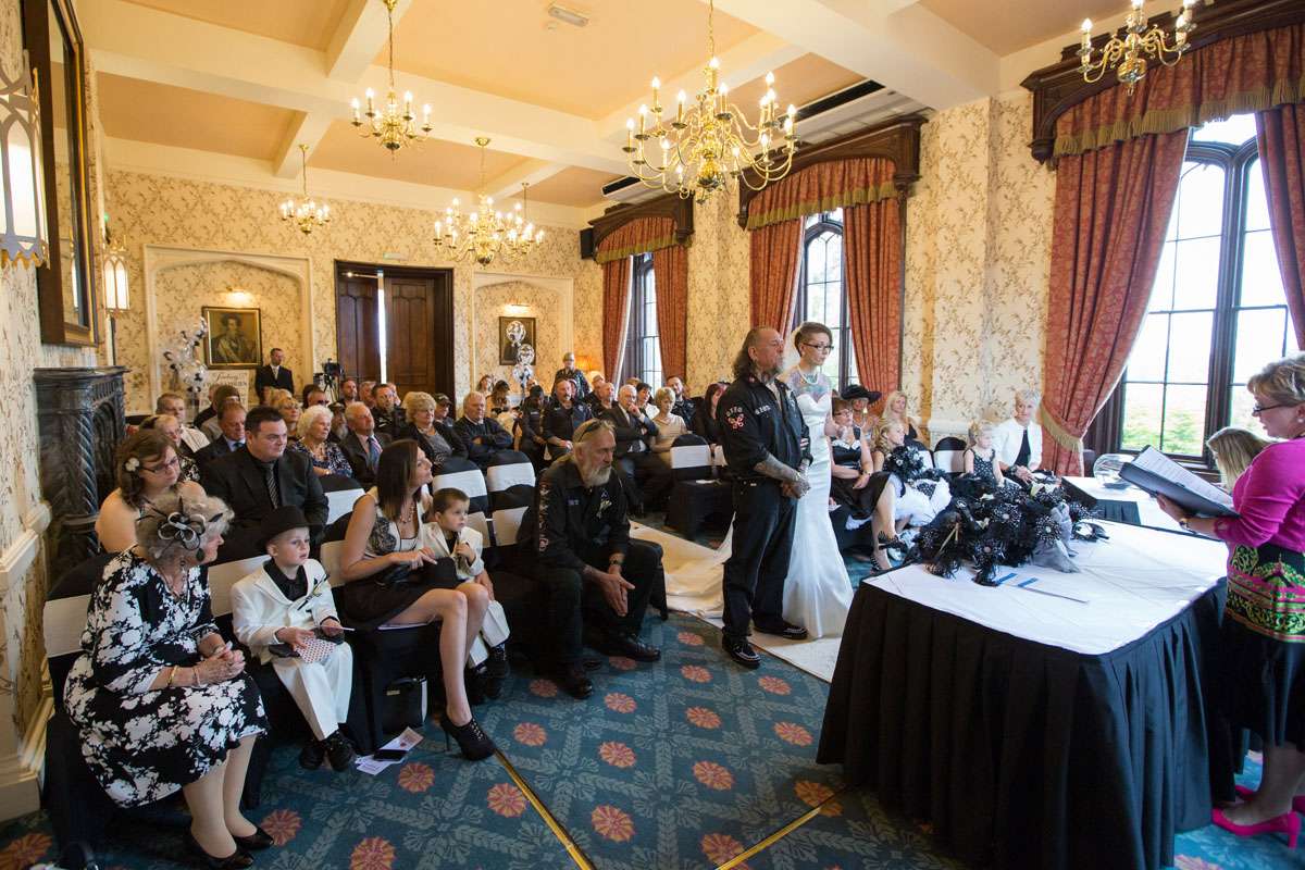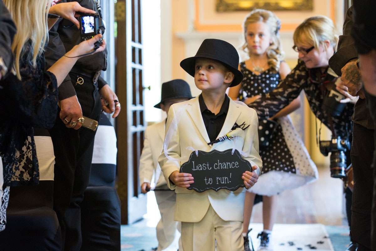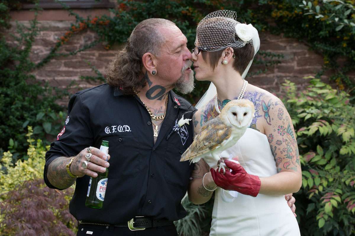 The wedding was held at Rowton Castle in Shropshire. “Our main inspiration was tattoos”, she continued, “since that’s how we met and is such a huge part of both our lives. Oz’s motorcycle club colours are black and white so those are the colours that we chose to go with and I love polka dots so we threw that in there as well. We also chose to go with a vintage, rockabilly style, which goes hand in hand with the tattooing and polka dots. Everything right down to the wedding favours, which were the temporary tattoos, screamed ‘us’. People were blown away with the attention to detail.”