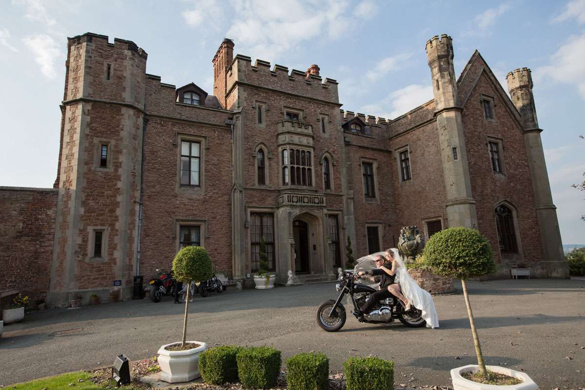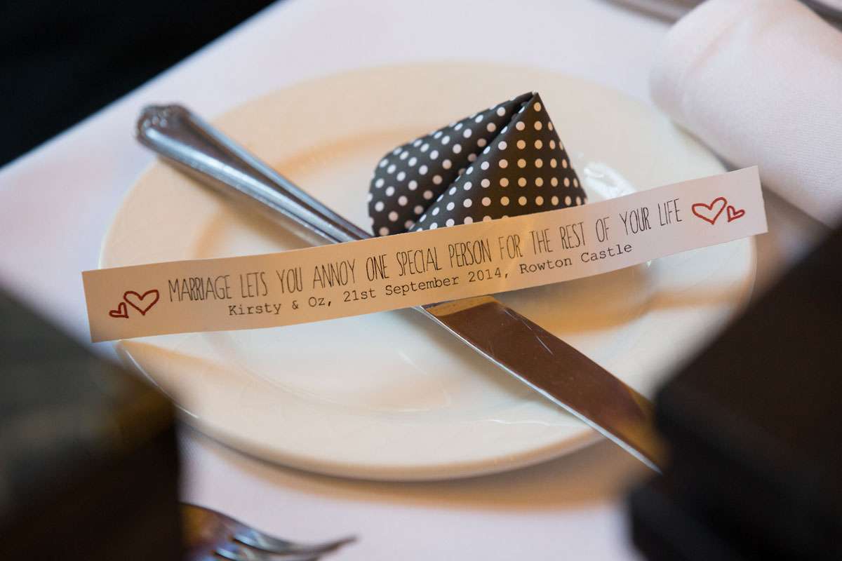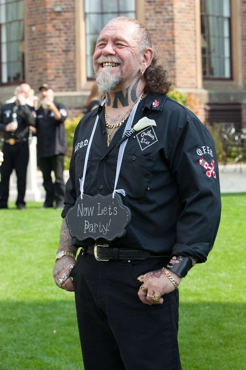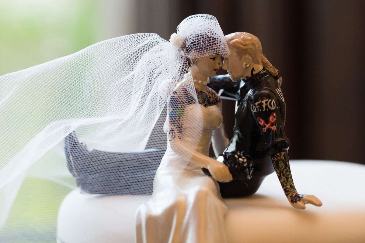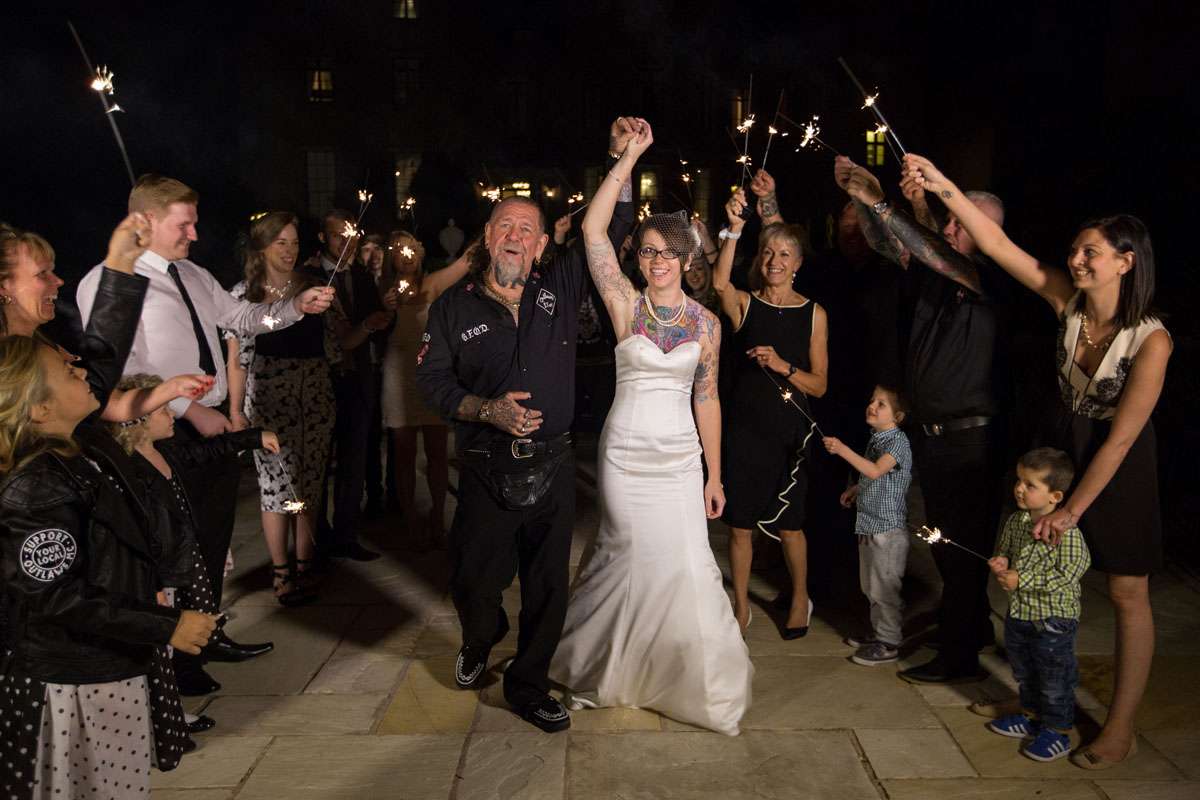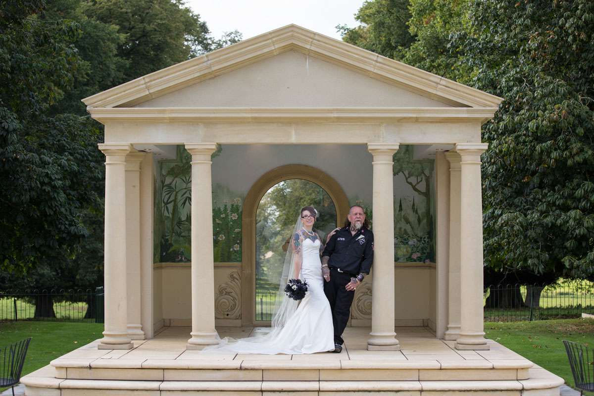 The wedding was held at Rowton Castle in Shropshire. “Our main inspiration was tattoos”, she continued, “since that’s how we met and is such a huge part of both our lives. Oz’s motorcycle club colours are black and white so those are the colours that we chose to go with and I love polka dots so we threw that in there as well. We also chose to go with a vintage, rockabilly style, which goes hand in hand with the tattooing and polka dots. Everything right down to the wedding favours, which were the temporary tattoos, screamed ‘us’. People were blown away with the attention to detail.”