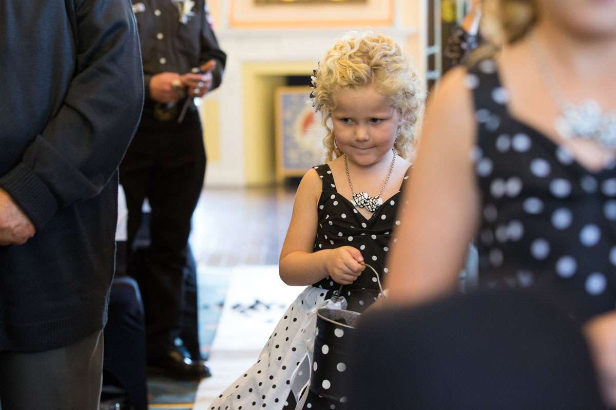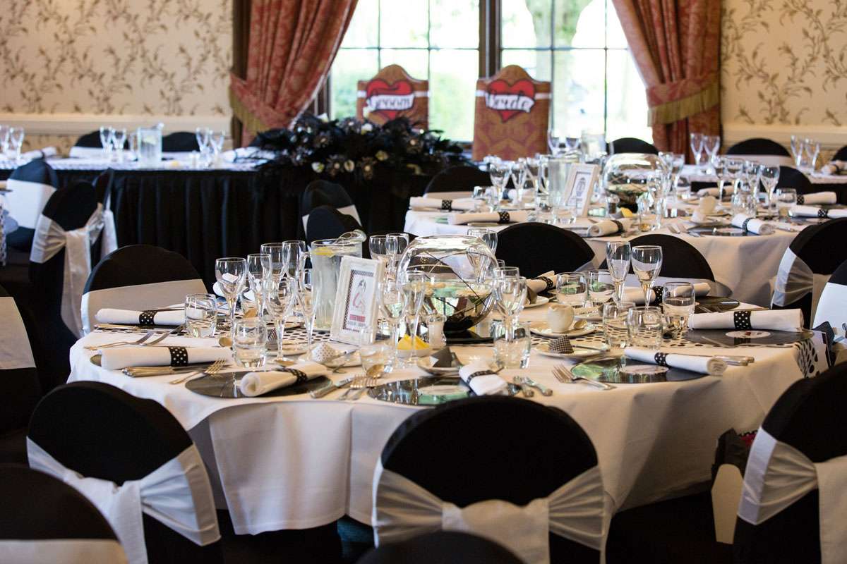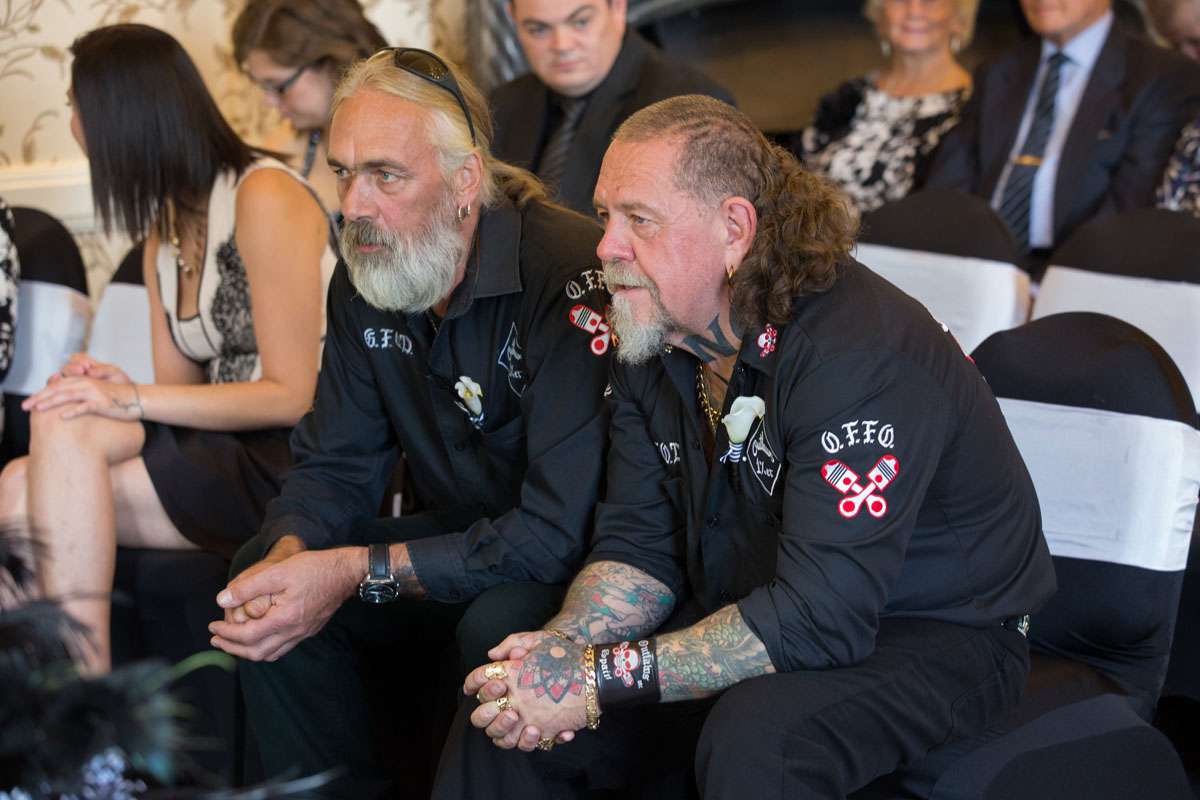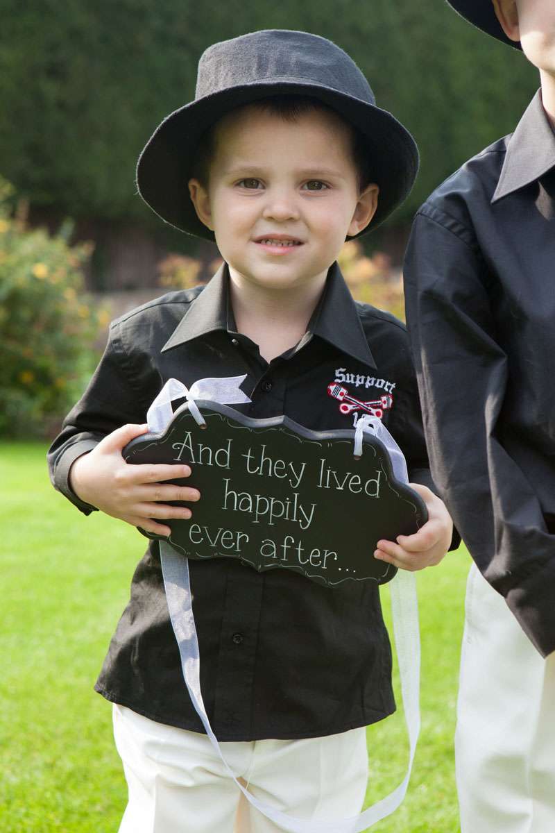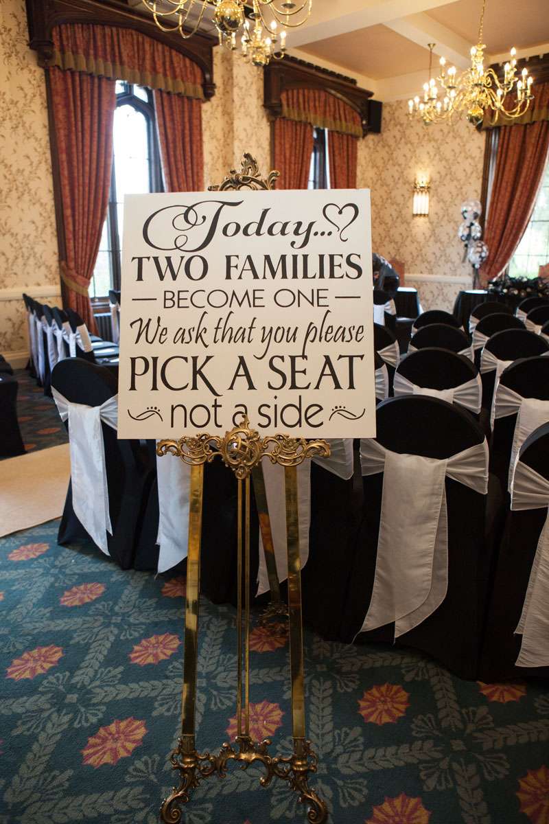 The wedding was held at Rowton Castle in Shropshire. “Our main inspiration was tattoos”, she continued, “since that’s how we met and is such a huge part of both our lives. Oz’s motorcycle club colours are black and white so those are the colours that we chose to go with and I love polka dots so we threw that in there as well. We also chose to go with a vintage, rockabilly style, which goes hand in hand with the tattooing and polka dots. Everything right down to the wedding favours, which were the temporary tattoos, screamed ‘us’. People were blown away with the attention to detail.”