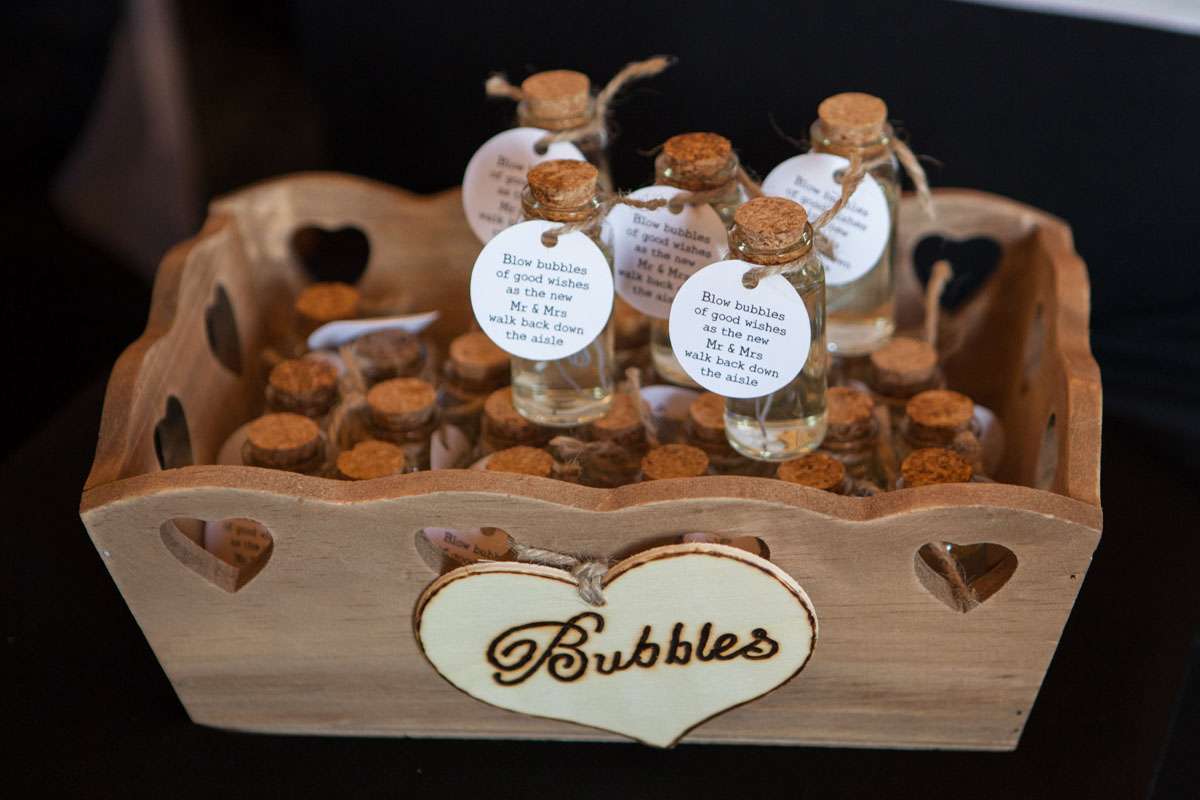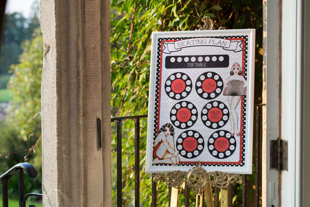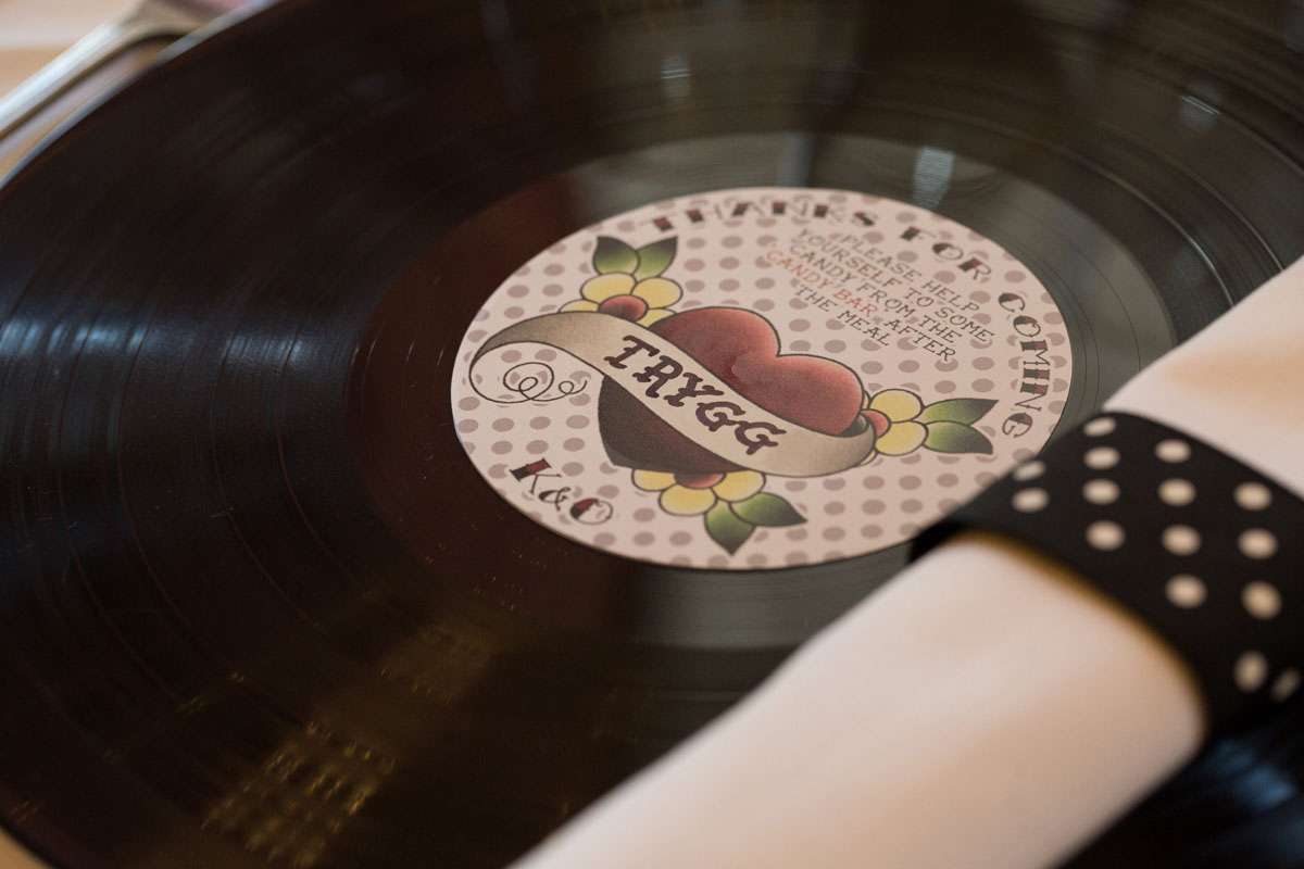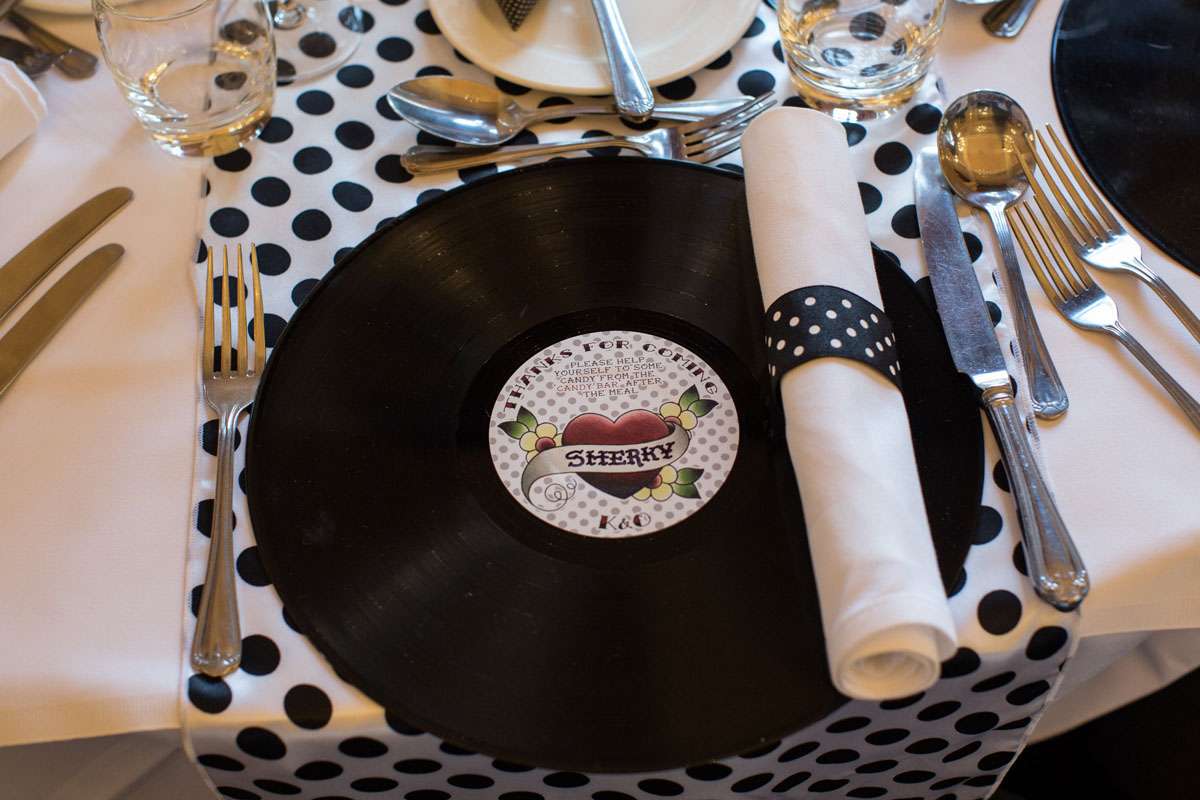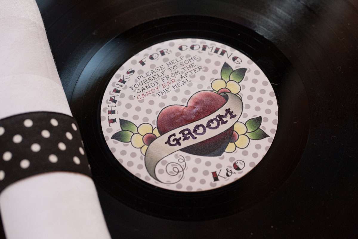 “The DIY we did included the seating chart, the wedding bubbles, place cards, sparklers, candy buffet and the invitations. The place cards were actually vinyl records. I bought a load of old LPs off eBay, designed a new label to go on the centre of them, had them printed and then stuck them over the existing label. I left a space on the label design to write each guests name on. They went down a treat. Everybody took their place-mat home as a bit of a memento.”