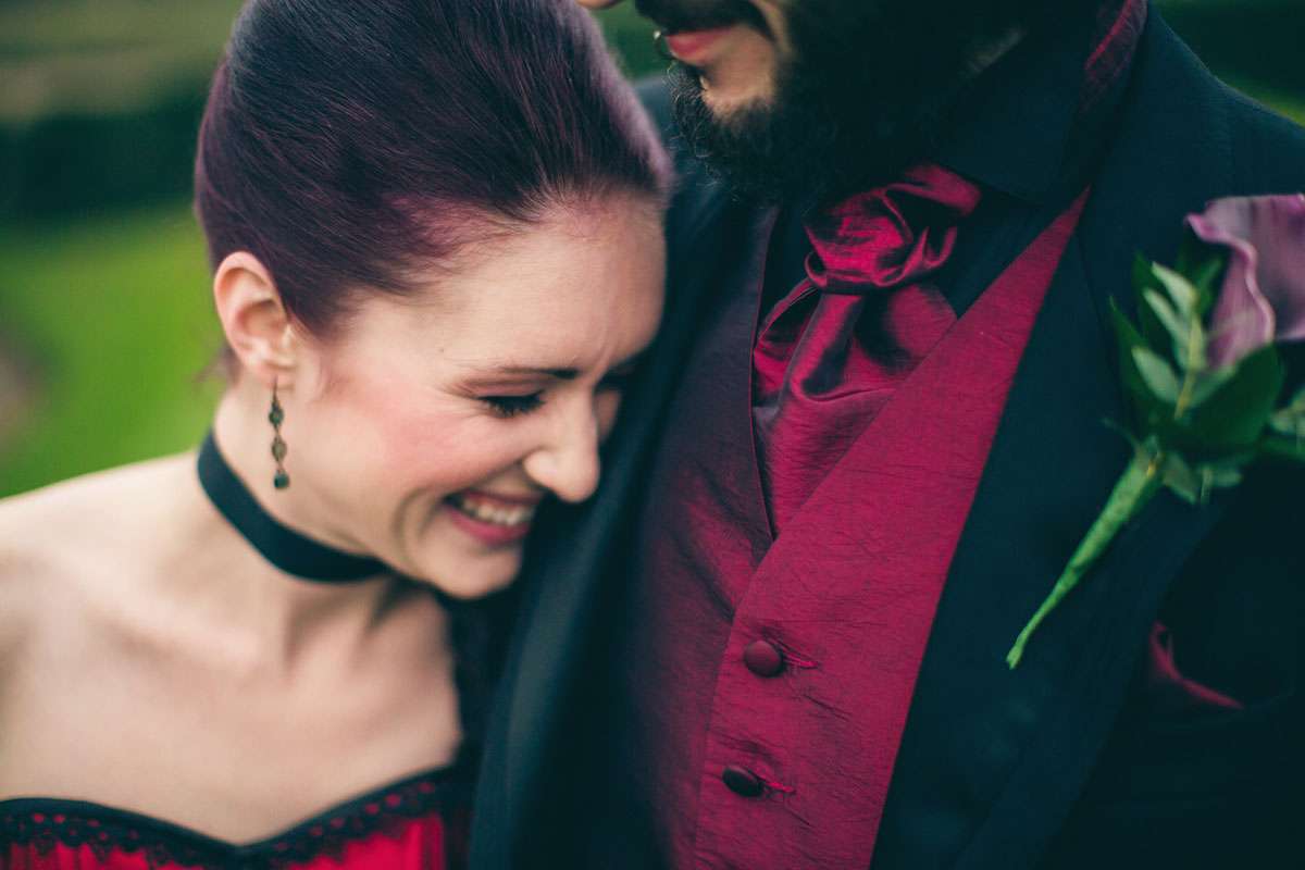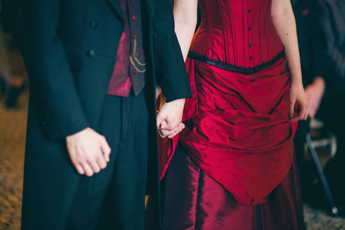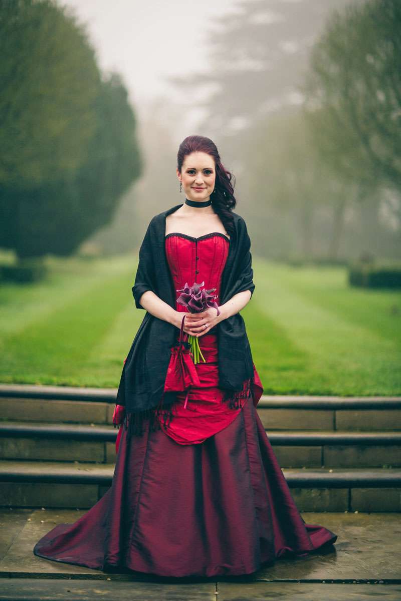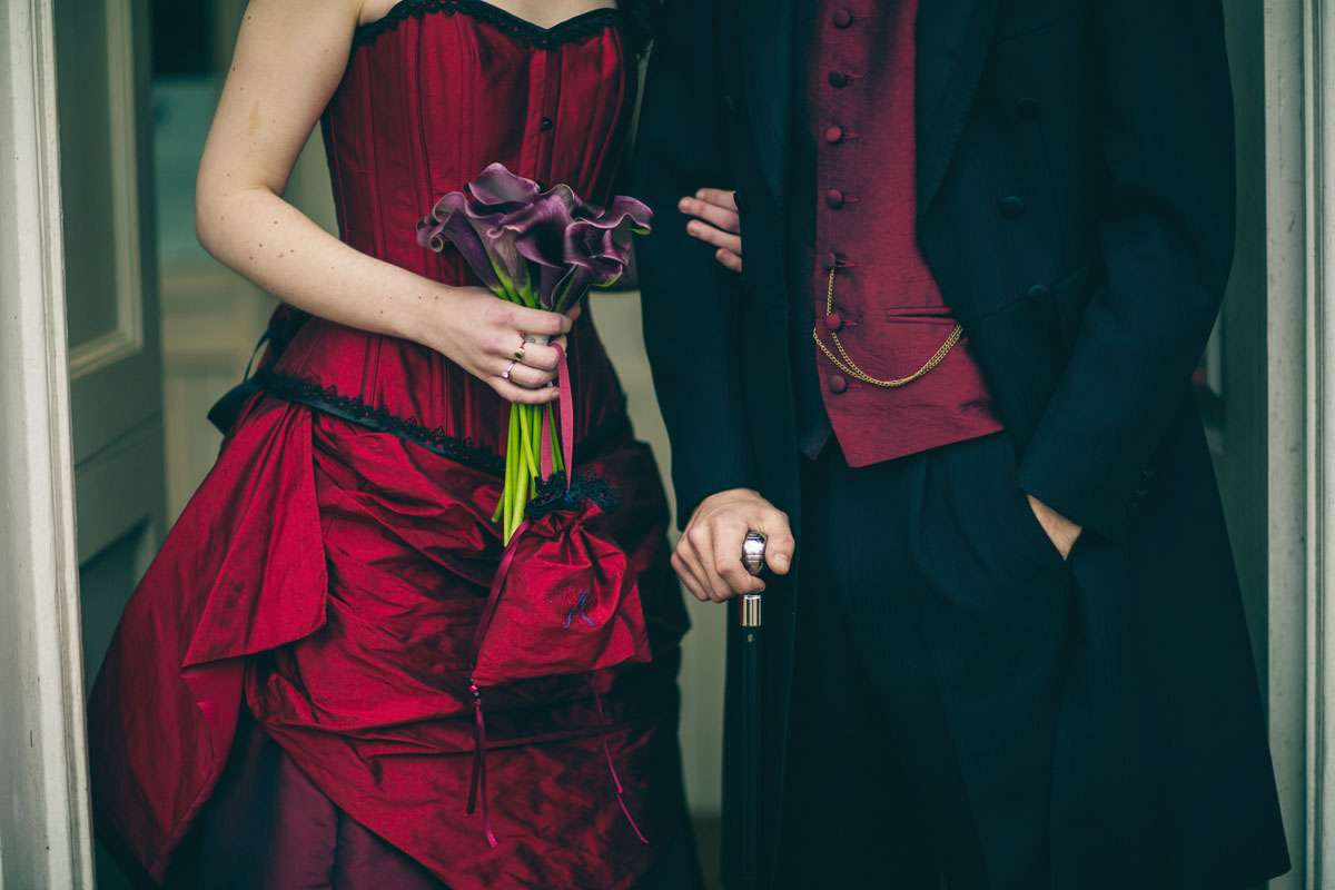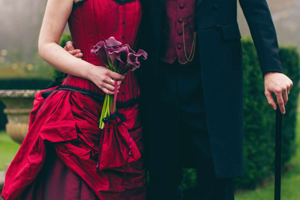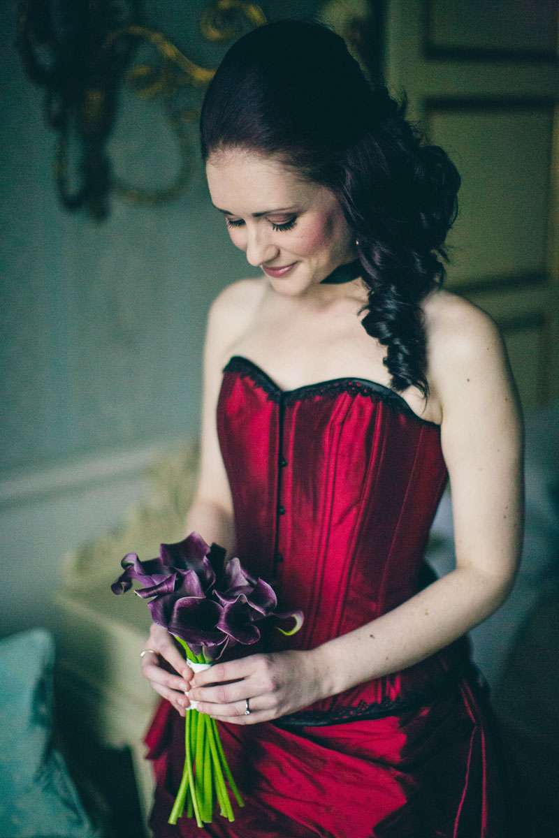 The bride’s mother made her amazing dress. “I refused from the beginning to wear white and instead chose red for my gown”, she explained. “While lots of people see white as traditional, it’s actually a fairly recent trend. Queen Victoria wore white for her wedding, but this was very new and before that, women used to just wear their best gown or if they were rich enough, they had one made. So when I thought about it, I actually felt like I was being more traditional than any bride in white! Red was an early favourite. Deep reds, bright reds and purples featured heavily as, to me, they give a sense of luxury.”