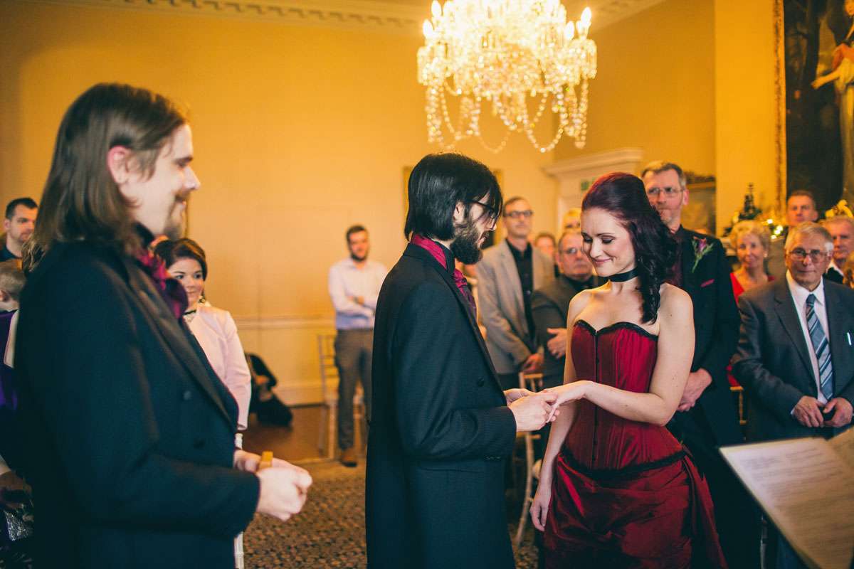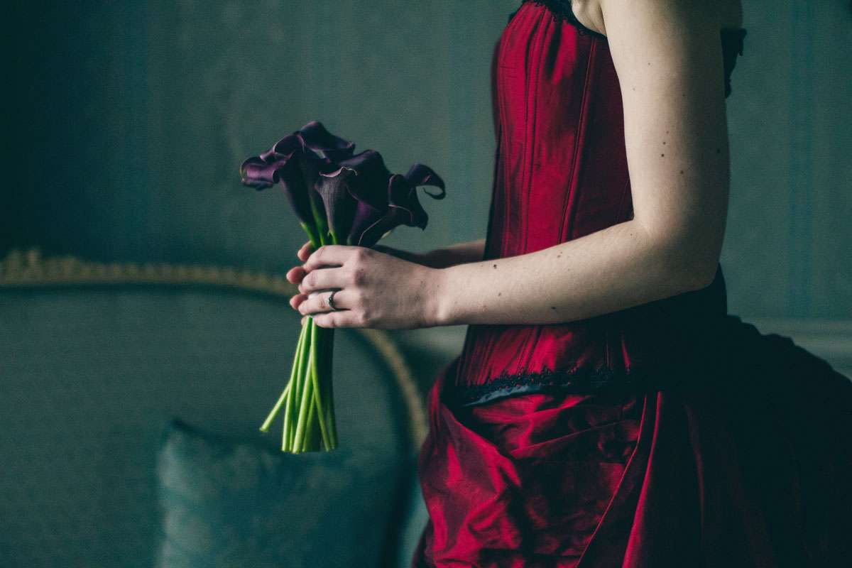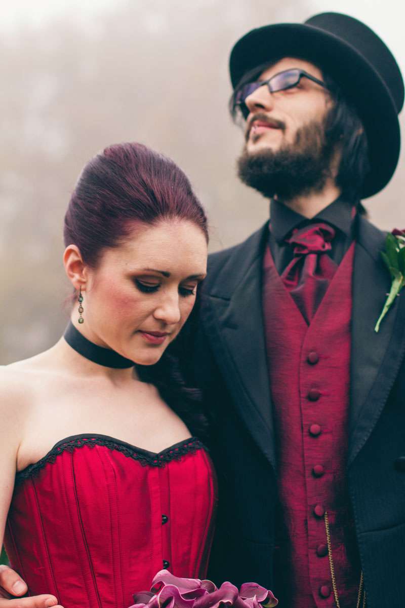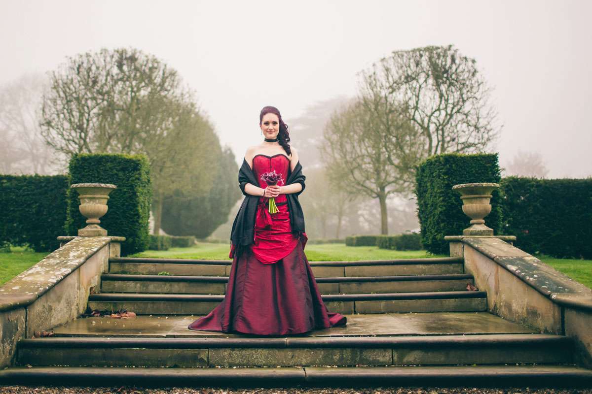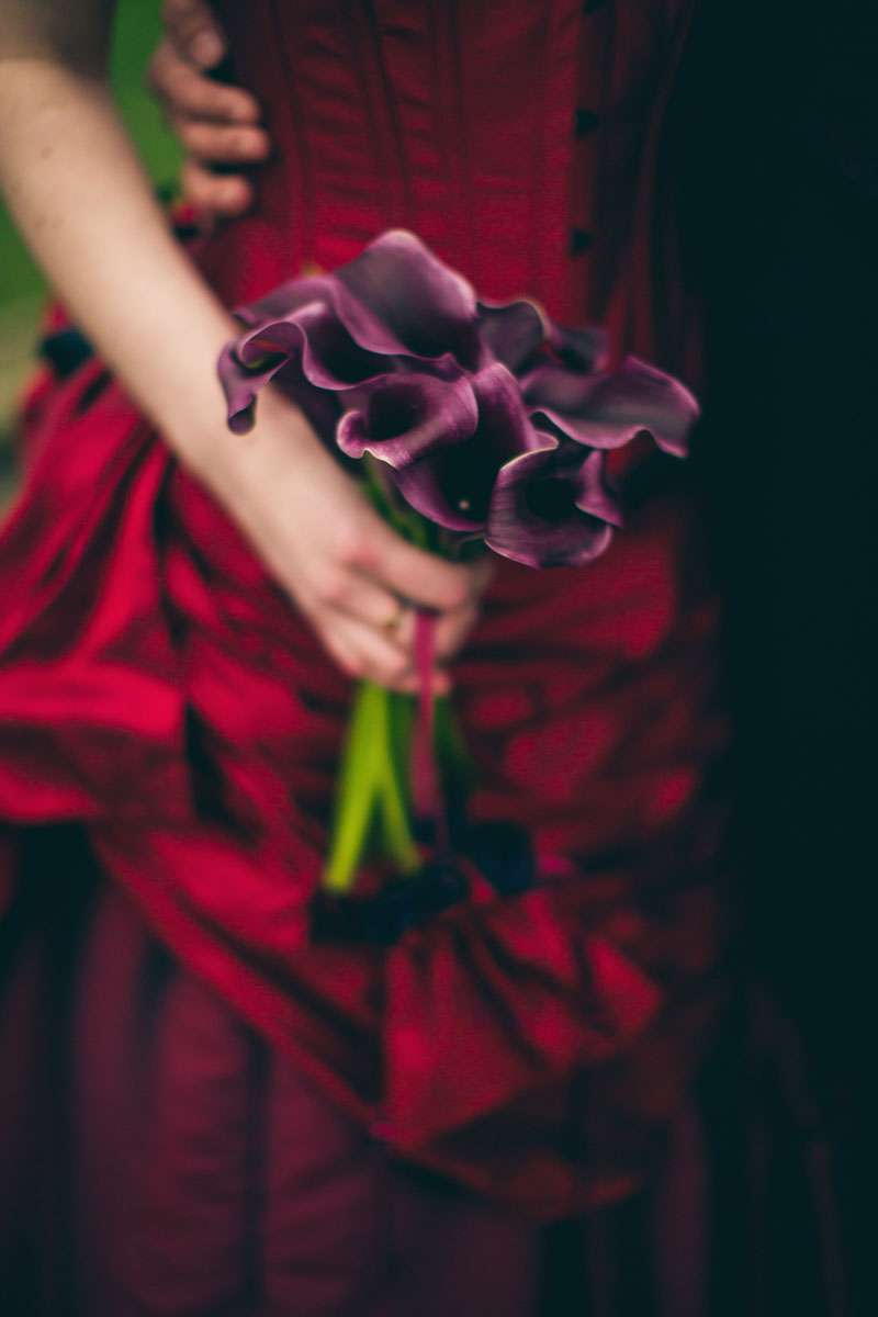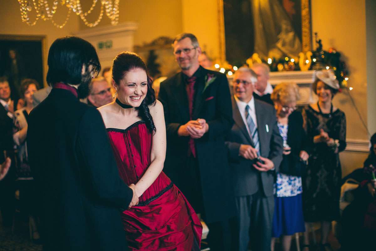 The bride’s mother made her amazing dress. “I refused from the beginning to wear white and instead chose red for my gown”, she explained. “While lots of people see white as traditional, it’s actually a fairly recent trend. Queen Victoria wore white for her wedding, but this was very new and before that, women used to just wear their best gown or if they were rich enough, they had one made. So when I thought about it, I actually felt like I was being more traditional than any bride in white! Red was an early favourite. Deep reds, bright reds and purples featured heavily as, to me, they give a sense of luxury.”