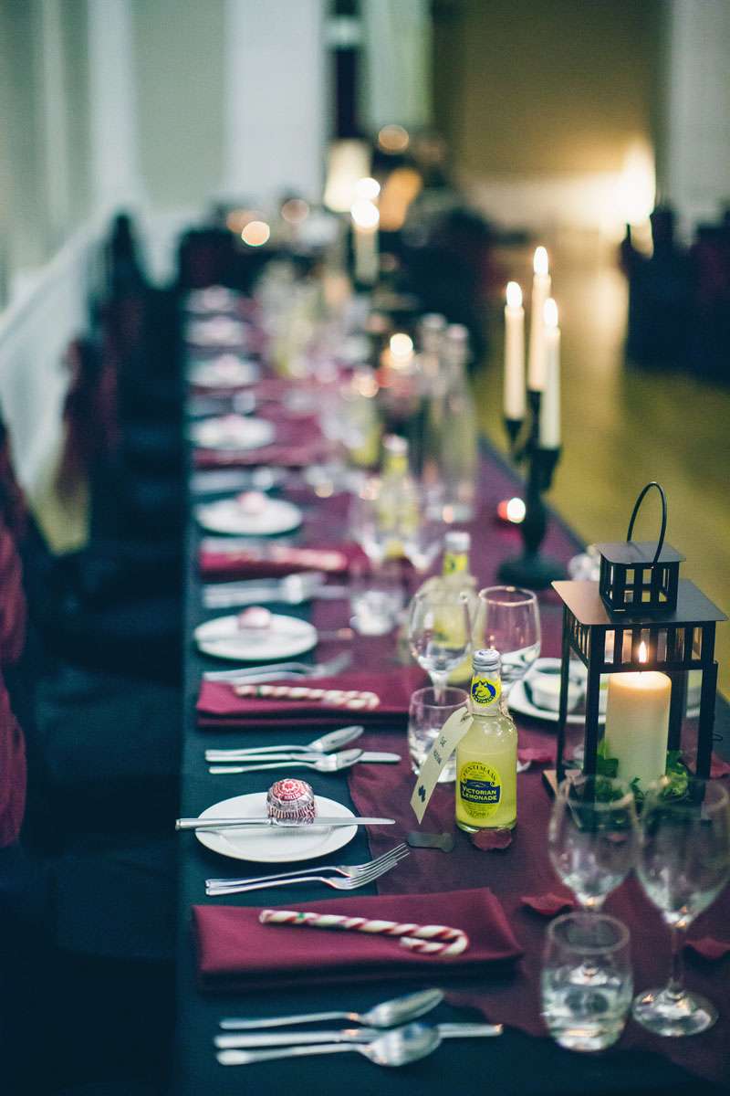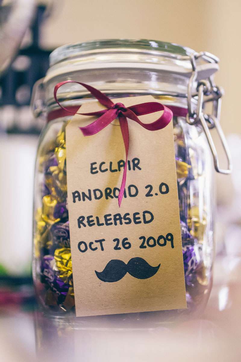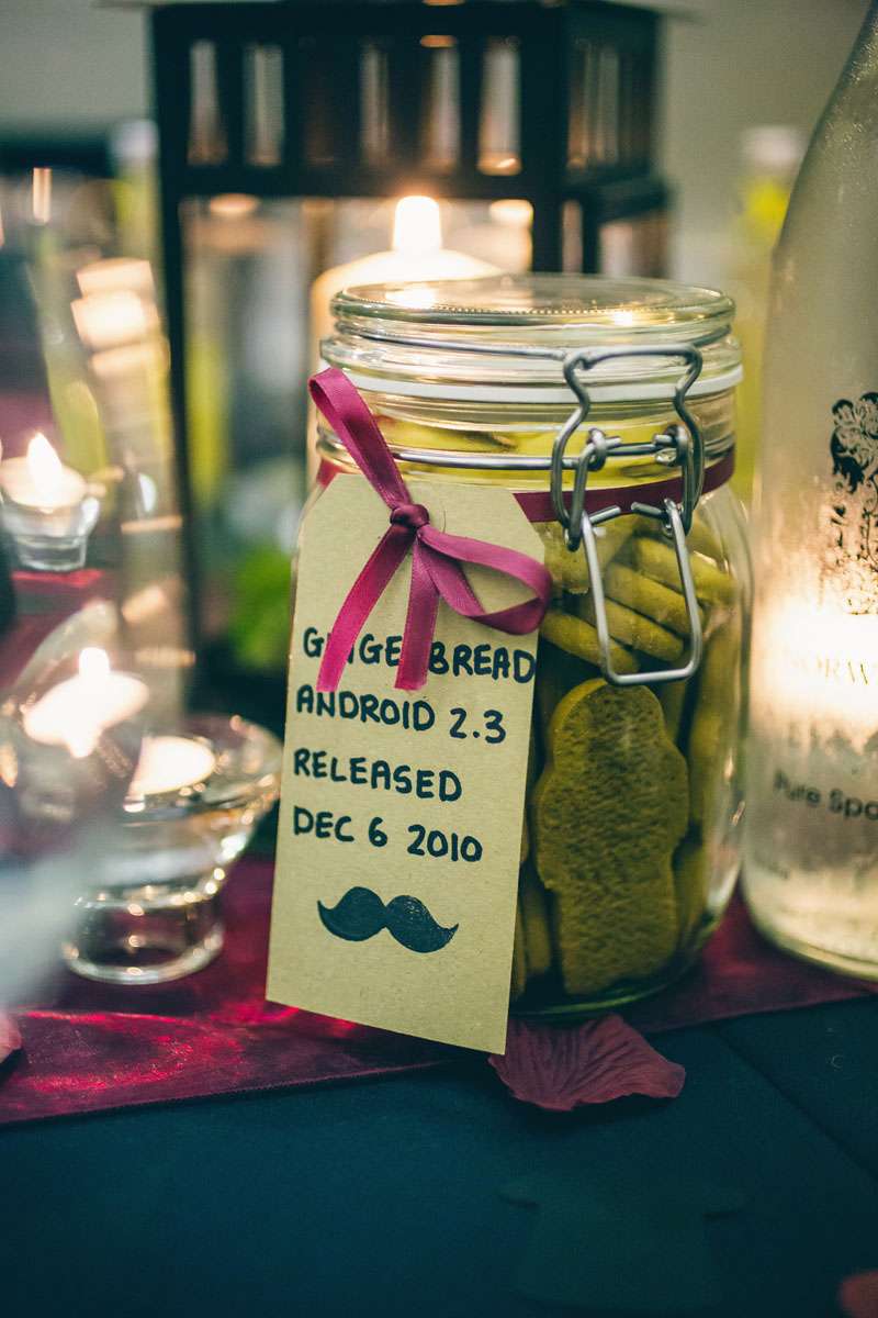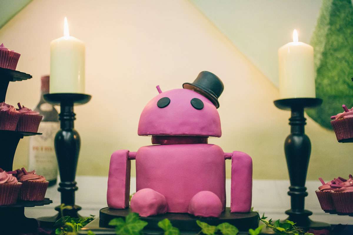 “Not wanting to be one of those brides where the wedding is all about them, I wanted Drew to have just as much influence, even though most of the time he said he didn’t mind what I did or wanted”, she continued. “But to make sure Drew’s loves were incorporated into the day, I decided that the wedding breakfast room would be Google Android themed. We had an Android cake and cupcakes, Android bunting and the tables were named after Android operating systems, accompanied by jars of sweets to match each OS name. All Androids in the room wore top hats or moustaches to match the Victorian theme of the whole day. I even managed to find a guest book decorated with a Google Doodle of Charles Dickens along with a Google quill pen!”