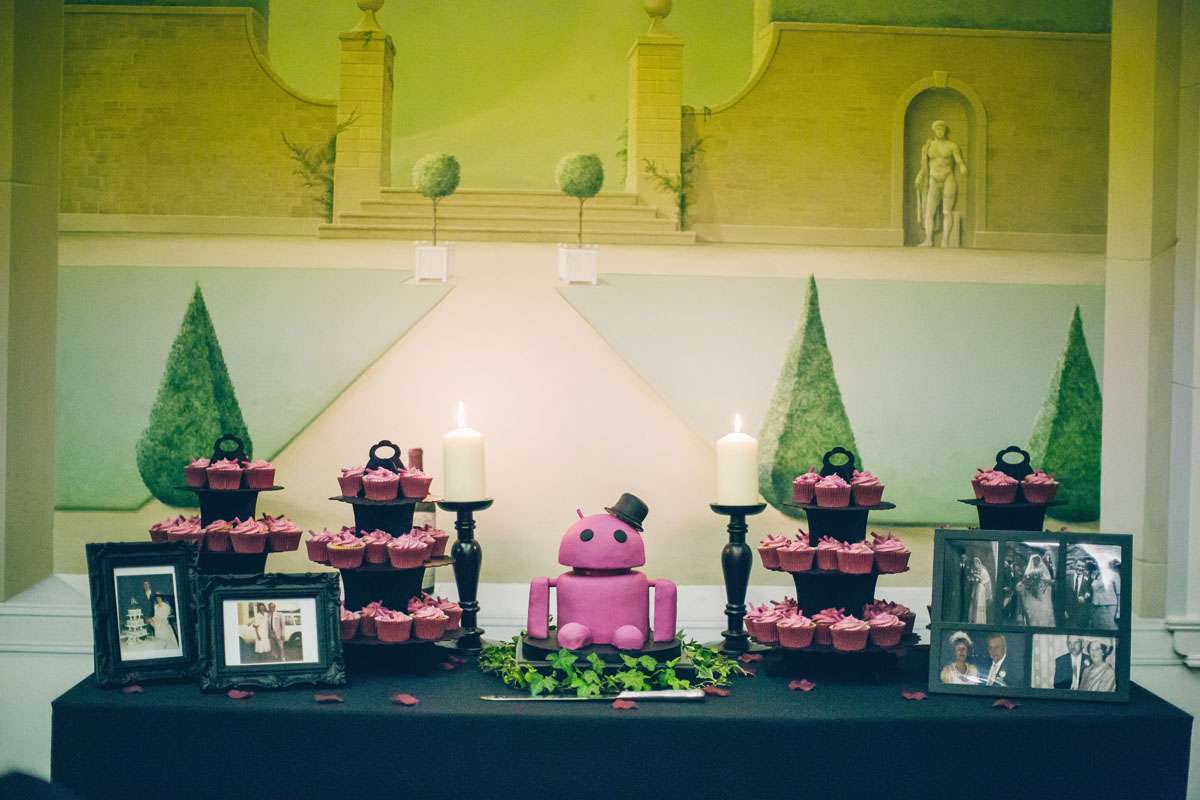 “After a lot of searching and only being able to find white or silver candelabras, Drew stayed up until 1am the night before the wedding and painted them black. Drew and his best man Simon painted the cupcake holders black as, again, we could only find ones we liked in white. My chief bridesmaid Jo made the Android bunting from leftover dress fabric.”