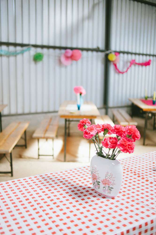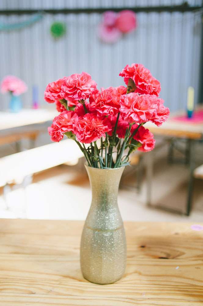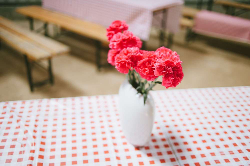 “I am allergic to anything white”, said the bride, “white plates, white cups…drives me insane. I live in colour and am surrounded by colour so we wanted our wedding gold and bright pink! I spray painted vases with gold glitter and ordered the biggest bunch of pink carnations from my favourite florist. I decided to make carnations cool again.”