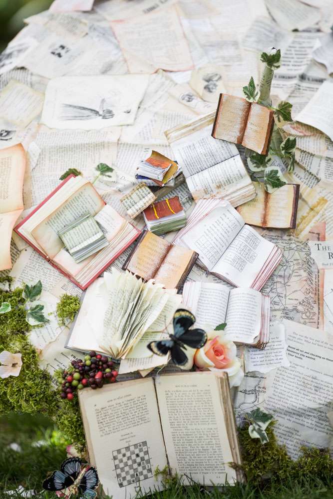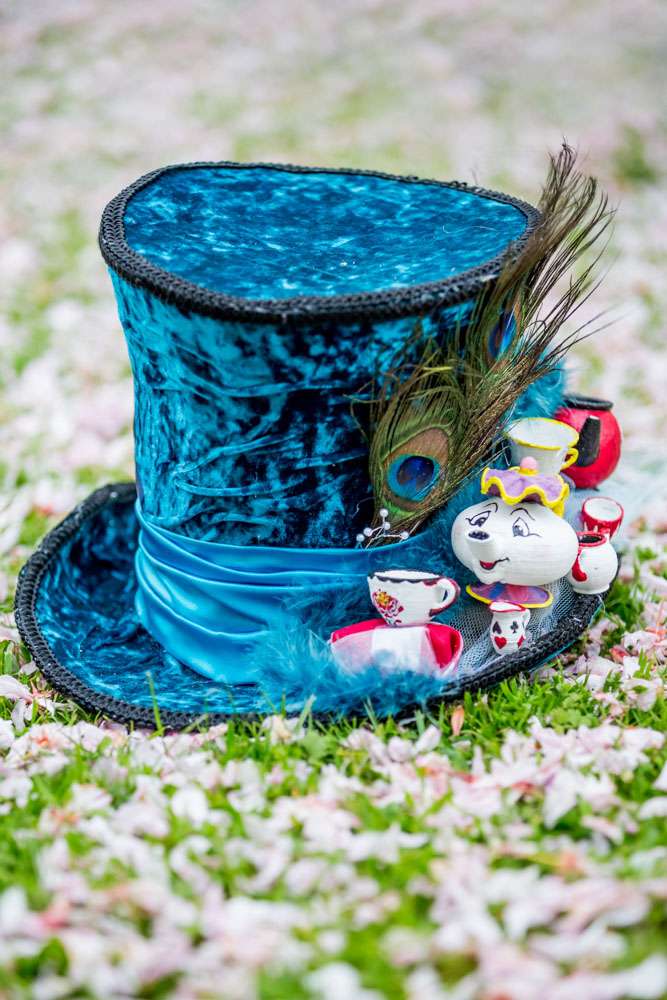 “The umbrella was made from a Victorian looking umbrella that I bought on eBay and the rest of the details were bought in charity shops, eBay or handmade. I also made the swing and the flowers were faux from The Range. The Mad Hatter hat was made with cardboard but I 3D printed the details!! I then hand painted it and covered it in material and peacock feathers. The little mushroom stools were also from The Range.”