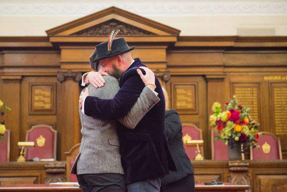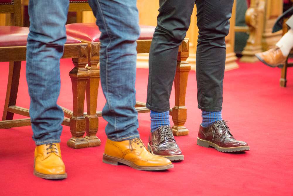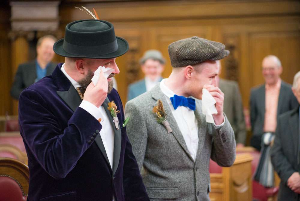 “The day pretty much went as planned, because of our intuitive and attentive ushers Rob and Adam”, they concluded. “The only issue was due to Chris losing his buttonhole between our flat and the tube. Winston came to the rescue by tracing where it had fallen based on the pictures. This unexpected event meant that we had a madcap run up and down escalators on the underground with Chris’ daughter Cecyli to get to the Town Hall on time. We got there with seconds to spare, with help from a well-wishing black cabbie, to be received by a receptionist who said, ‘So you’ve gone for the gay wedding option have ya?’. The laughter that ensued is caught on camera.”