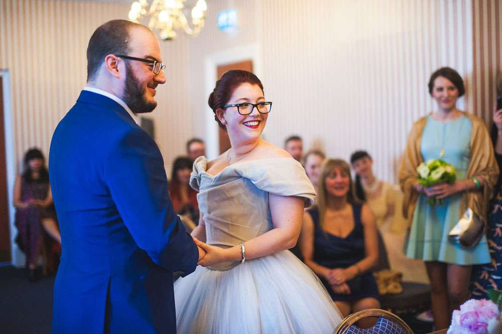 “The best bit of the day for me was the ceremony”, she said. “I know it might sound strange when we put so much effort into everything else, but we were both really surprised by how much we liked doing the ceremony! Out of all the bits it was the part we were least interested in beforehand, it was just a means to an ends really, but when we got to it, it was so lovely, standing there together staring at each other and saying to each other ‘Man, we made it. We’re here… we’re actually here!’ When the ceremony finished, we did a little dance of celebration. I don’t think there was a single second of the whole thing that we weren’t both smiling or laughing. It really set the tone for the whole day.”