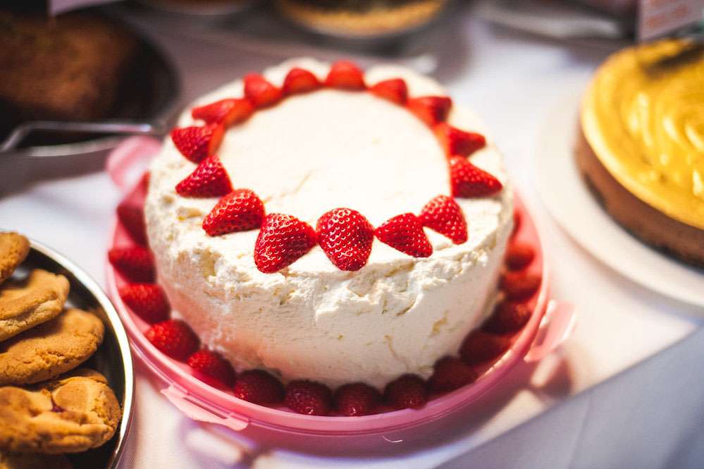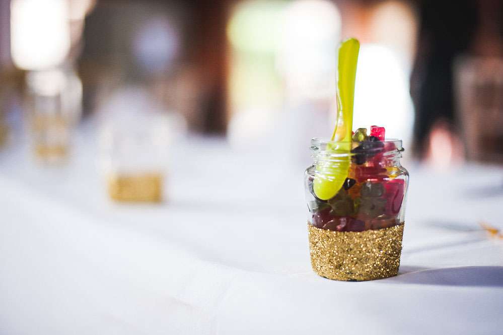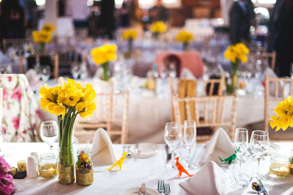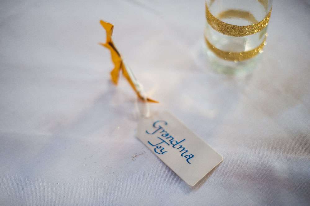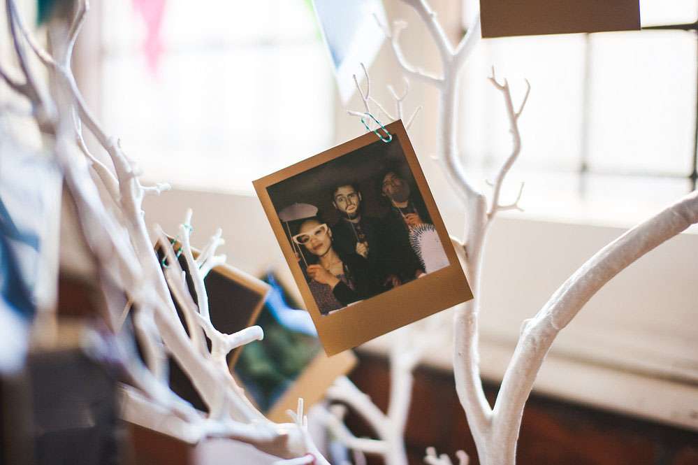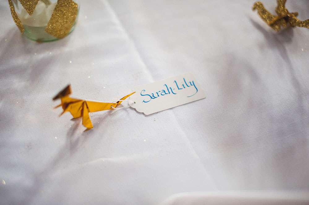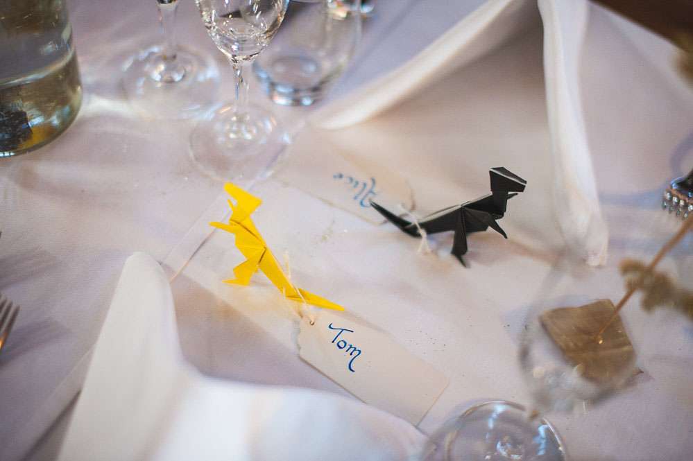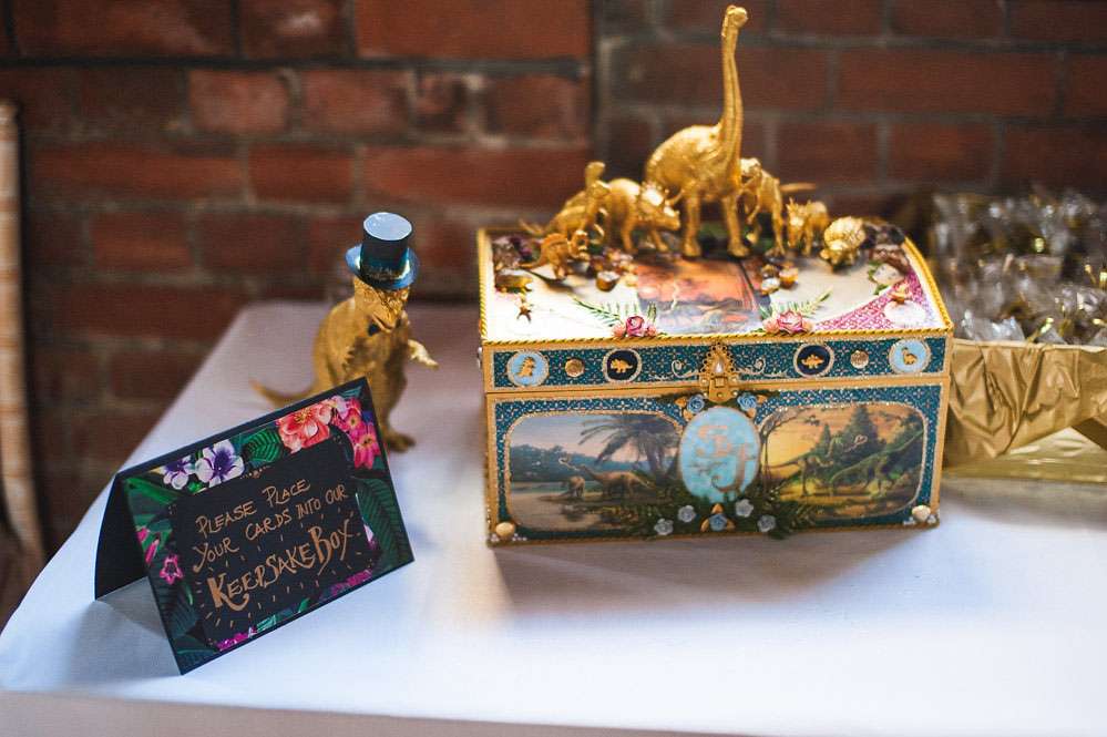 “All the dinosaur decorations were hand-glittered”, she continued. “There were 52 of them! My bridesmaids helped me glitter them plus 50 jam jars which were filled with our favourite sweets for people could munch on throughout the day. Jon made over 60 origami T-Rex’s and my mum made over 80 metres of bunting, as well as our wedding cake and all the gingerbread favours! My dad made the frame for the table plan. Our guest book was combined with the photo booth, so guests took a picture of themselves using the Polaroid camera that we got off of eBay and then hung on a tree, it was great!”