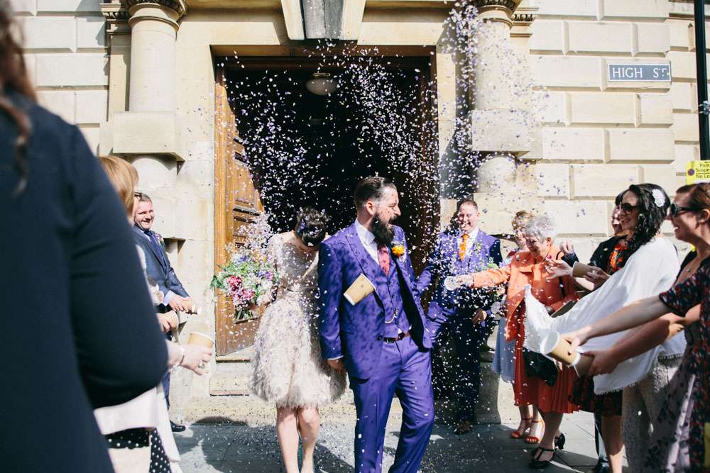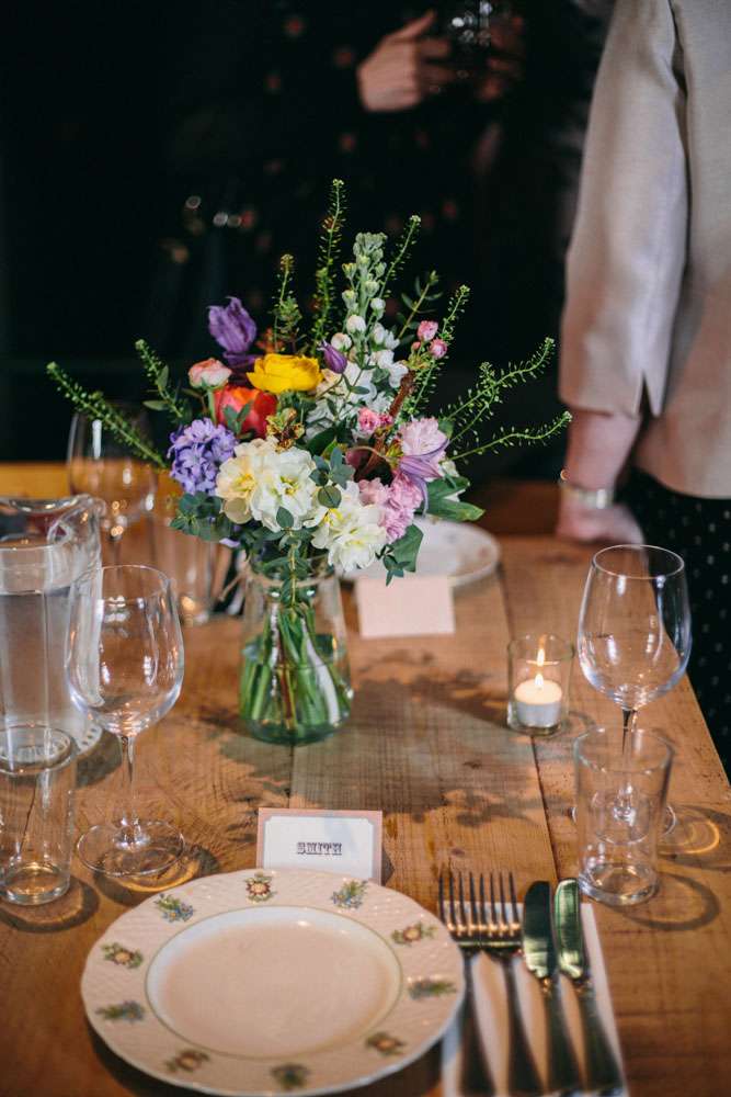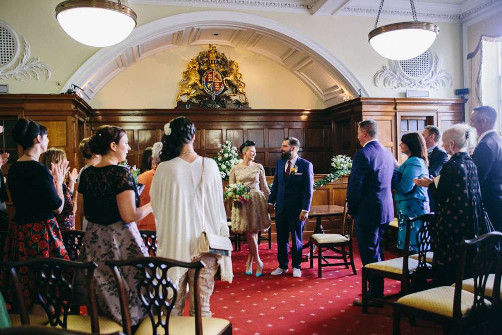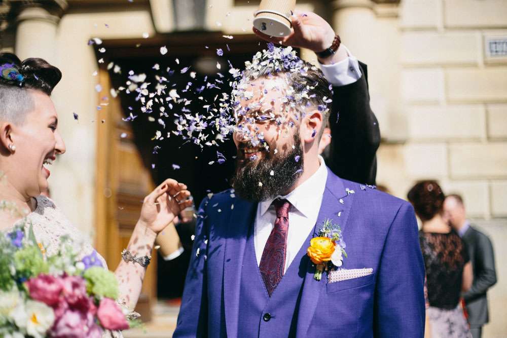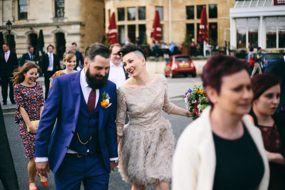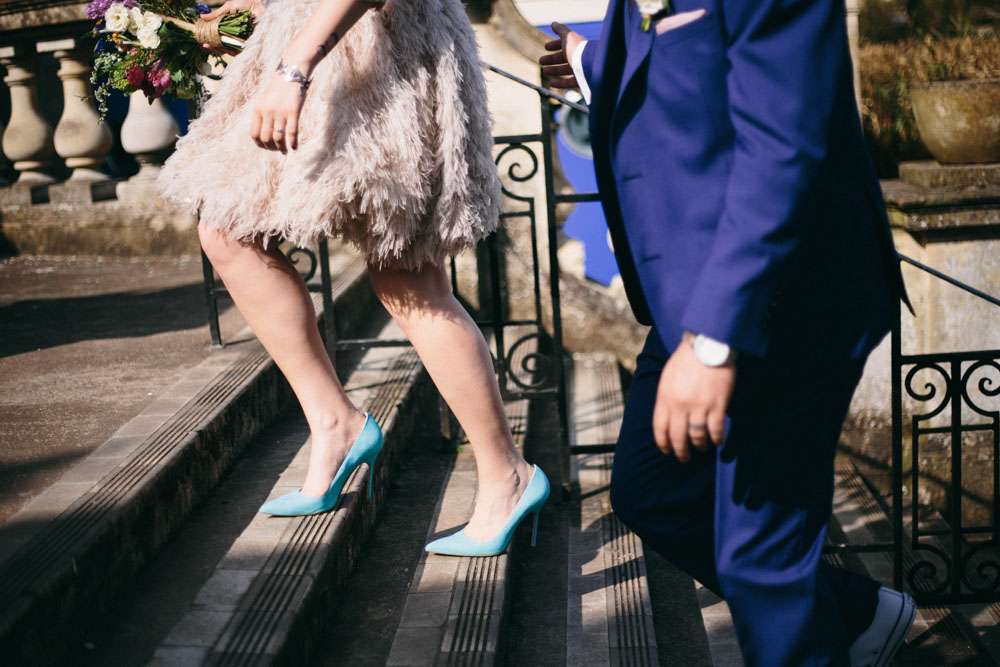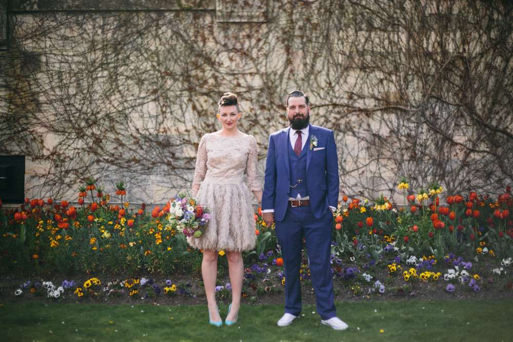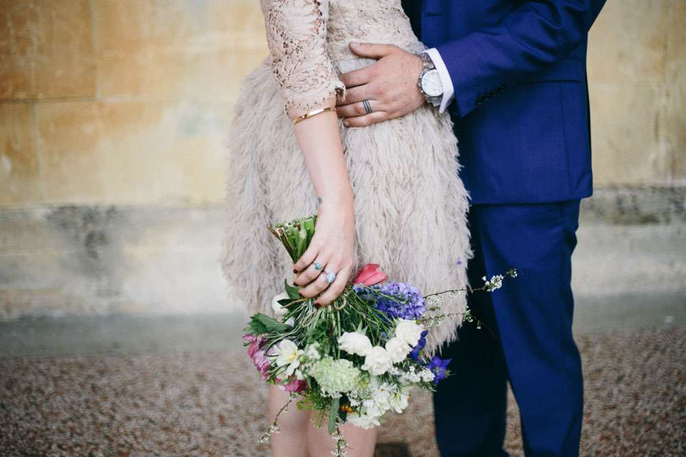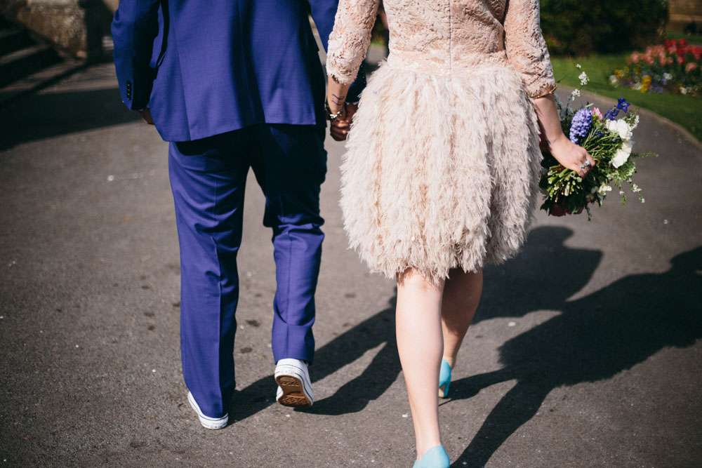 The bride wore a short David Fielden dress with an amazing feather skirt. “I bought my dress from Carina Baverstock Couture. I picked it because our wedding was small so I decided that I didn’t really want a big traditional dress. It just wouldn’t fit with the day. I was pretty blasé though and just thought if worst came to worst I’d nip to Topshop on the day and grab a white shift dress! I stumbled into Carina Baverstock’s shop by chance but it was amazing I went from having no prospects to having numerous. The service we received was fantastic too!”