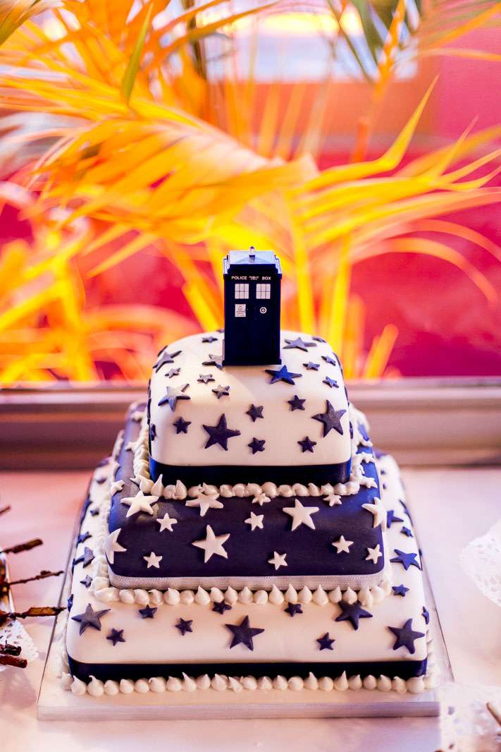Sean and Kath were married in Maidstone, Kent. The biggest influence for their wedding was their mutual love of Doctor Who! Kath wore a dalek belt made for her by The Couture Company (who also made her stunning dress and headpiece), and their cake had a Tardis on top!