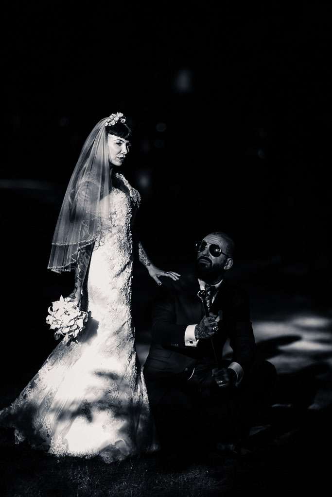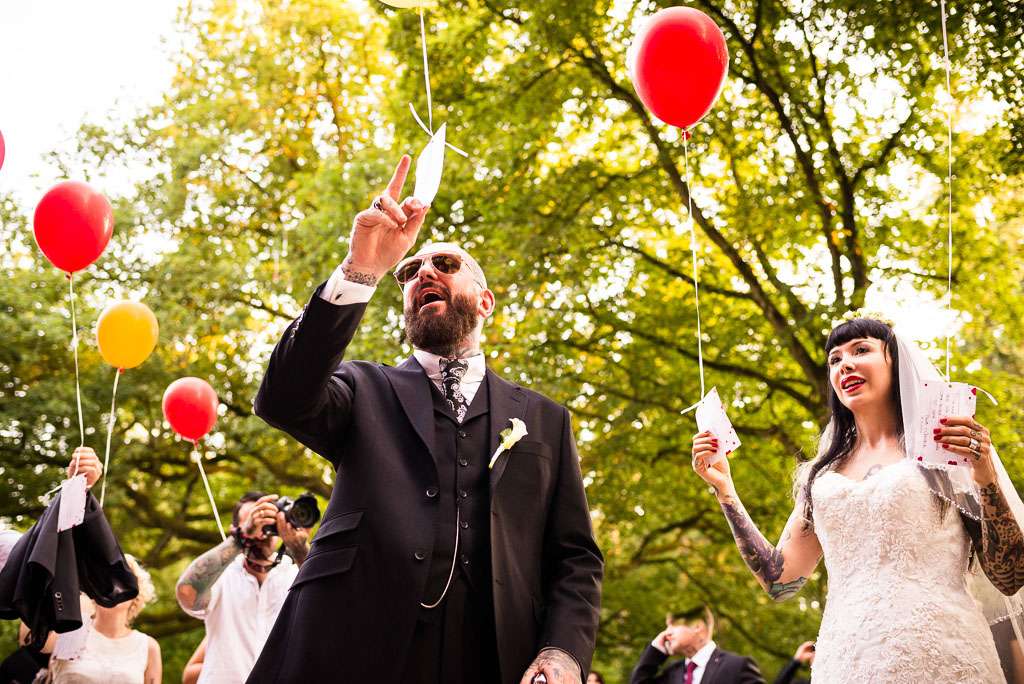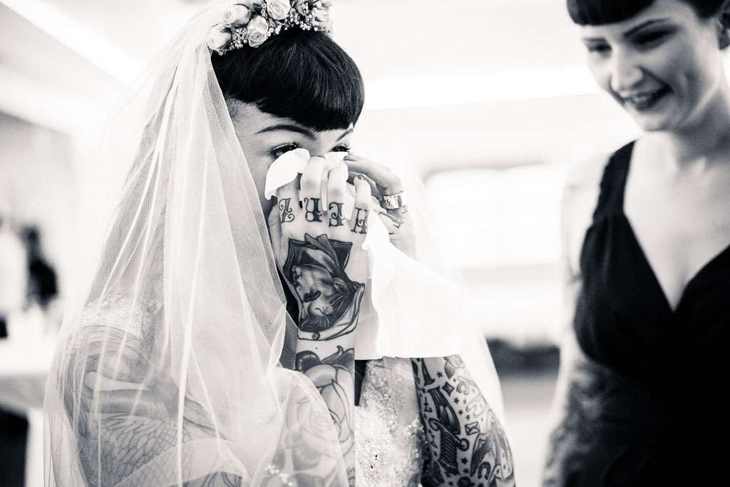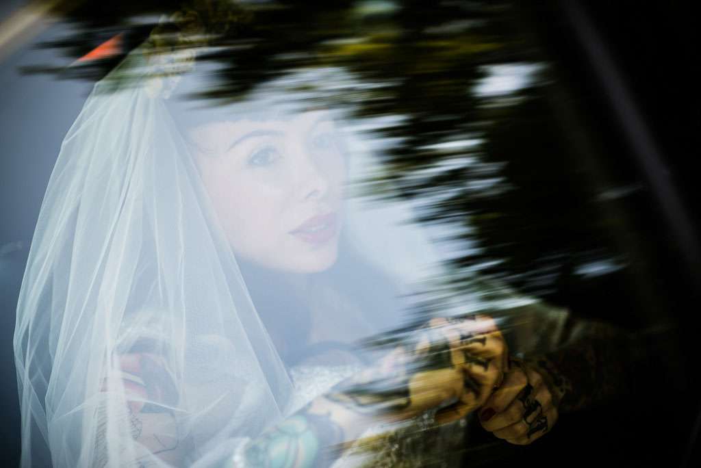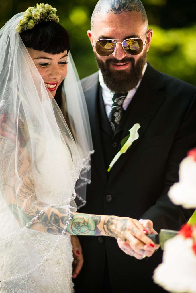 “We wanted our wedding to be a contrast”, June told me. “We had classical elements mixed with punk rock. My dress was quite traditional but I showed off my tattoos! Our theme was ‘vintage Rock n Roll meets classic meets punk’.”