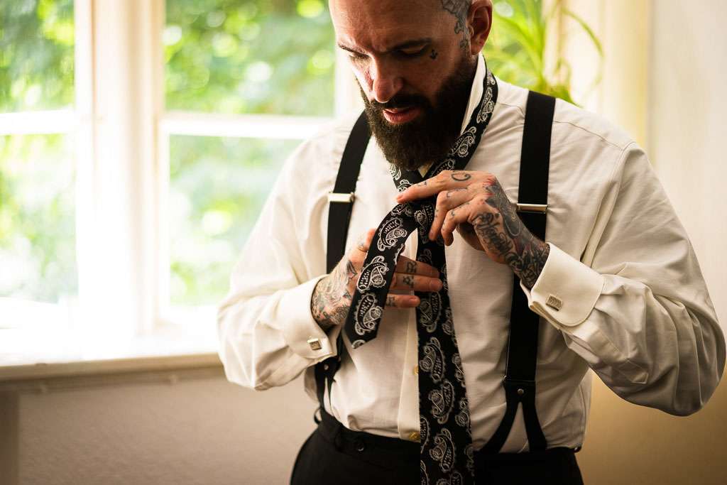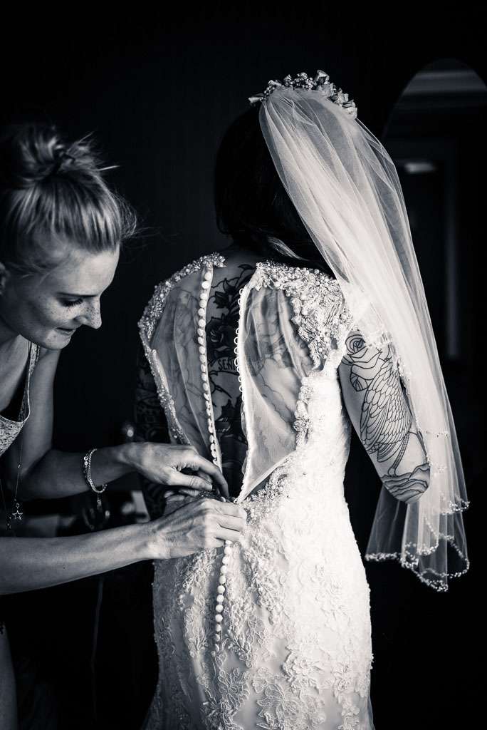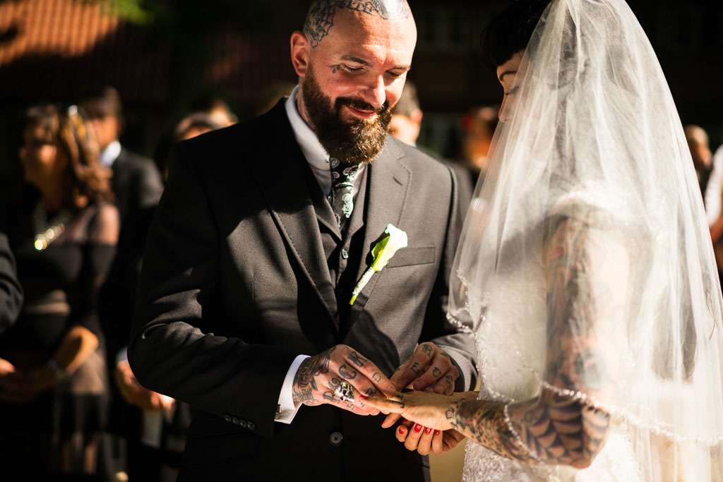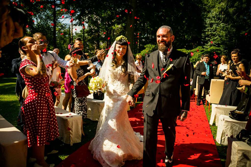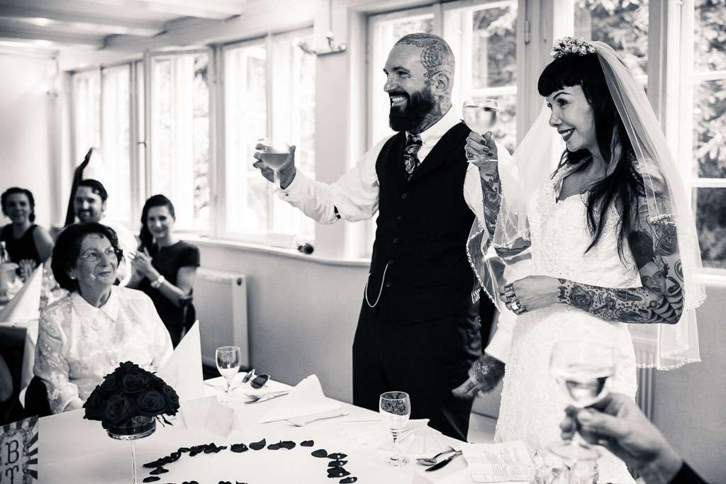 “We wanted our wedding to be a contrast”, June told me. “We had classical elements mixed with punk rock. My dress was quite traditional but I showed off my tattoos! Our theme was ‘vintage Rock n Roll meets classic meets punk’.”
