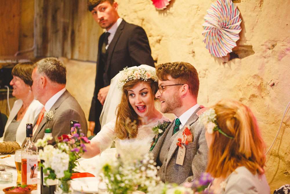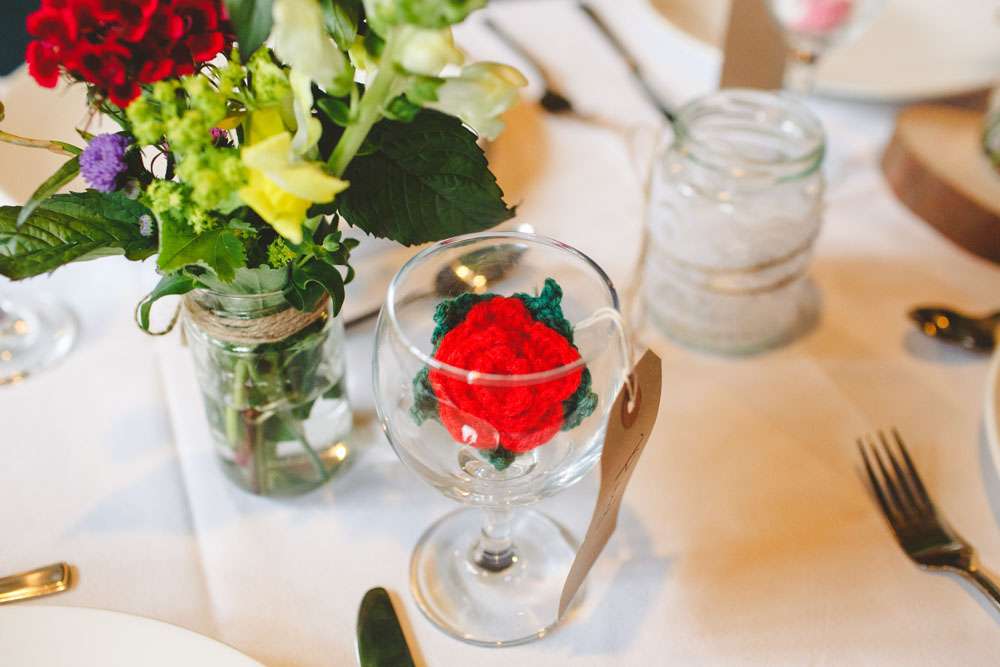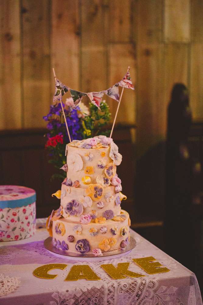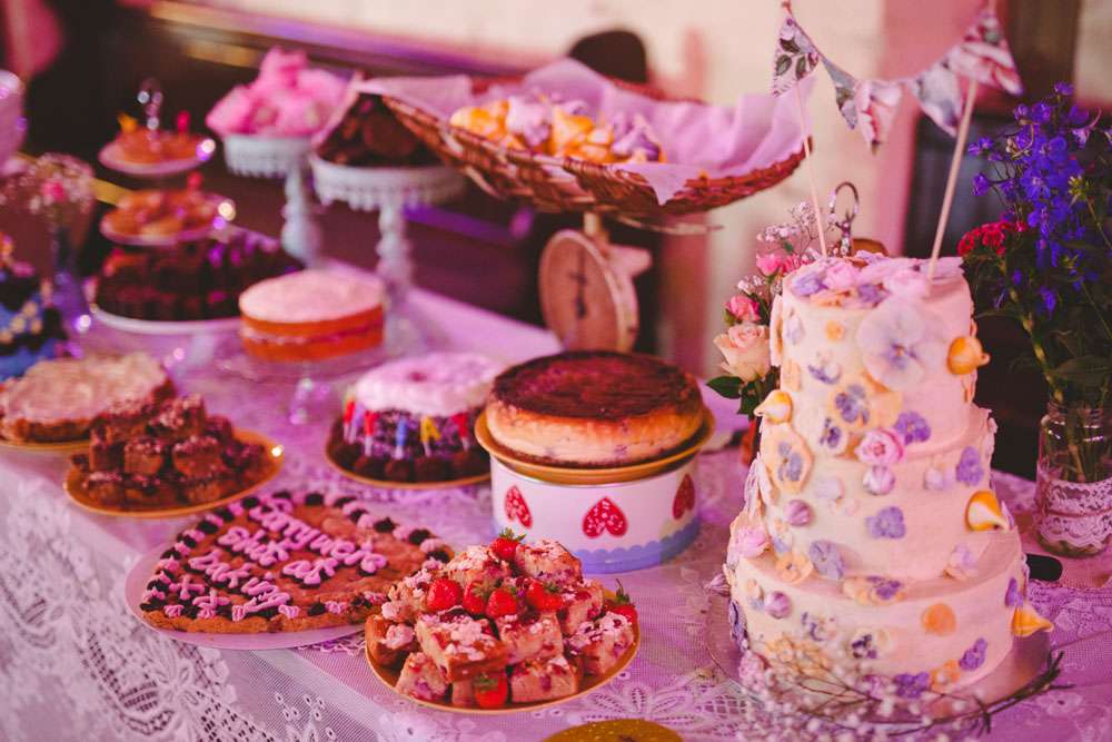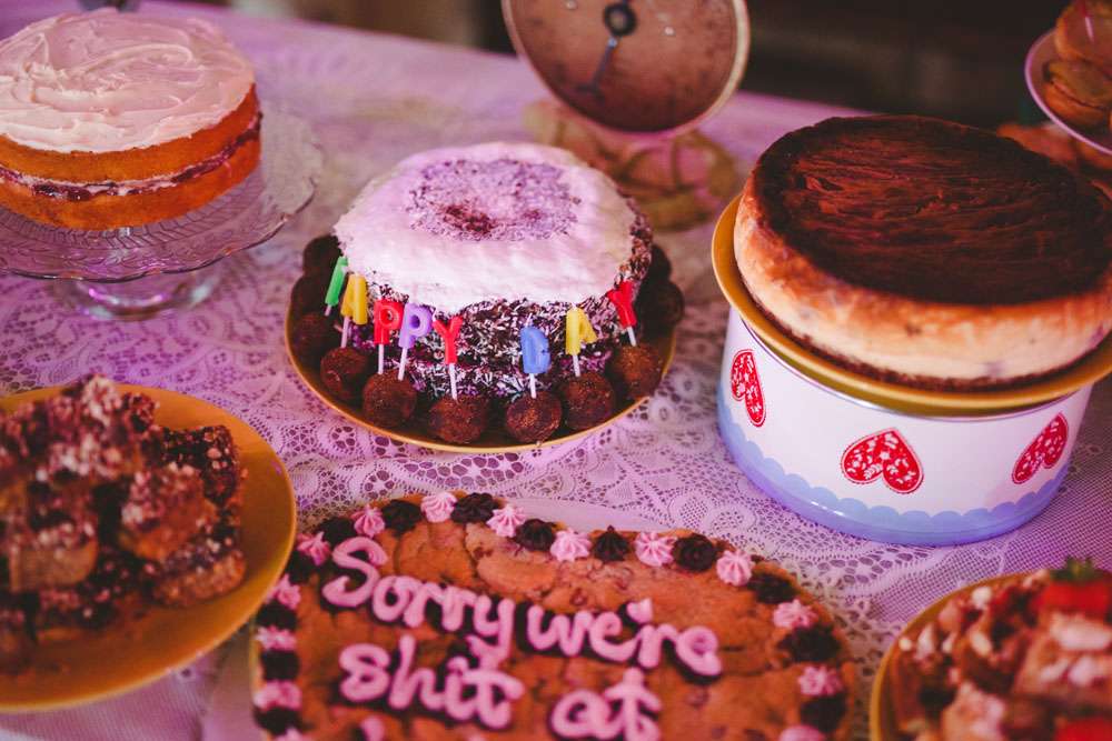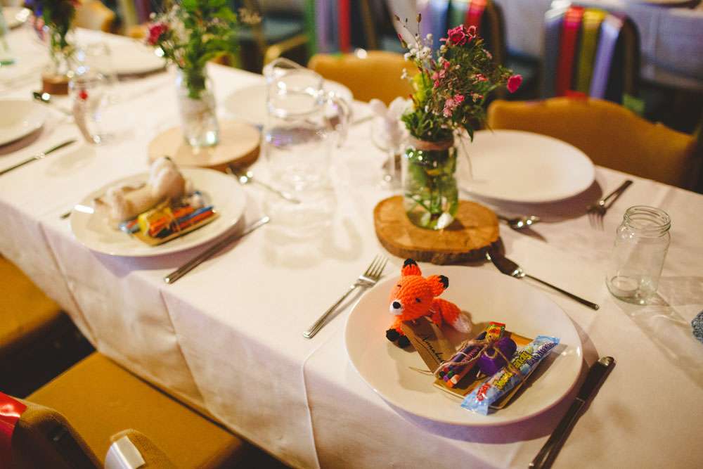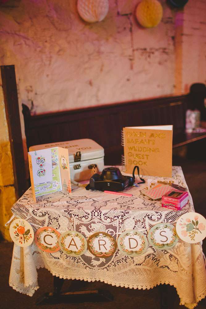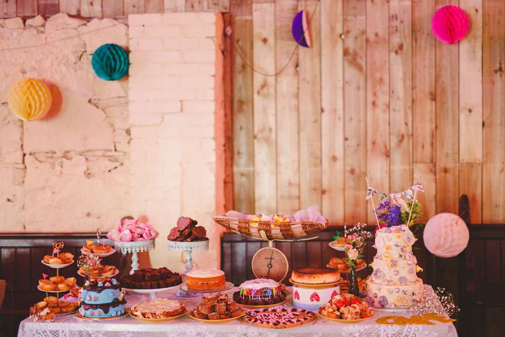 “We had loads of help from friends and family with making things including individual crochet favours for each guest made by my mum, the cake by one of my bridesmaids, the table numbers by another and all the wooden props by my dad and brother”, Sarah said. “All the other cakes and desserts were made by guests – we had a cake competition! I also made the ribbon curtain we had at the ceremony and me and my bridesmaids made our own flower crowns.”