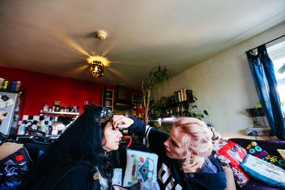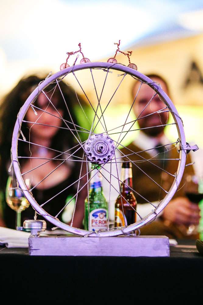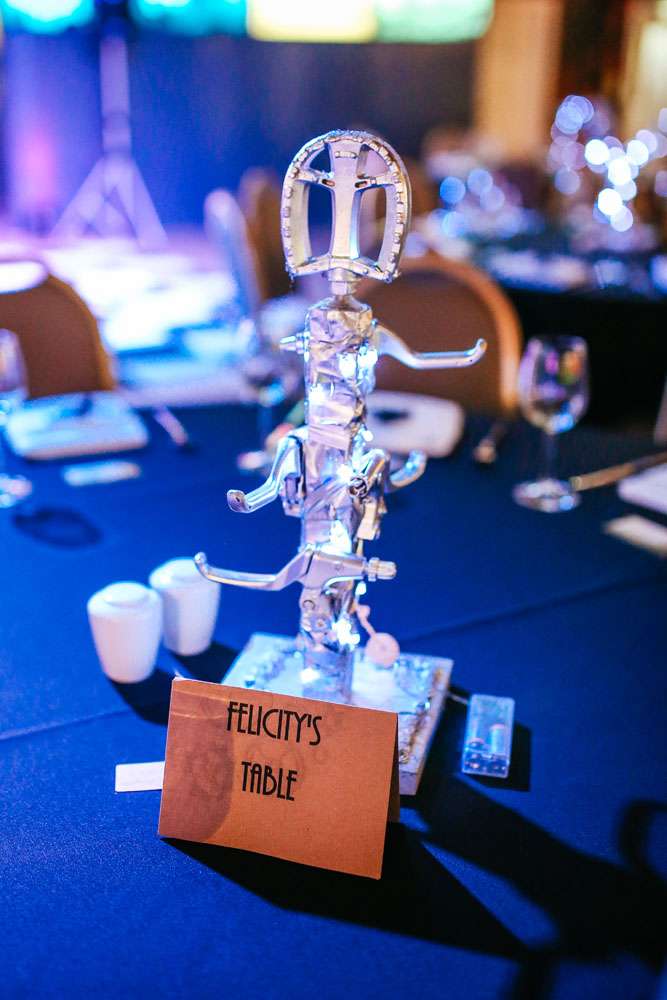“Fairy lights were borrowed from friends’ Christmas boxes and the ones we had to buy were used again. My good friend Rachel made 10 centrepieces all out of recycled bike parts. The cakes were all homemade by members of our bridal party and my Mum provided black lace and faux ivy for the table. A tree surgeon friend of ours provided the logs for the cakes to sit on! We had no real flowers. My bouquet was made by a friend from cogs and fake flowers and bits from my grandparents’ old jewellery and pocket watches.”