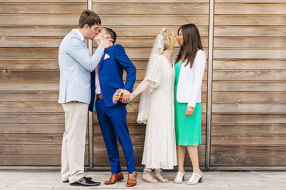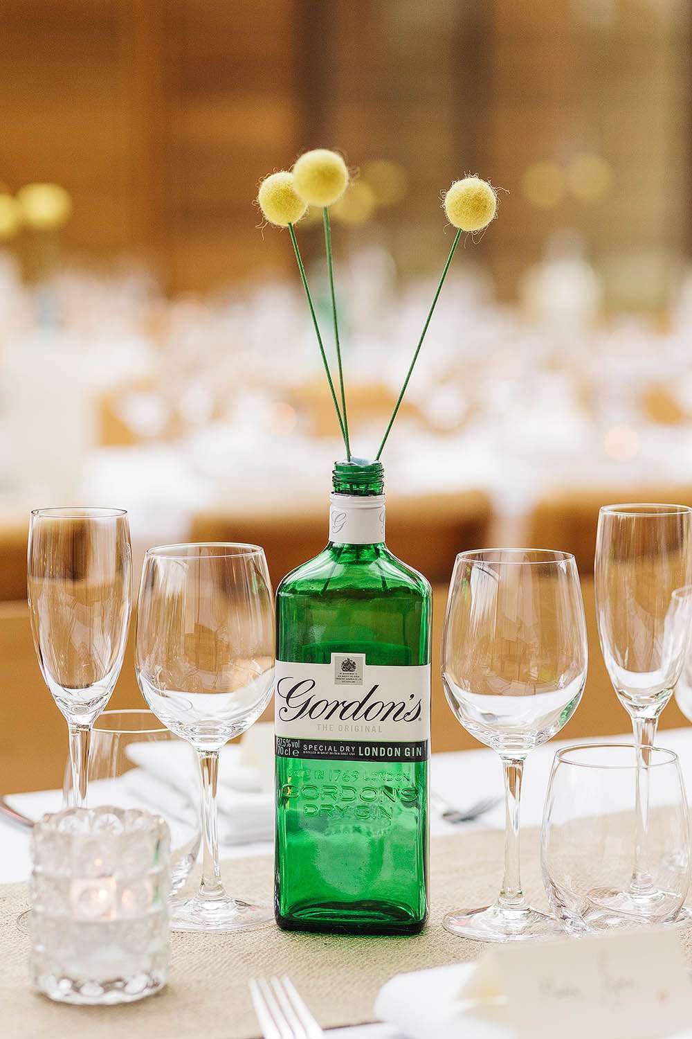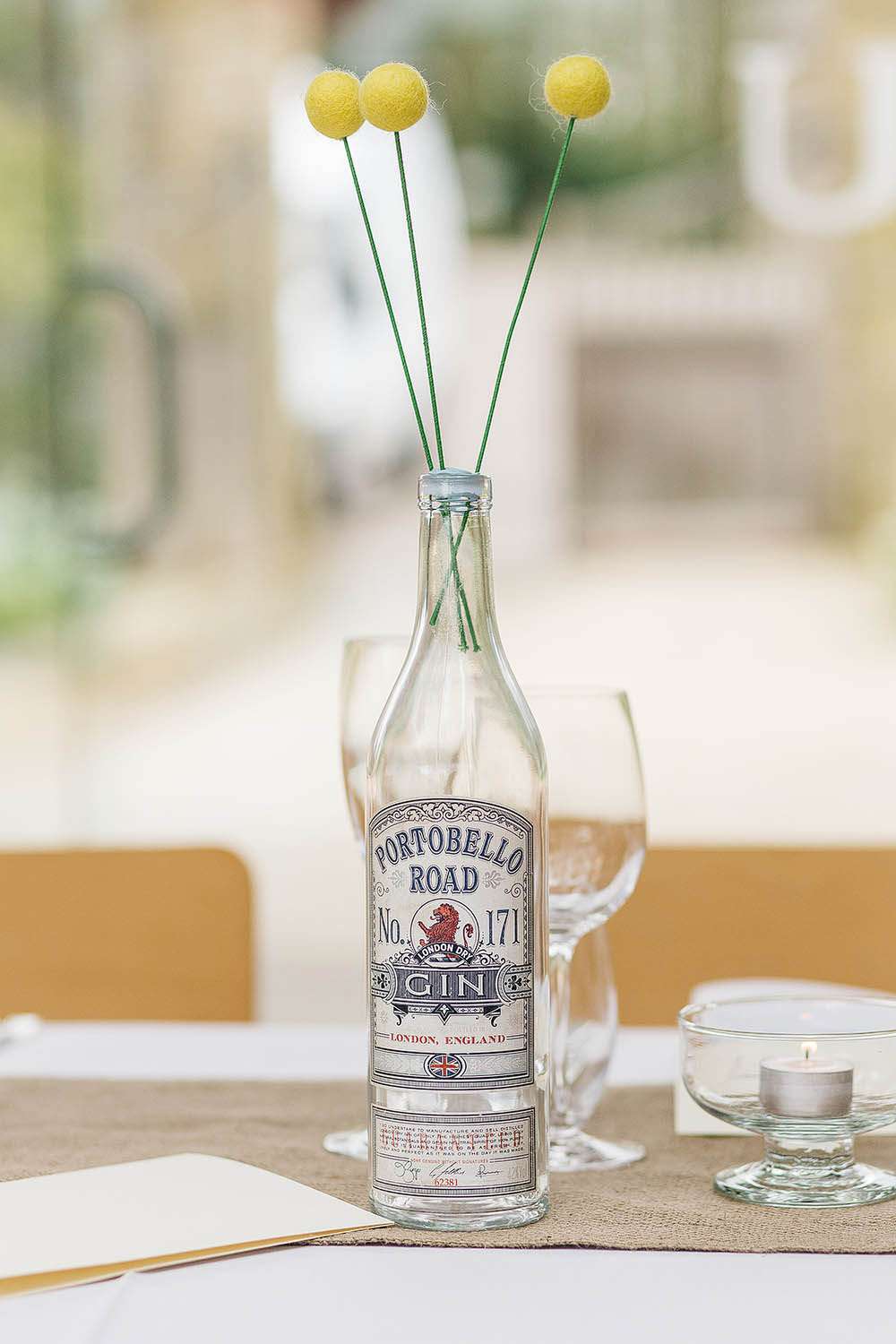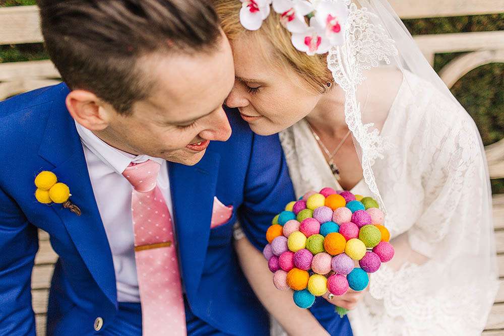 The décor in the reception space was a mix of rainbow coloured lanterns and felt pom pom ‘flowers’ (made by the bride’s mum) and gin! “We already drink a lot of gin so it made sense to have our table names as gins!” laughed the bride. “We saved our gin bottles throughout the engagement and used them as the table names.”
