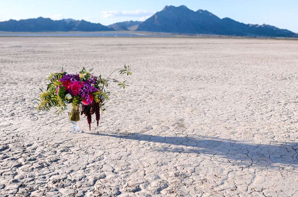“We can happily say that we did our wedding our way, and we clearly did it simply for us”, said Sarah. “We both absolutely love the desert and big open spaces and we wanted that to be a big part of our ceremony. We both appreciate the minimal, and you don’t get much more minimal than a dry lake bed on the outskirts of Nevada. We also love mid-century architecture and retro design so we had a retrofitted teardrop trailer provided by Flora-Pop. They also brought along a pair of vintage champagne saucers and a pair of mismatched chairs – that’s all we needed and we wouldn’t change a thing.”