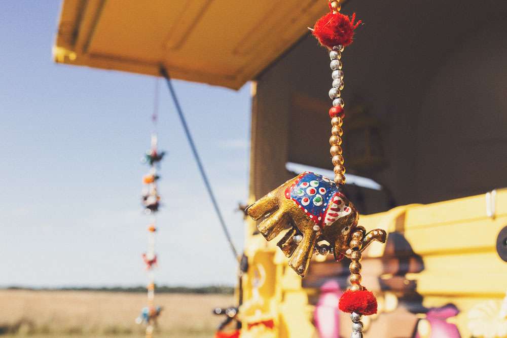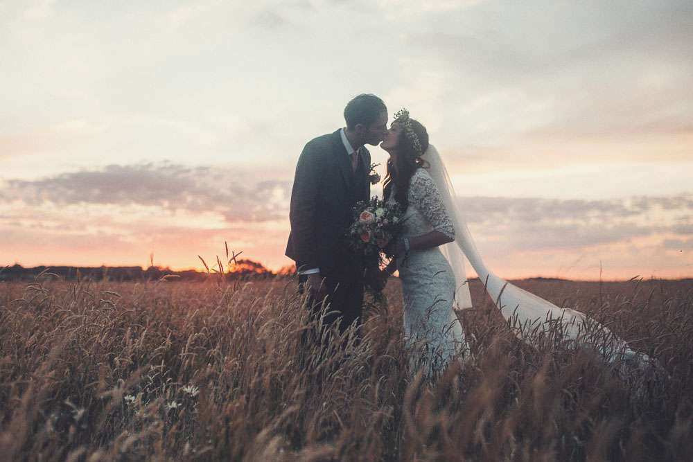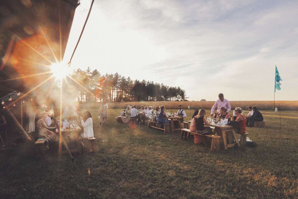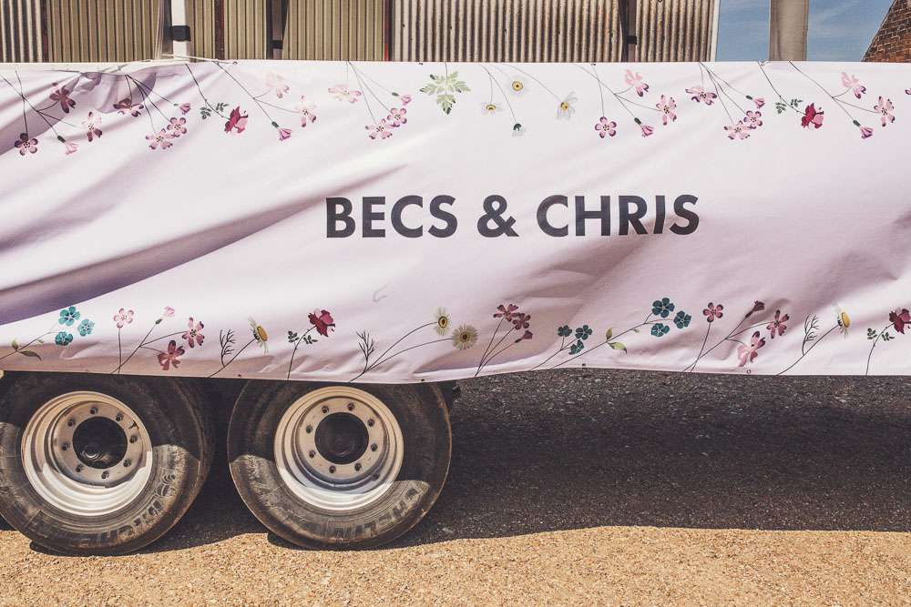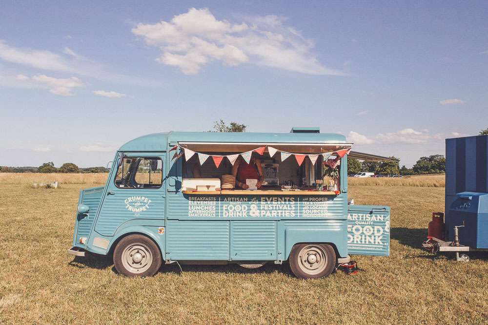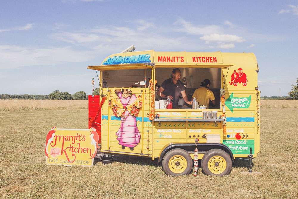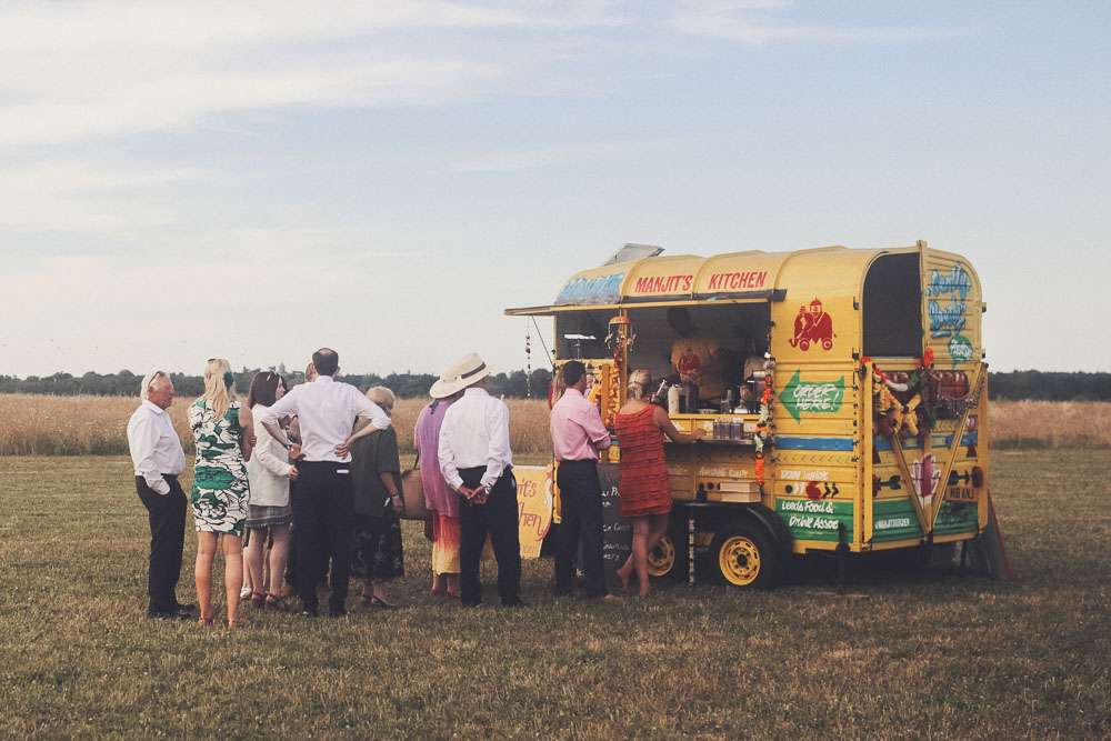 Becs and Chris were married at The Winter Garden at Sennowe Park, Norfolk. They hosted their reception in a tipi on the bride’s parent’s farm. “We always said that when we got married we wanted a festival feel”, said the bride. “Festival for us meant relaxed vibes, happy music and street food! We love food and that was pretty much the most important bit for us. We got Manjit and Fish& to drive down from Leeds because we love their award-winning food so much! I guess it’s quite unusual to have Gujarati food at a non-Indian wedding but we love curry and Manjit’s is incredible. As is Fish& – we had three types batters for our fish pieces! Trumpet & Crumpet provided amazing canapés and delicious British desserts for us.”