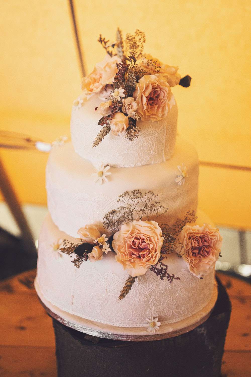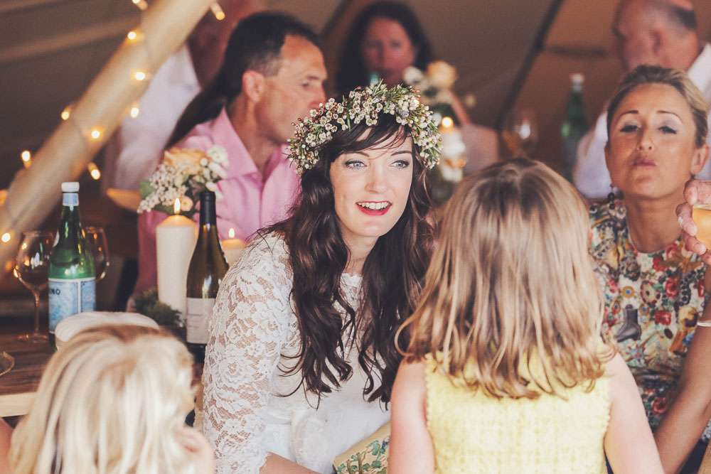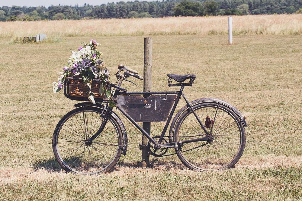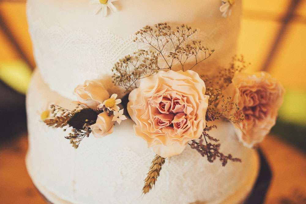 “We made the wooden signs ourselves. We really pleased how they turned out. I baked the cakes (one tier gluten free sponge, one tier carrot, one tier german chocolate) and my mum did all the decorating including the sugar craft and lace. She is very talented. Mum and her friend also did the flowers in the bike basket and just outside the tipi.”