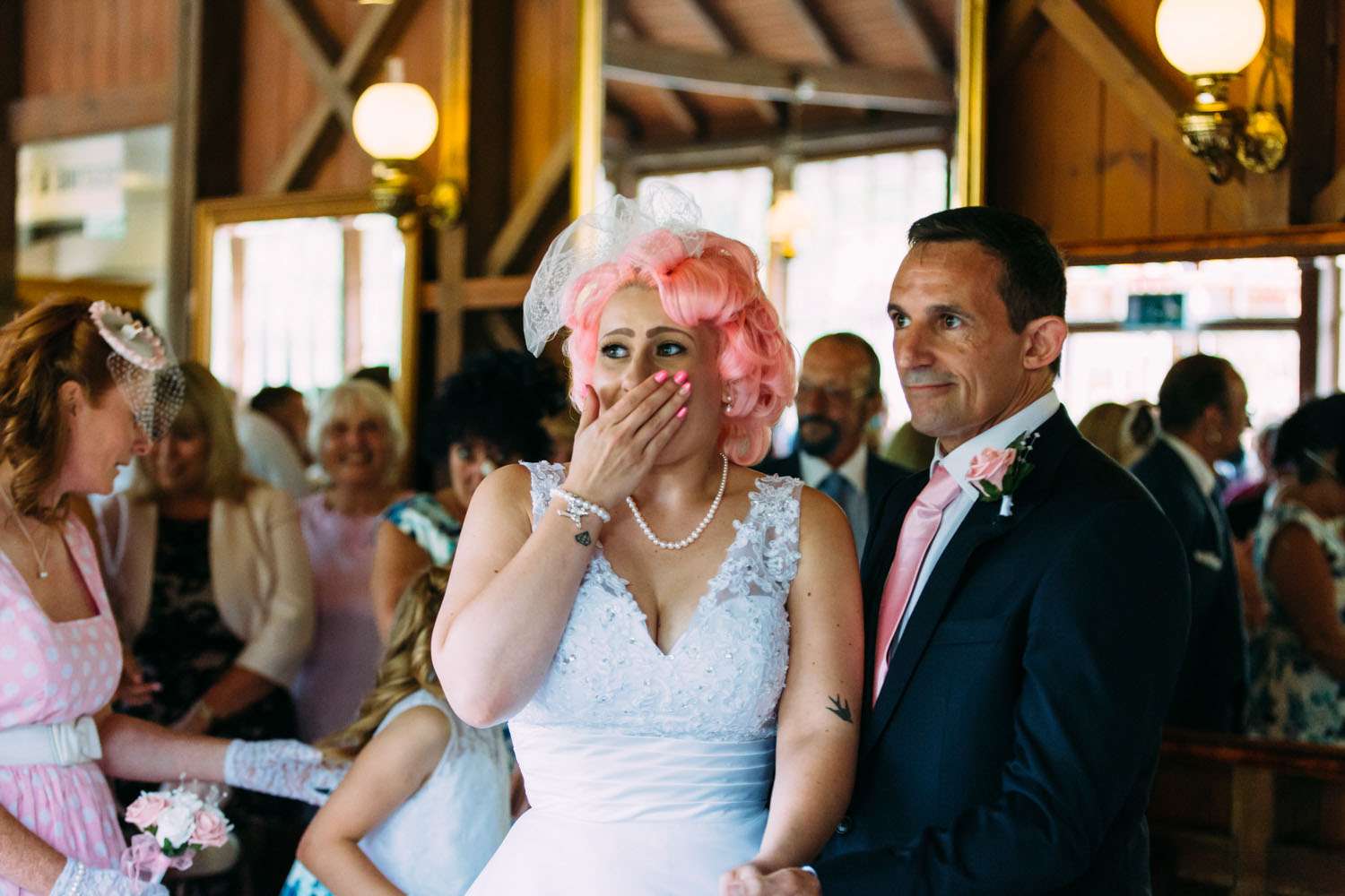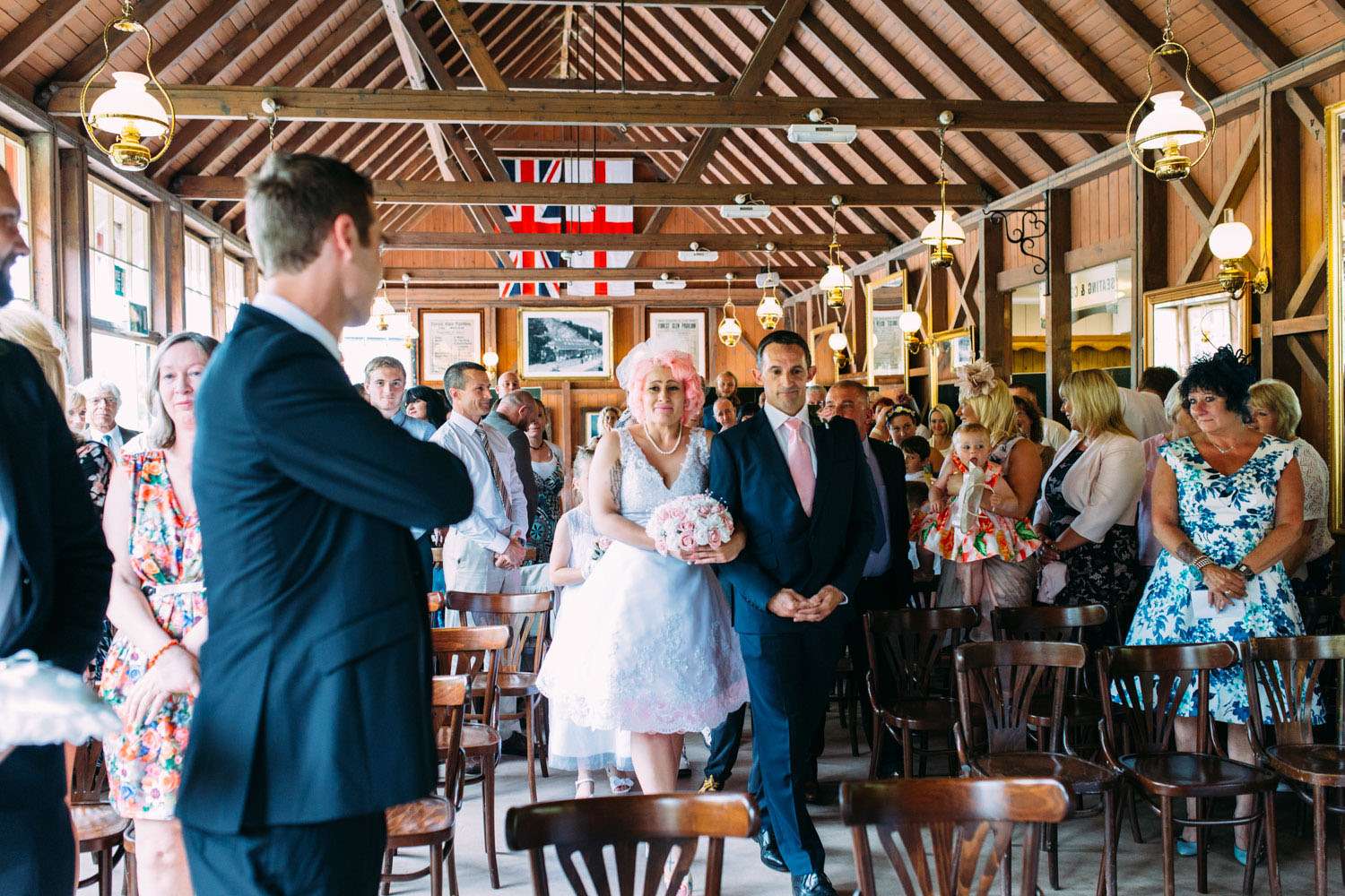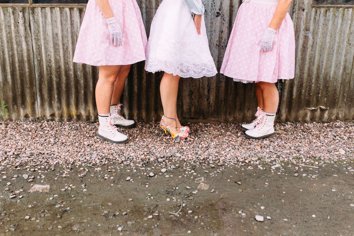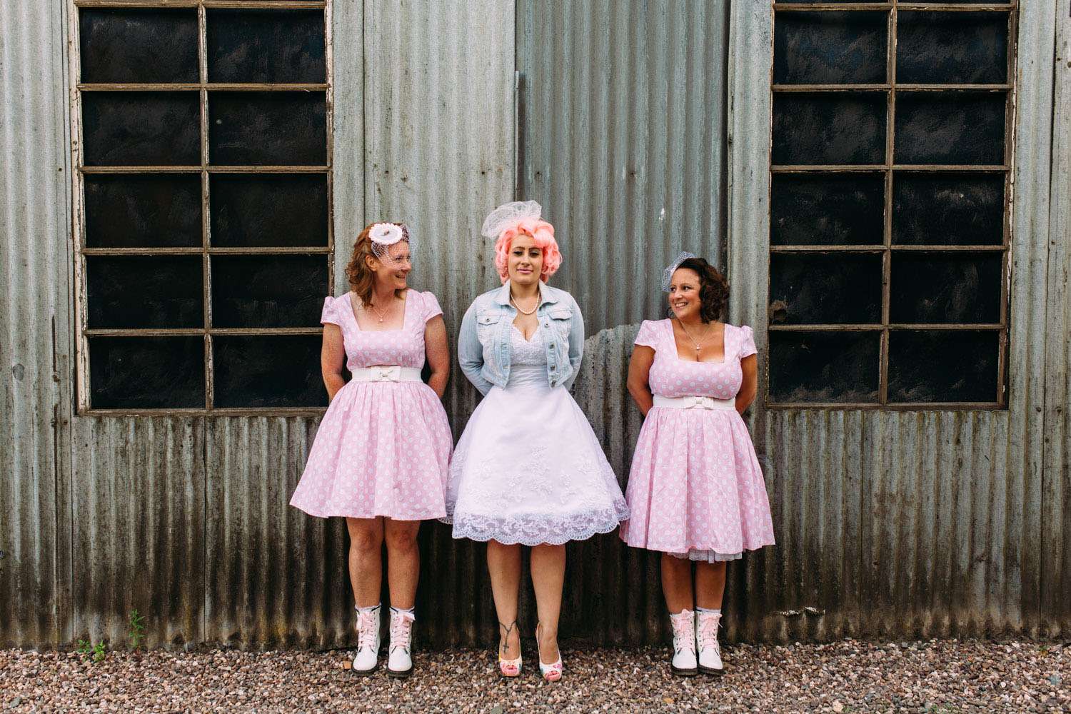 The bride wore a dress which she found on eBay and altered, with Iron Fist shoes and a homemade headpiece. Her bouquet and all the flower were foam. “I bought a wedding dress from a wedding dress shop as soon as we were engaged, but after a few months I realised it was too traditional and not really me”, said Hazel. “So I bought another one second-hand on eBay that was nearly perfect for me. I then altered it. I sewed in at the waist and used fabric paint to colour in the buttons in pink at the back, then to top it off I added a pink petticoat. My shoes were my favourite part of my outfit (I’m obsessed with shoes). They were a candy clad pair of Iron Fist shoes with a pink sparkly heel, as soon as I saw them I knew they were to become my wedding shoes. I bought the flowers from eBay. I chose them because they were foam and it meant that we could all keep them after the wedding as a reminder of the day.”