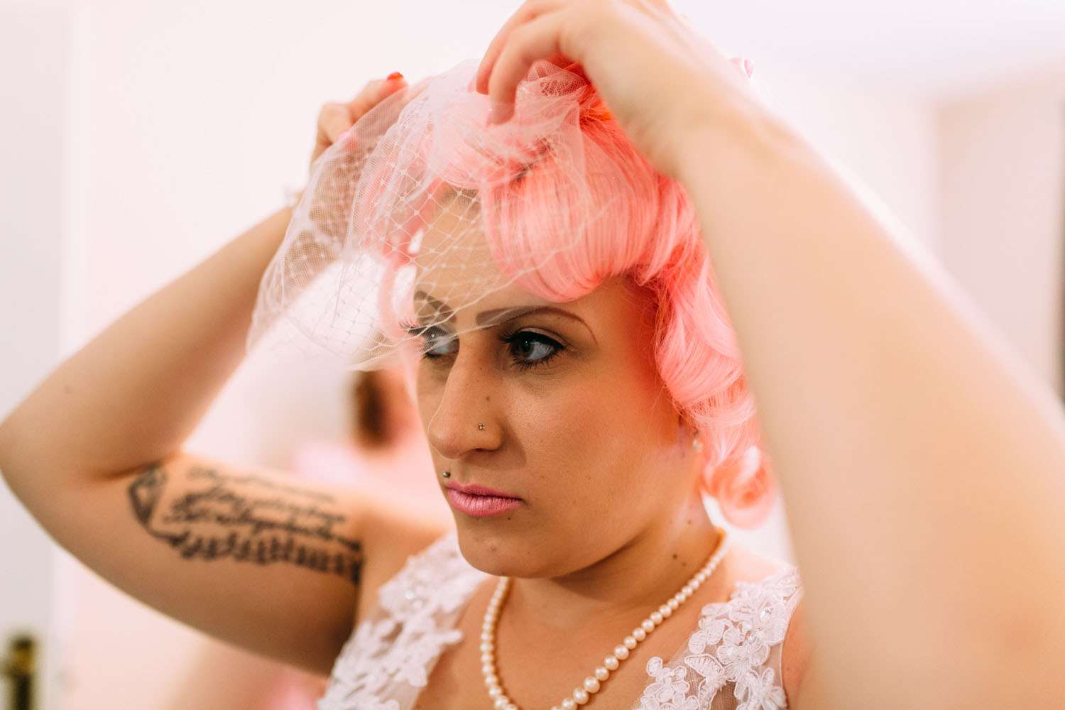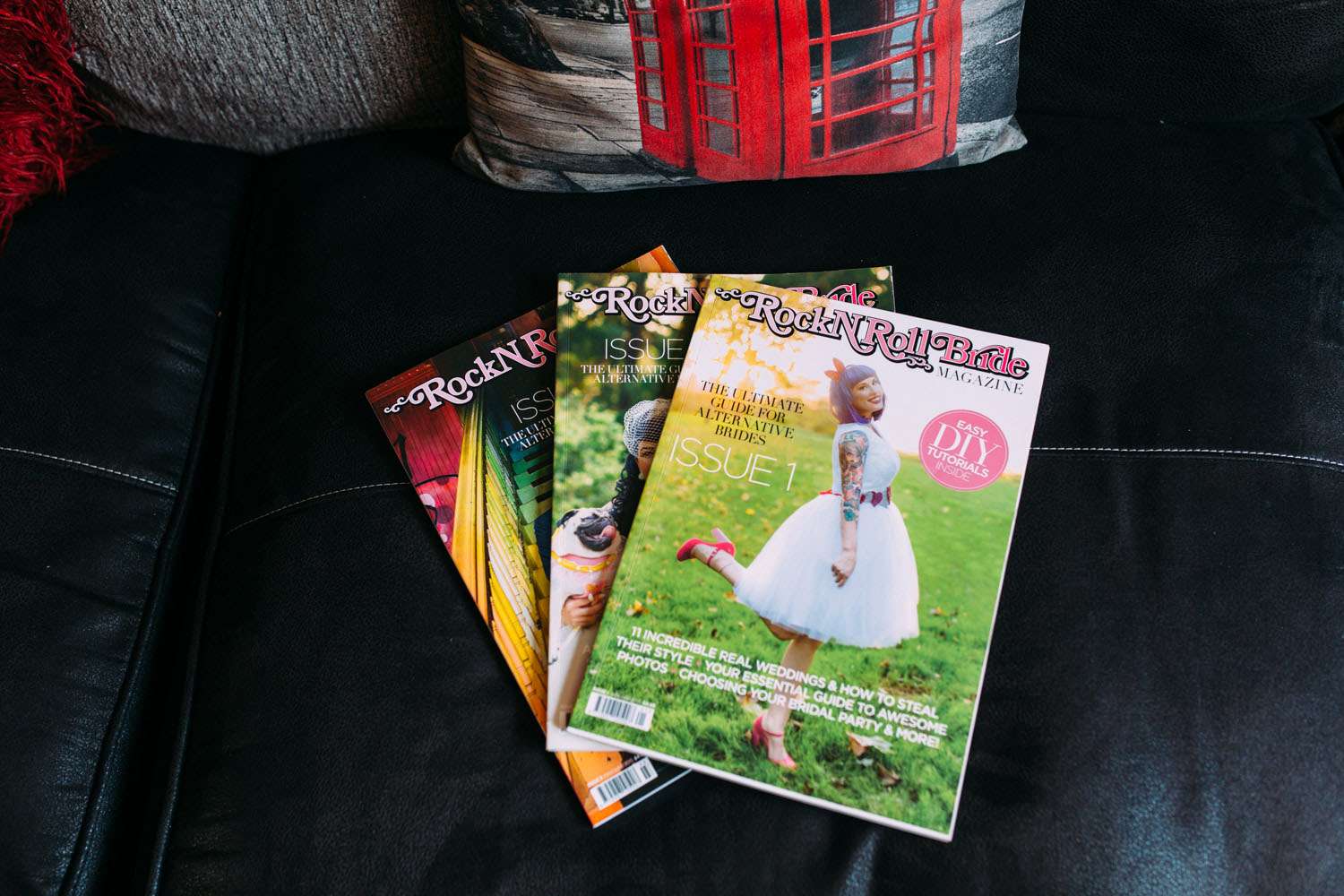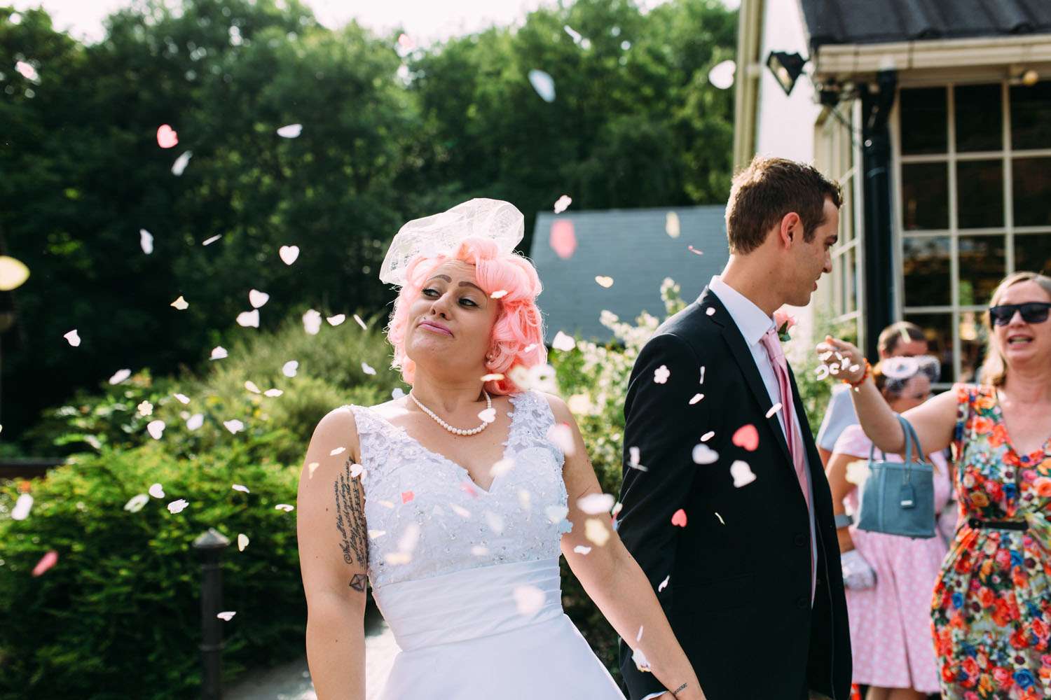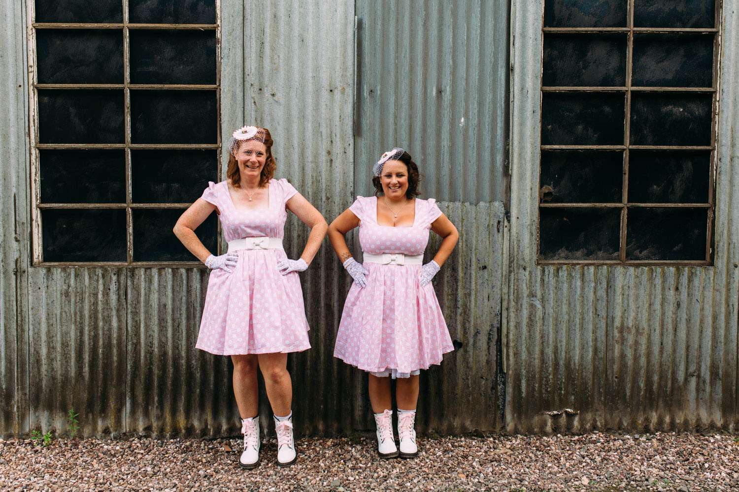 The bride wore a dress which she found on eBay and altered, with Iron Fist shoes and a homemade headpiece. Her bouquet and all the flower were foam. “I bought a wedding dress from a wedding dress shop as soon as we were engaged, but after a few months I realised it was too traditional and not really me”, said Hazel. “So I bought another one second-hand on eBay that was nearly perfect for me. I then altered it. I sewed in at the waist and used fabric paint to colour in the buttons in pink at the back, then to top it off I added a pink petticoat. My shoes were my favourite part of my outfit (I’m obsessed with shoes). They were a candy clad pair of Iron Fist shoes with a pink sparkly heel, as soon as I saw them I knew they were to become my wedding shoes. I bought the flowers from eBay. I chose them because they were foam and it meant that we could all keep them after the wedding as a reminder of the day.”