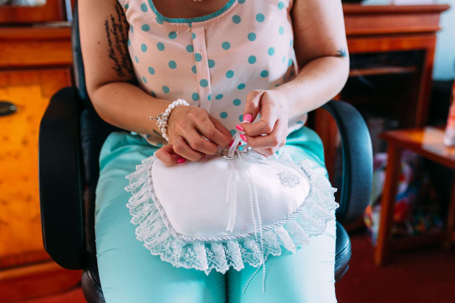 “We’ve always loved 1950s rockabilly style and that became our new basis for the wedding, Then one day I sat and watched Grease and did a bit of a bridezilla by demanding that I had a carousel! We started researching and found that it would be far too expensive until we found out that the museum down the road that had a Victorian fun fair with a carousel held weddings! It was perfect. Having the fair there was actually great for our guests too. We’ve been to lots of weddings and have noticed that there is always a quiet lull for the guests while the couple go to have their pictures taken. We wanted to fill the gaps by keeping the guests entertained and having the fair was perfect!”