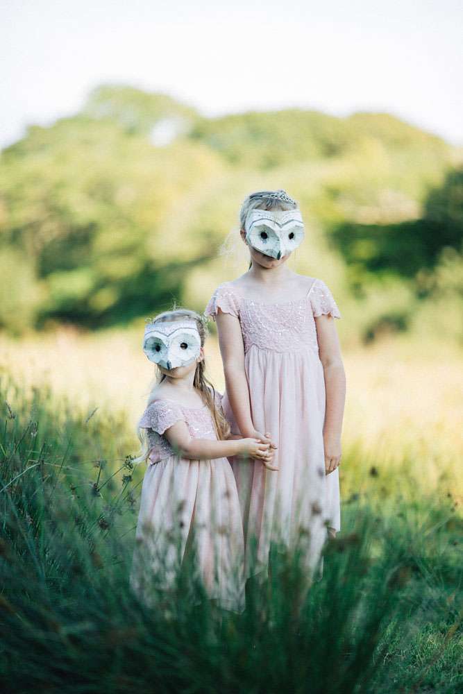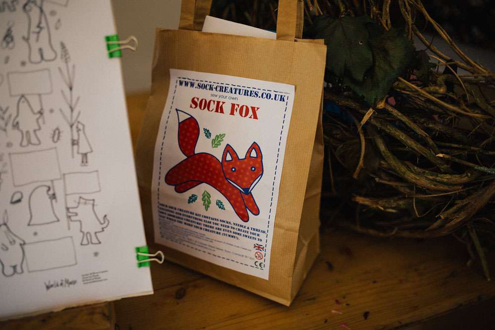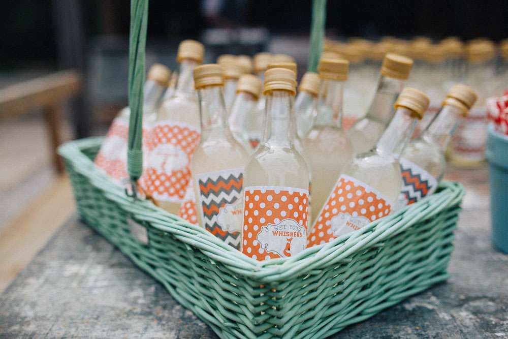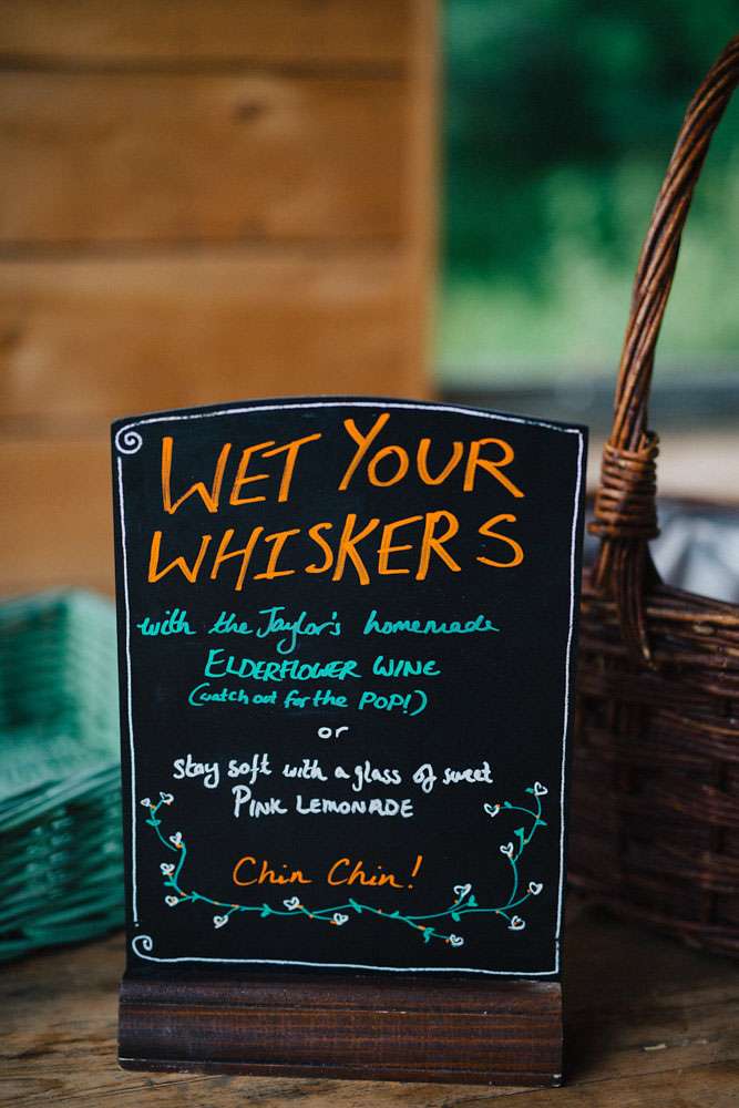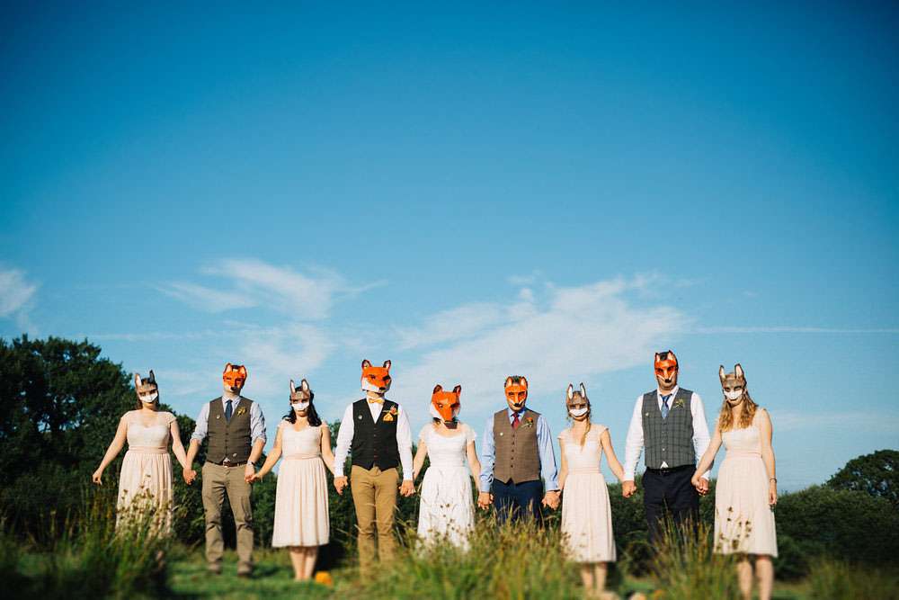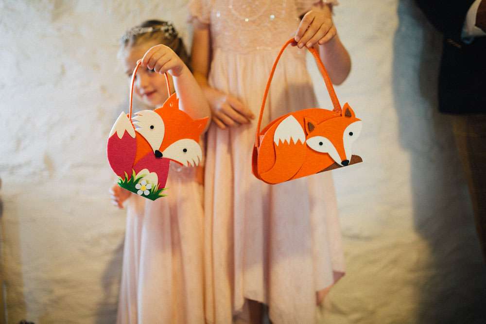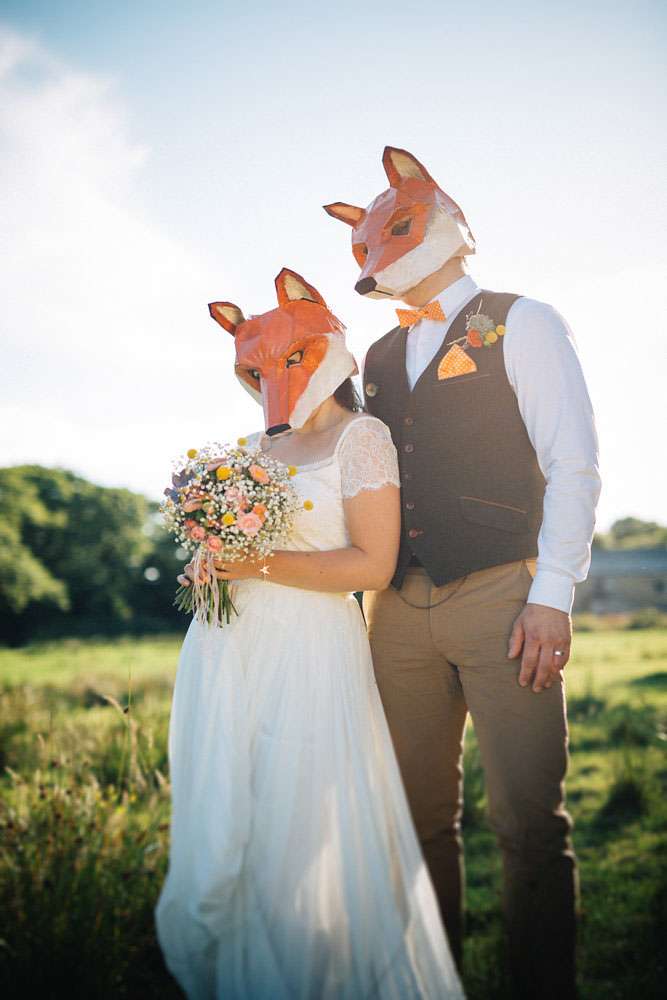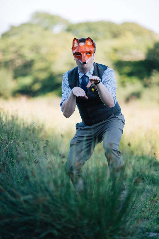 “The décor included animal themed tables, foxy touches here and there, a nest for cards and animal masks for the guests to wear. As the fox theme developed, we decided to make giant fox heads for each other, the groomsmen also had fox masks, bridesmaids had rabbit masks and my flower girls were barn owls. We also made our own elderflower champagne a month before the wedding. We picked the flower heads that were growing at one of our favourite local beaches, brewed it from scratch and bottled it up in foxy themed ‘Wet Your Whiskers’ bottles, one for each guest.”