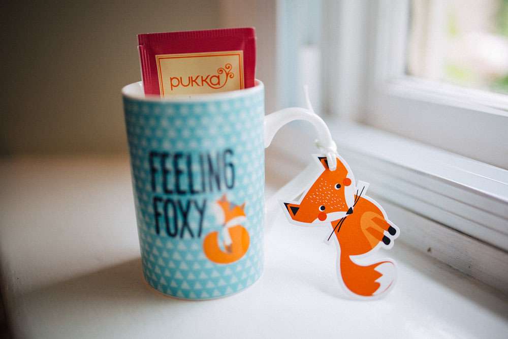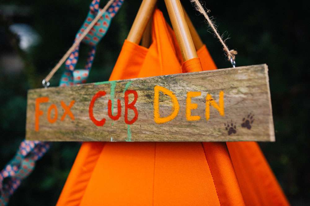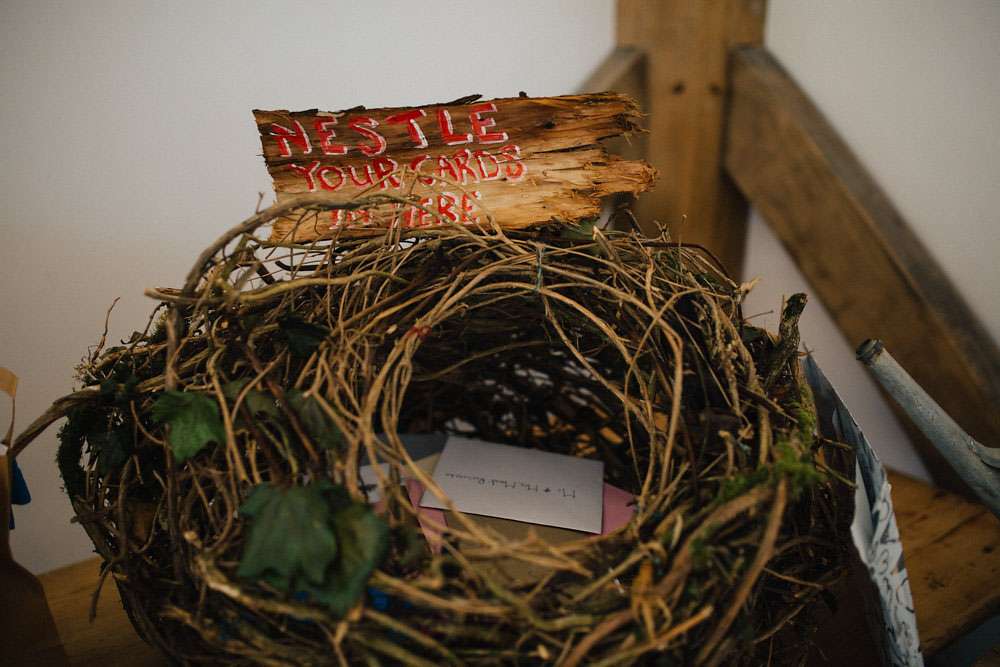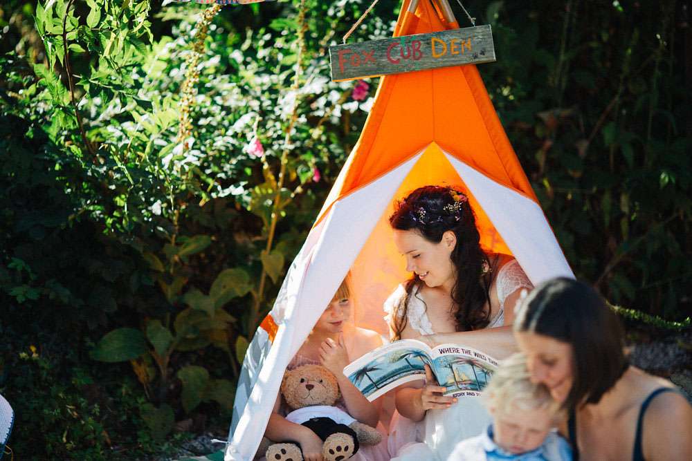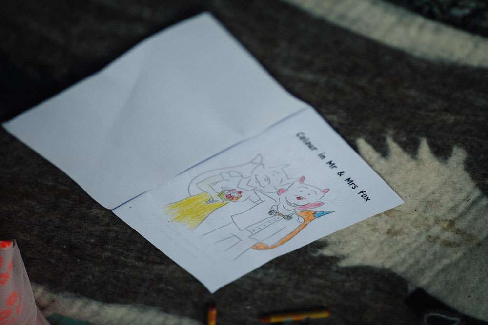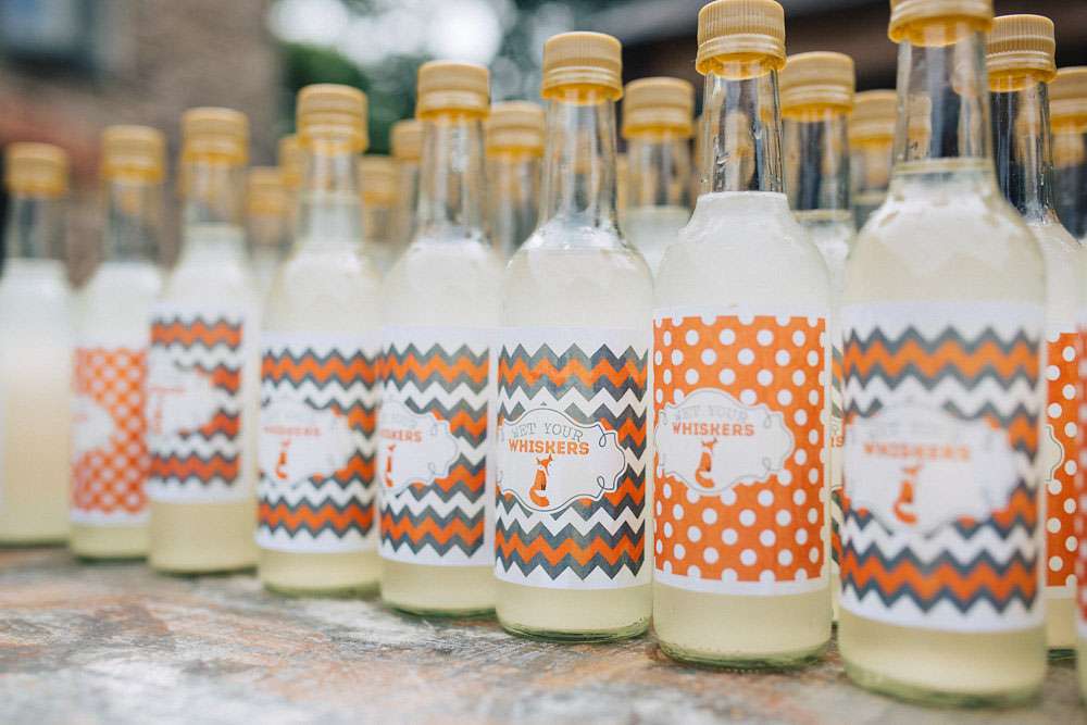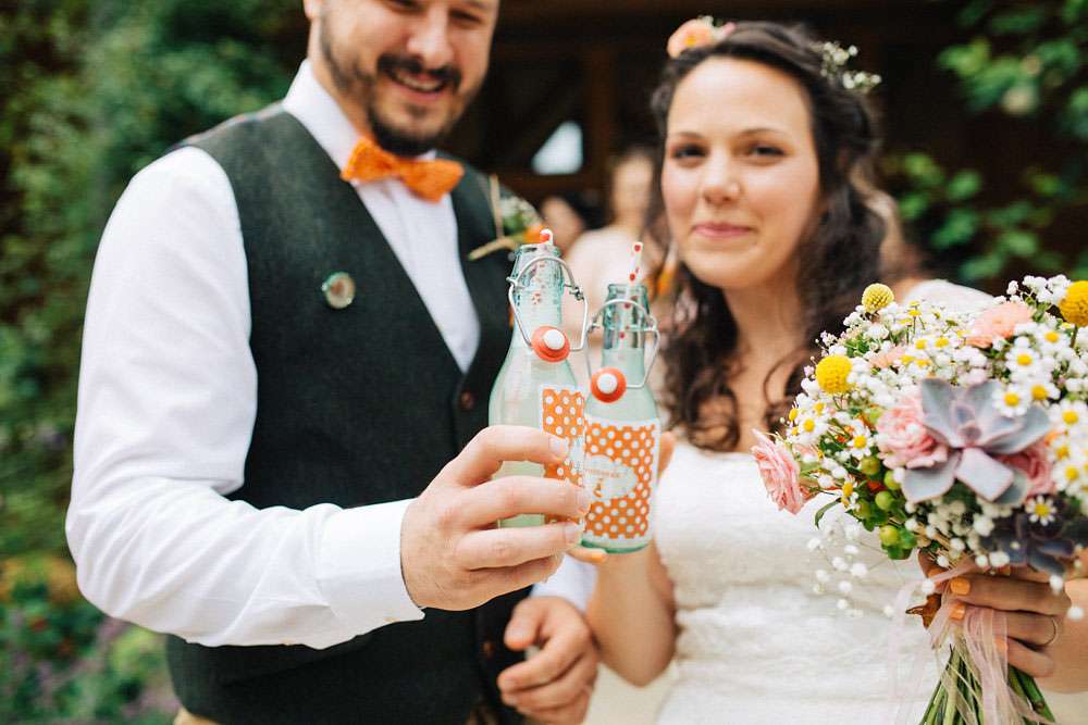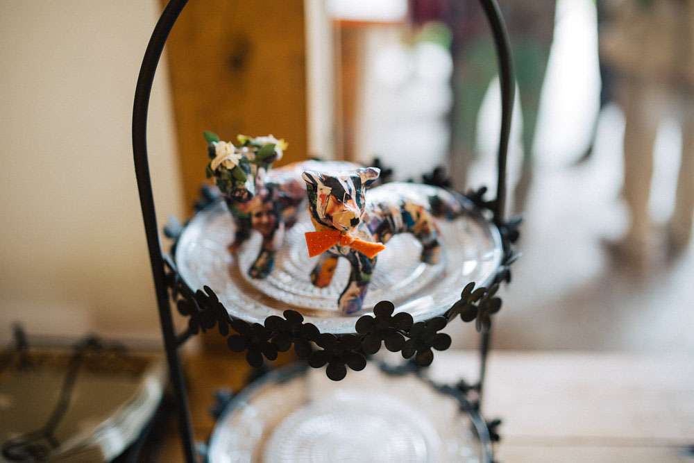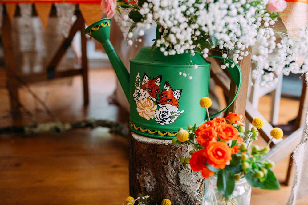 “The décor included animal themed tables, foxy touches here and there, a nest for cards and animal masks for the guests to wear. As the fox theme developed, we decided to make giant fox heads for each other, the groomsmen also had fox masks, bridesmaids had rabbit masks and my flower girls were barn owls. We also made our own elderflower champagne a month before the wedding. We picked the flower heads that were growing at one of our favourite local beaches, brewed it from scratch and bottled it up in foxy themed ‘Wet Your Whiskers’ bottles, one for each guest.”