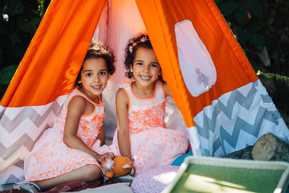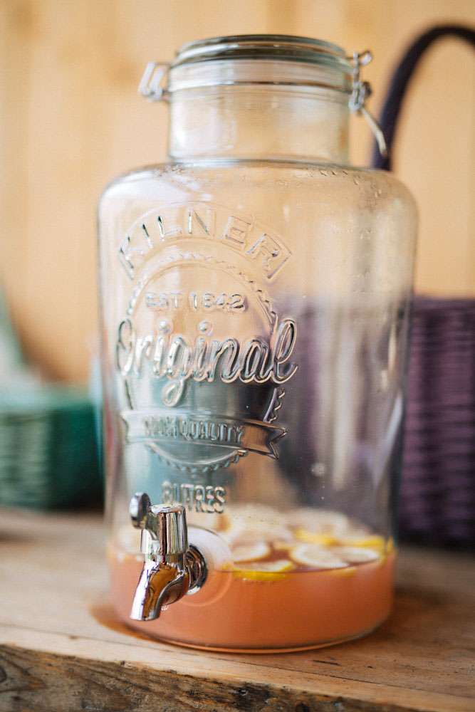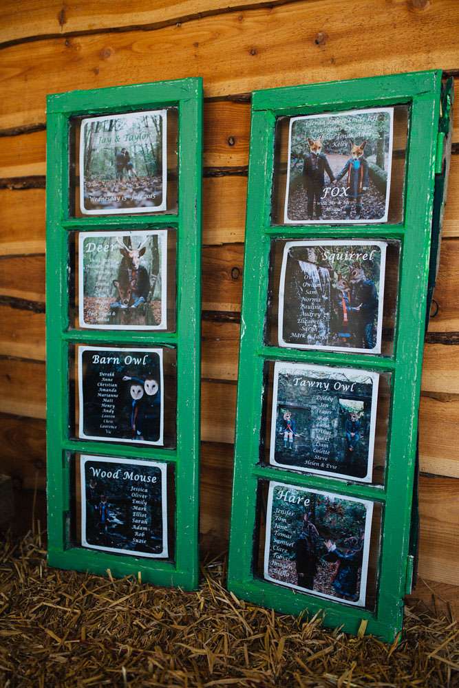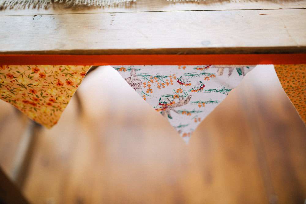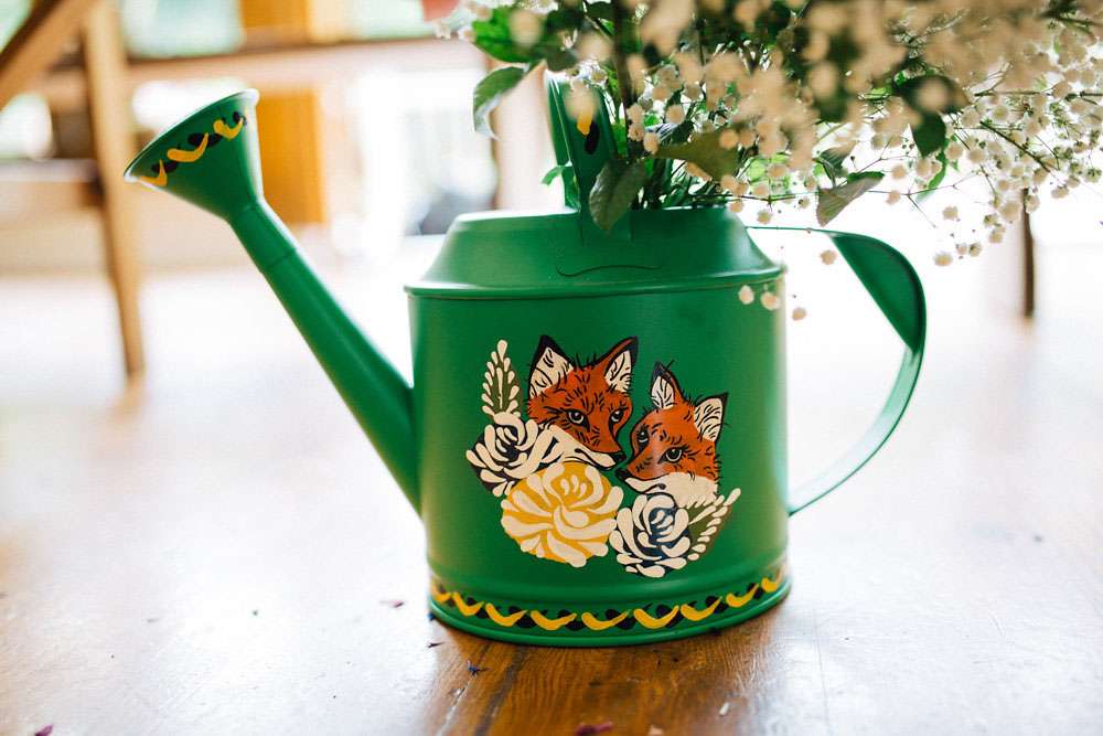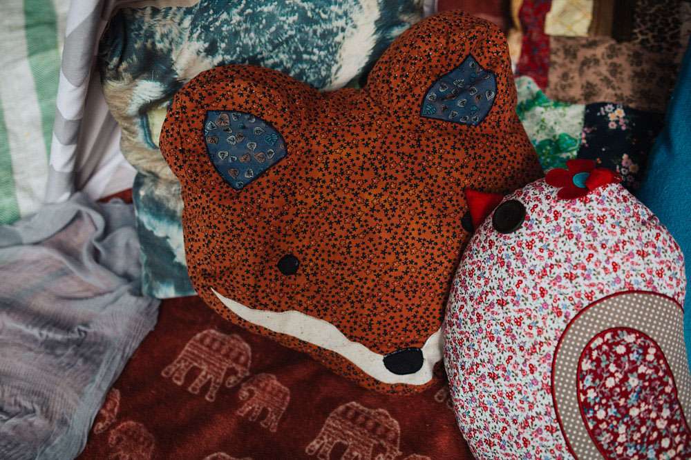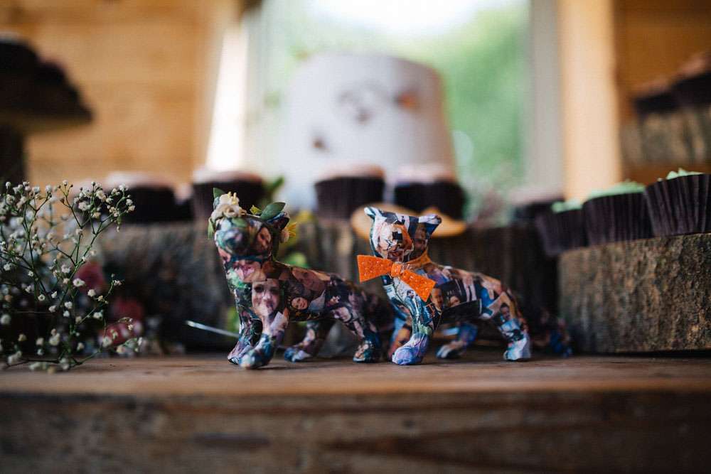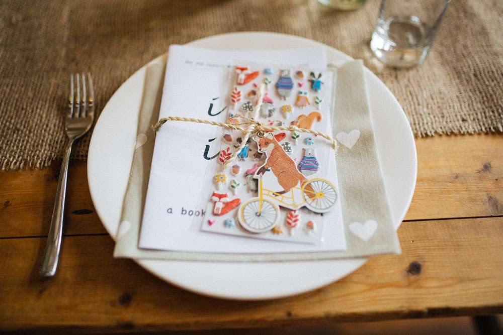 “The décor included animal themed tables, foxy touches here and there, a nest for cards and animal masks for the guests to wear. As the fox theme developed, we decided to make giant fox heads for each other, the groomsmen also had fox masks, bridesmaids had rabbit masks and my flower girls were barn owls. We also made our own elderflower champagne a month before the wedding. We picked the flower heads that were growing at one of our favourite local beaches, brewed it from scratch and bottled it up in foxy themed ‘Wet Your Whiskers’ bottles, one for each guest.”