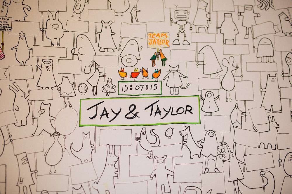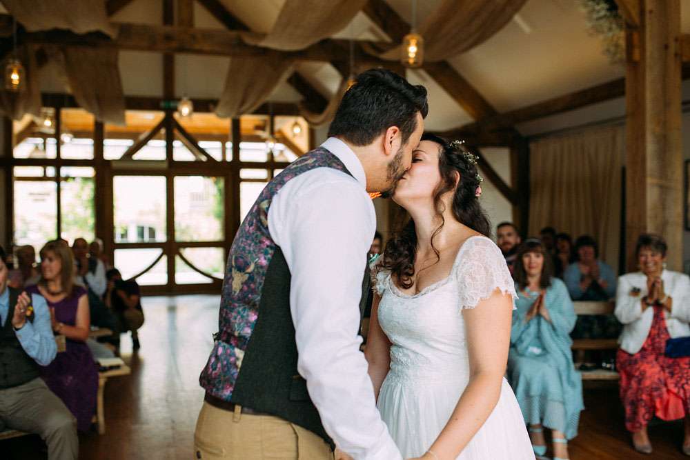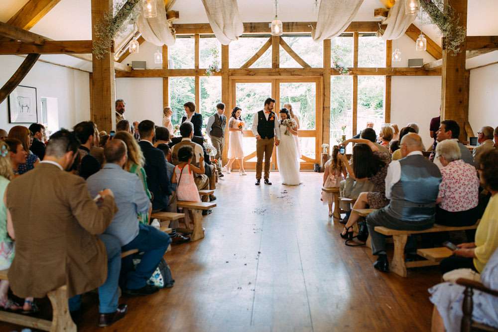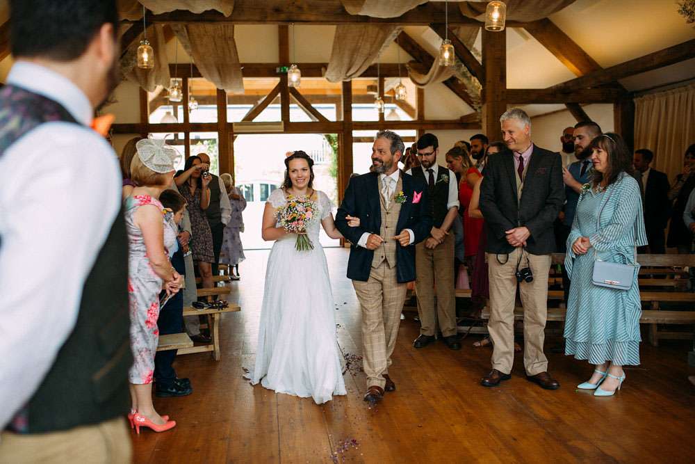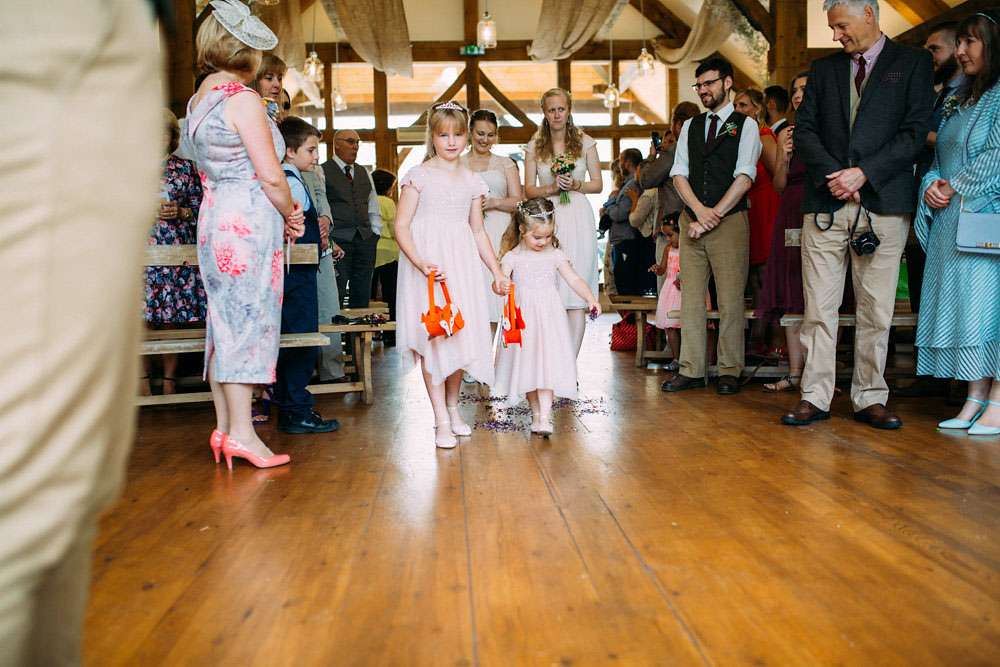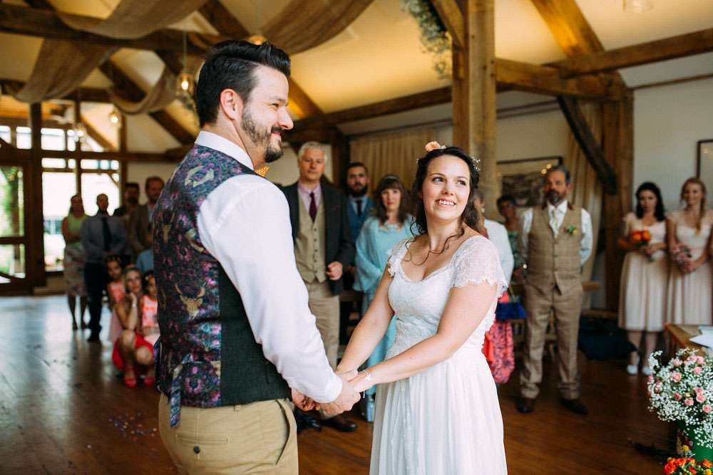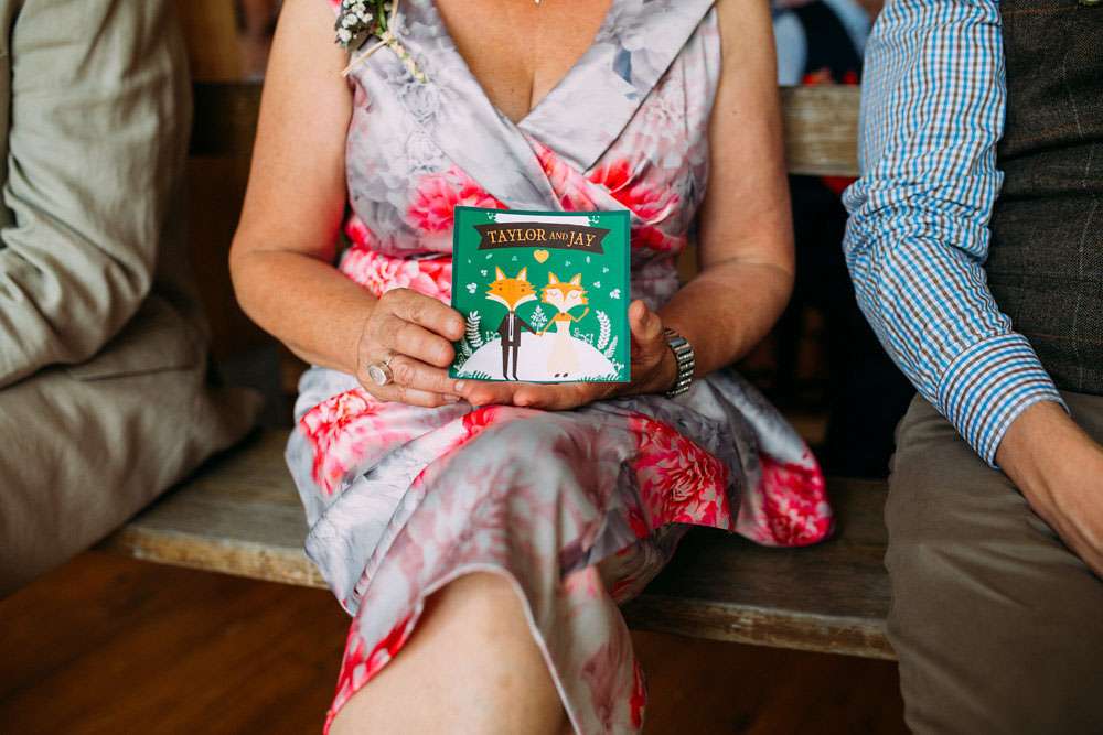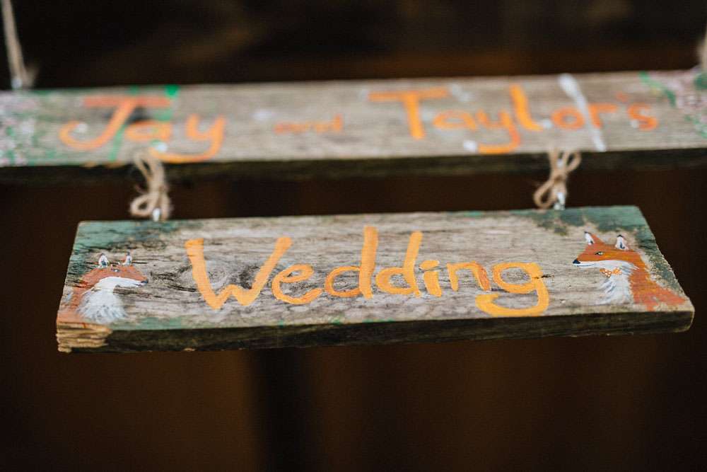 The day began with the ceremony inside the beautiful barn at their venue, Nancarrow Farm. “We are both teachers and Jay asked two of his students to be our musicians for the ceremony”, Taylor said. “They played an acoustic banjo and ukulele version of The Civil Wars Forget Me Not as I entered the barn escorted by my dad. Jay’s sister Vicki performed a reading called I like You, which was sweet, silly and child-like. My brother Owain performed a self-devised stand-up comedy routine during the ceremony entitled Fox Facts – why not include stand up during a wedding ceremony! This personal, quirky reading was hilarious and had the whole of the congregation, including the registrars in hysterics – a nice and different break form formalities.”