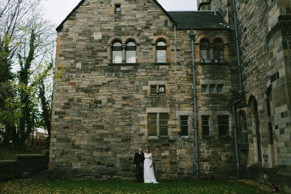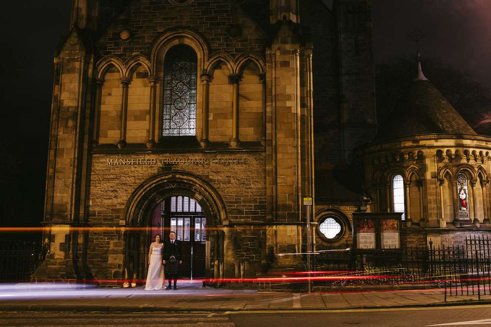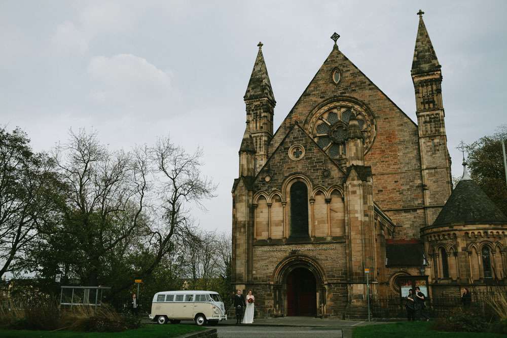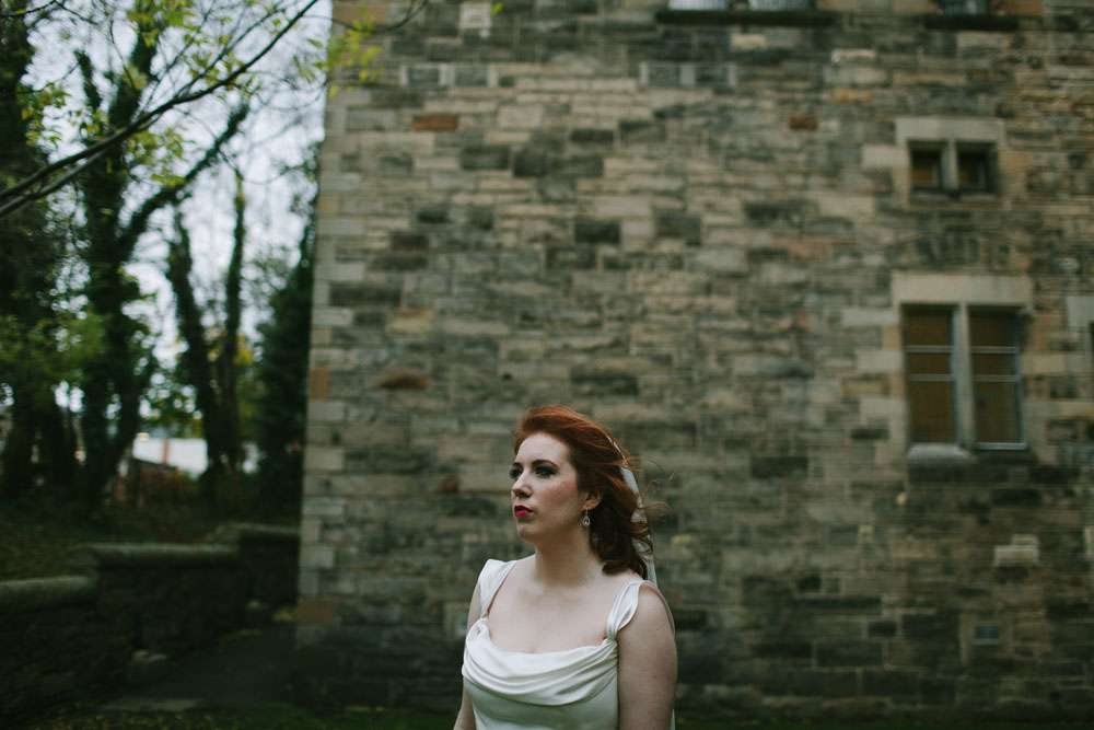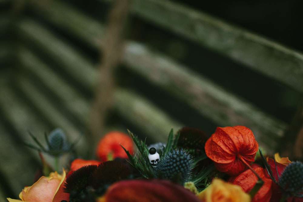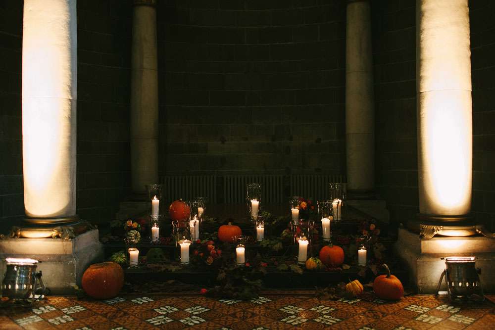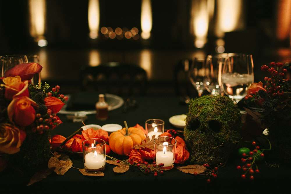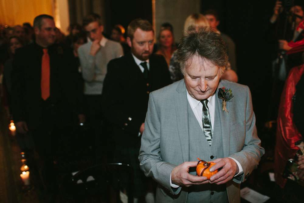 Both the ceremony and reception were held at the dramatic setting of Mansfield Traquair, a really unique heritage venue in the city. “I think a lot of people wouldn’t want to get married on Halloween but we couldn’t think of anything better!” she continued. “We completely embraced the theme too. There were pumpkins everywhere and we even asked guests on our invites to BYOP (Bring Your Own Pumpkin!) to help decorate the venue. We had some amazing designs! We had more pumpkins and candles to add to the décor as well as a bucket with apples so the guests could go bobbing for apples! The moss skulls for the top table were just incredible. The were made by Planet Flowers who did all our florals and they went completely above and beyond and provided far more in than they charged us for from the arrangements to the little details like themed Halloween drinks for the guests.”