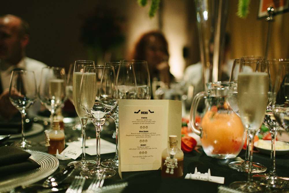 “We also worked with our caterers to develop a menu around the theme. We had pumpkin and butternut squash soup to start, beef with braised red cabbage for main, and a bespoke bobbin’ for apples dessert. The dessert was a warm ginger cake with a honeycomb ice cream bonbon served with a mini jar of mini apples bobbing in hot apple syrup, which guests had to fish out with a skewer. This was a great talking point for guests as most tables made a game of it!”