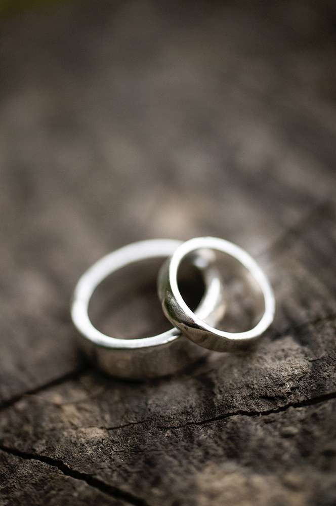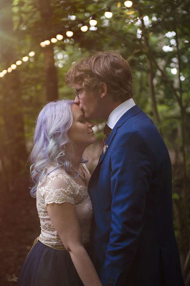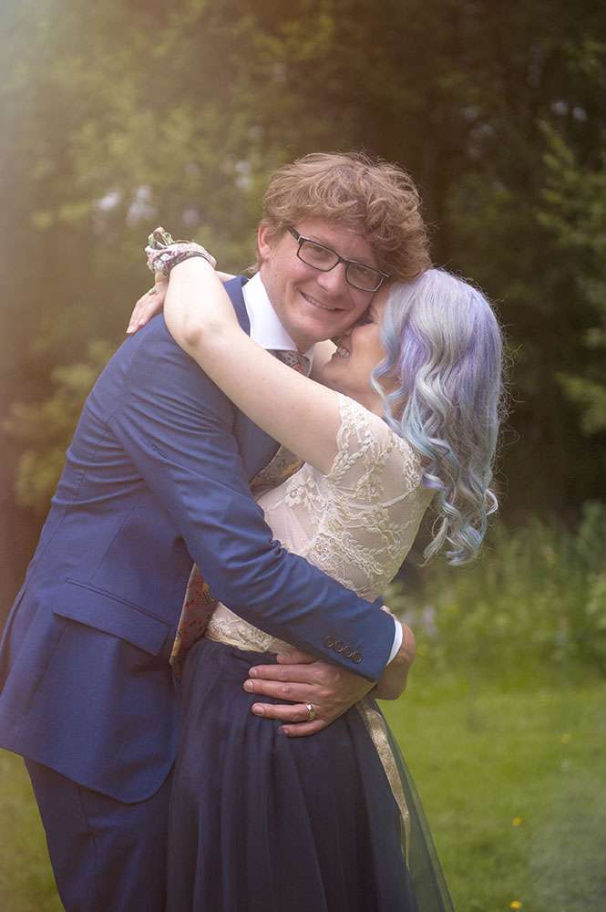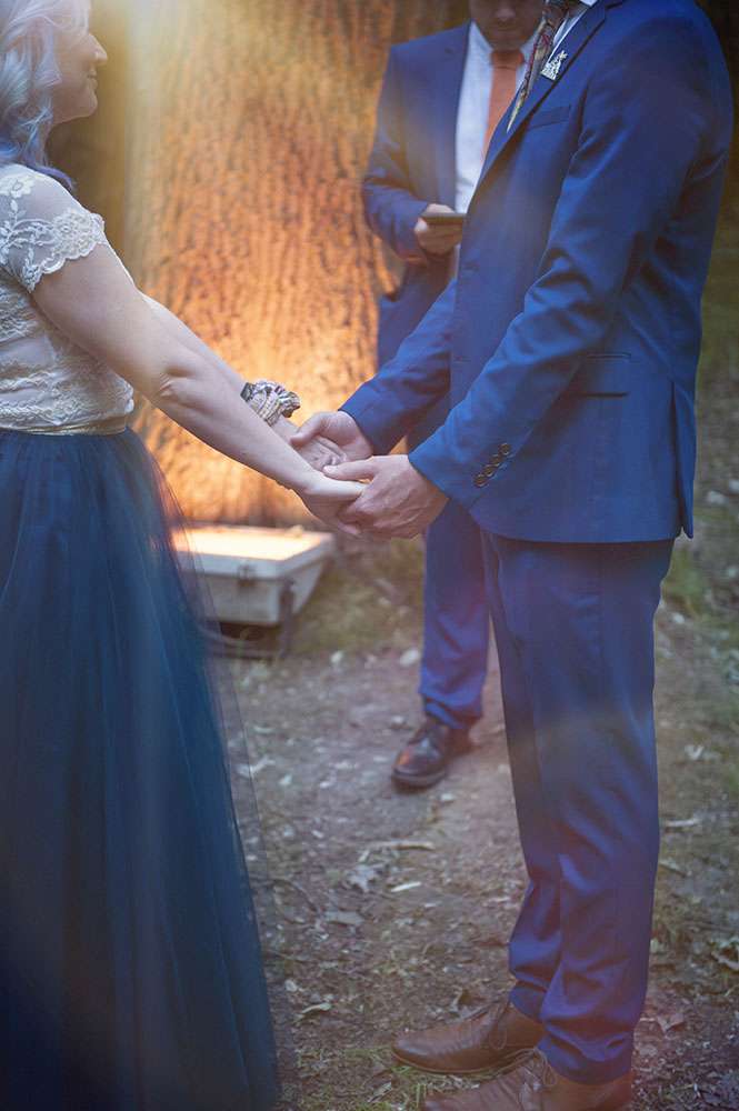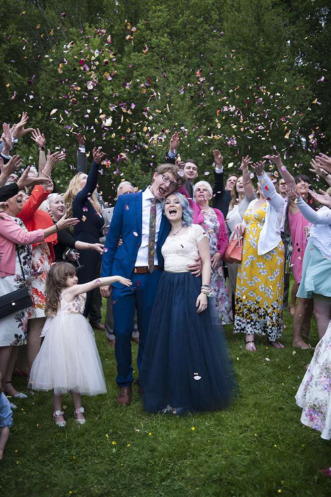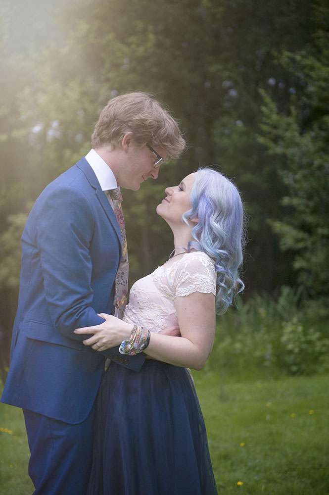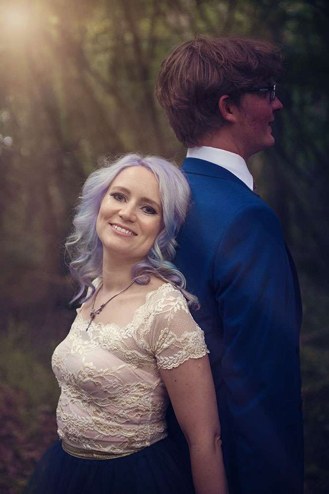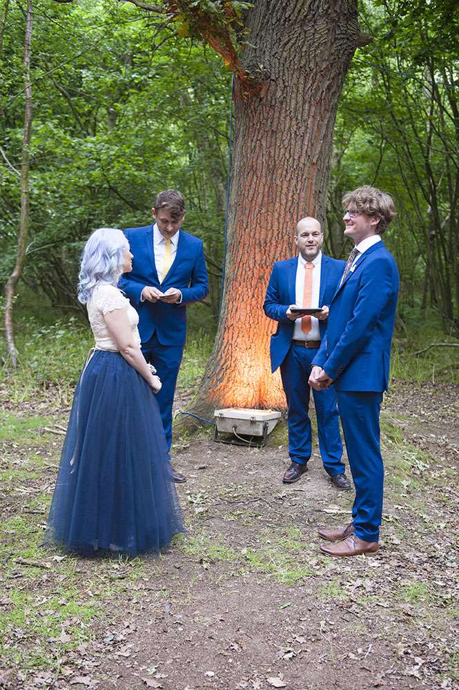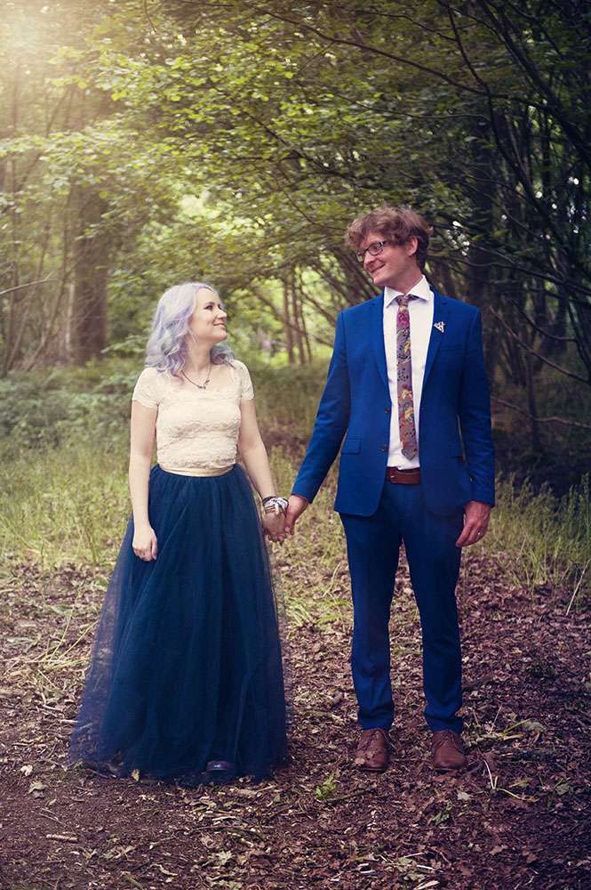 The bride’s outfit was comprised of a navy blue tulle skirt which she bought on Etsy and a top from Brighton Lace. The couple had a very unique idea for their rings too. “We always wanted to make our wedding rings together and we came up with the idea of finding metal which was special to us”, Jo said. “We took a long shot and wrote to Michael & Emily Eavis at Worthy Farm to politely ask if we could have some metal from the farm site to put in our rings to tap into that special feeling that runs through the ground in Glastonbury. To our amazement (and eternal gratitude) we were given a chunk from the old Pyramid Stage. We then struggled for months to find a jeweller who would work with the metal and luckily found Shelley Thomas at the Forge at London Museum of Steam & Water, who not only wanted to work with us but allowed us to create bespoke silver rings ourselves with the nuggets of Pyramid metal inside. So we now have a bit of the Glastonbury Festival, which has been such a massive part of our relationship, inside the rings we crafted together. Following our wedding day, we went straight to the festival this year and had an incredible honeymoon in the fields of Avalon! ”