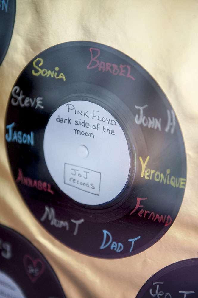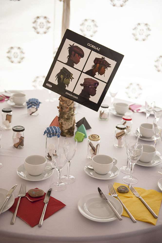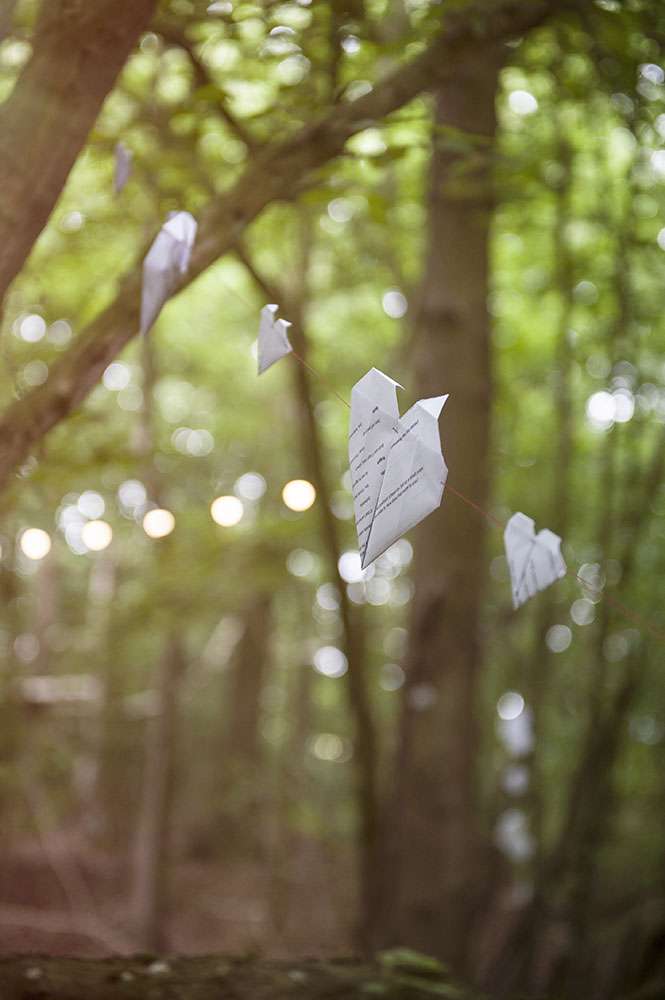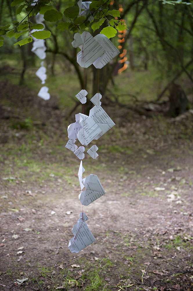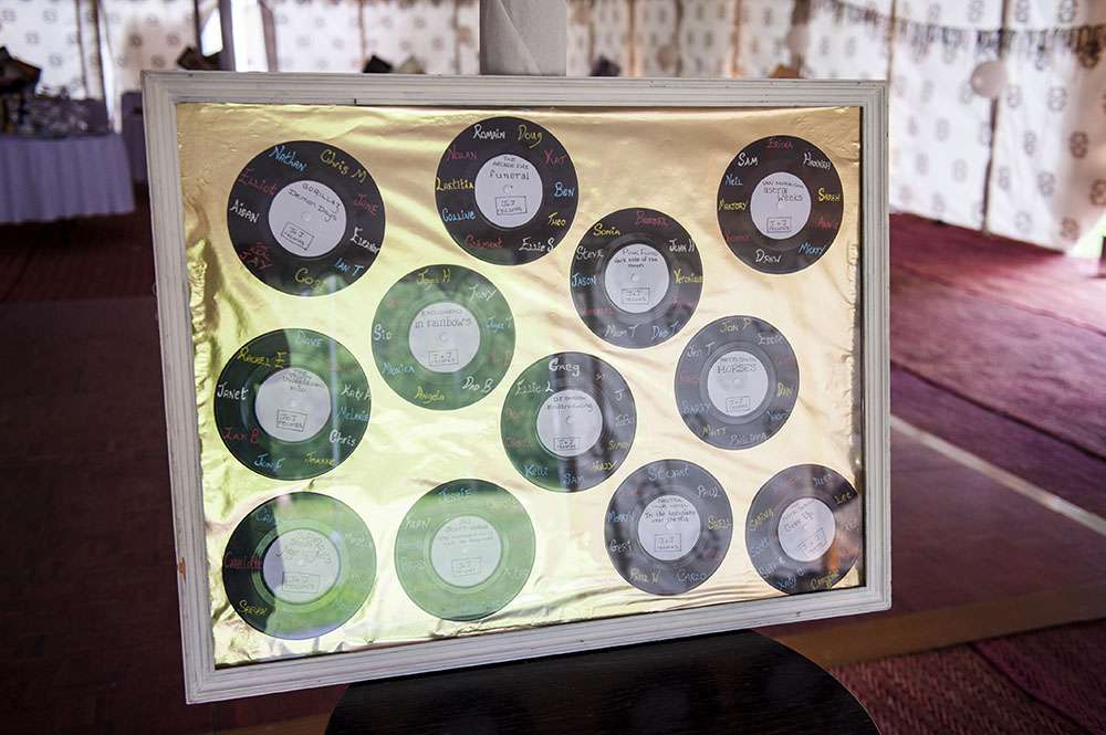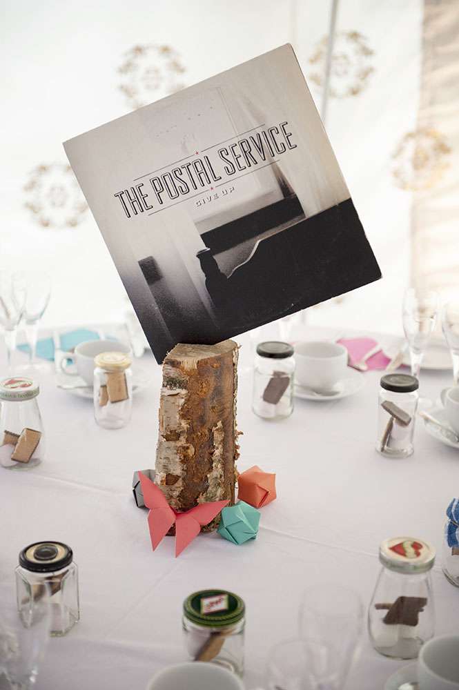 “Other DIY included the garlands made out of an old Moroccan rug which was falling apart. We also made origami decorations and the table plan out of old 7” records which were no longer playable. Friends and family helped us collect 150 jam jars which we used to hold wedding favours and as candle holders, and one of our bridesmaids made garlands from old theatre scripts. We made table decorations out of our favourite vinyl sleeves embedded in sustainably-sourced firewood which was later used for a campfire. The vinyl sleeves are fine and being re-used to hold our favourite records again. Everything we used was created from something that already existed and needed a new purpose (i.e a tired old rug), not only making it budget friendly but keeping the whole day sustainable.”