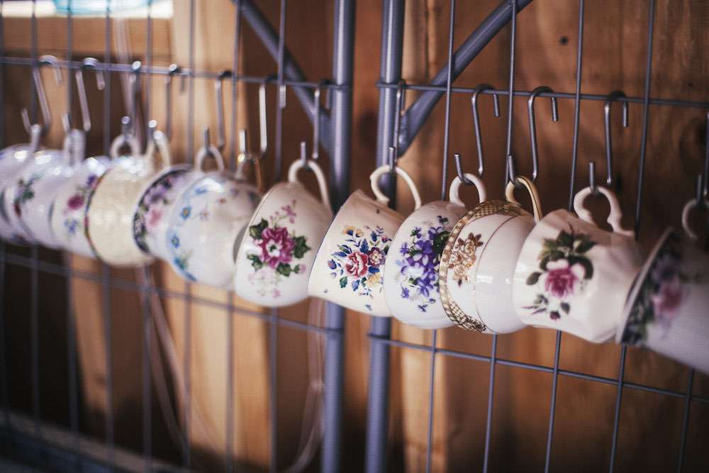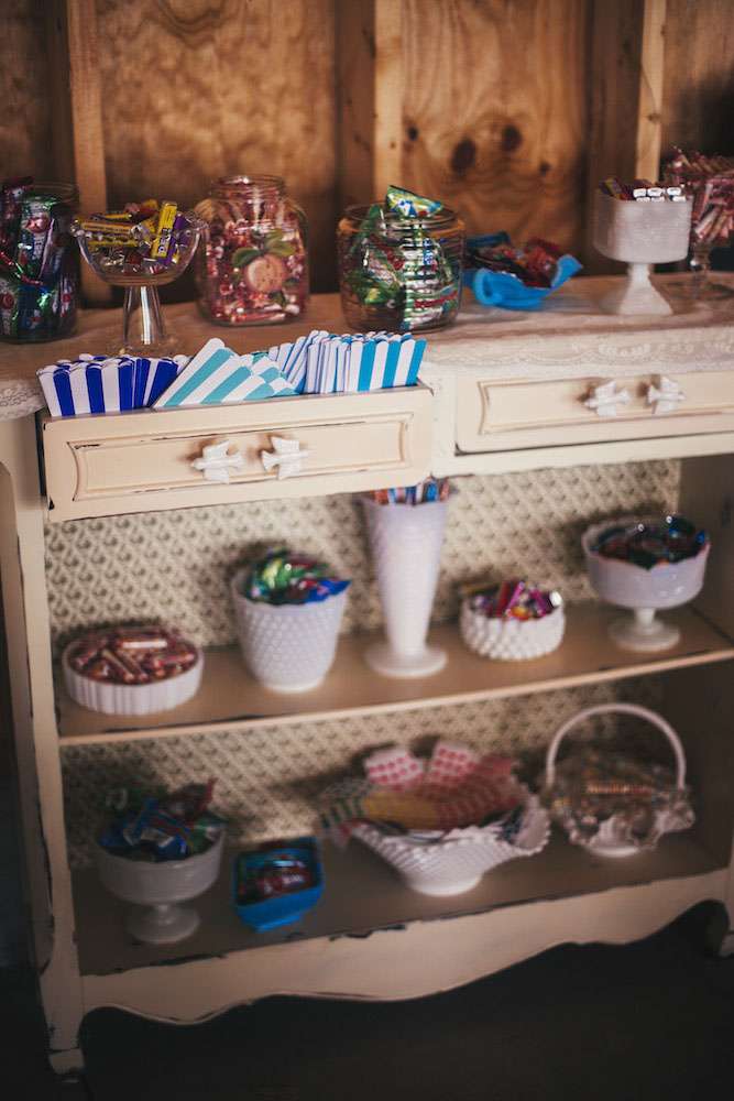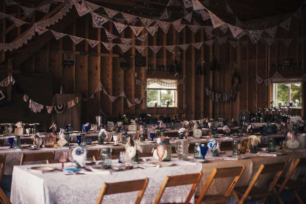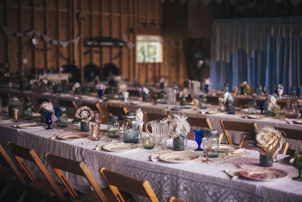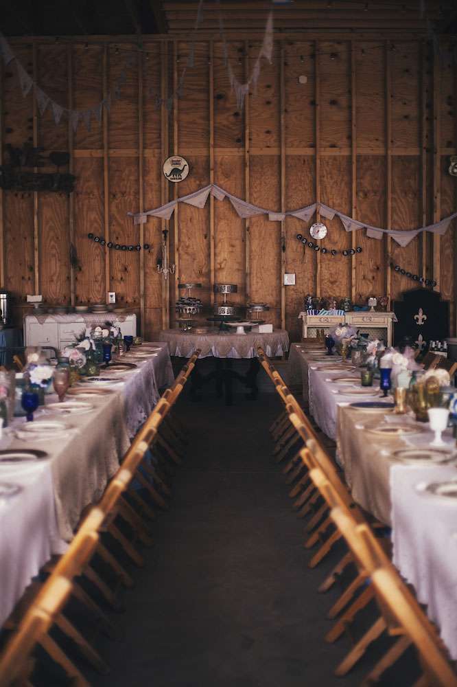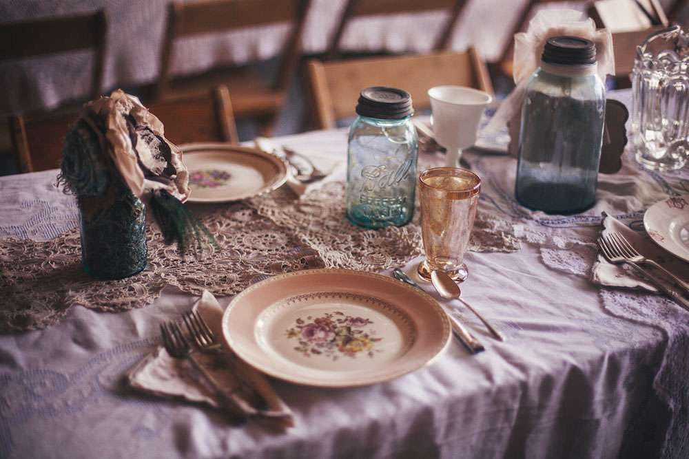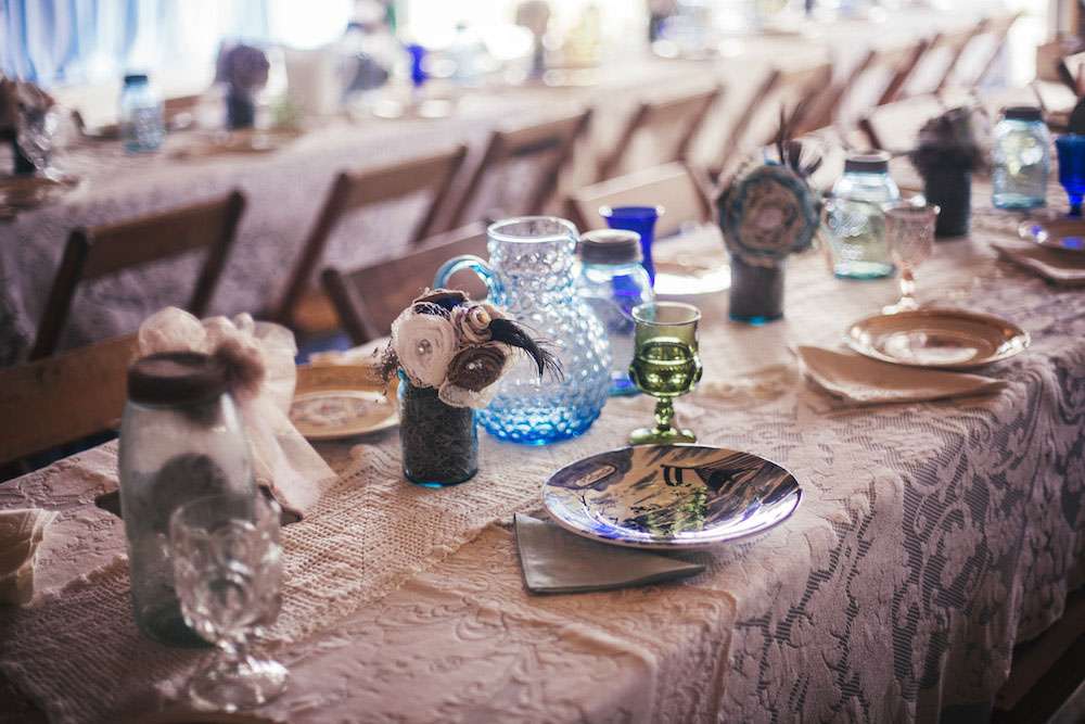“Everything was DIY! Well, except my dress, that was bought about 8 sizes too big and tailored to fit me so there would be extra fabric for the pick-ups and train. We were on a really tight budget and overall we I spent the most on the china, glass, and silver. However we got it all from flea markets and yard sales so we could keep it afterwards.”