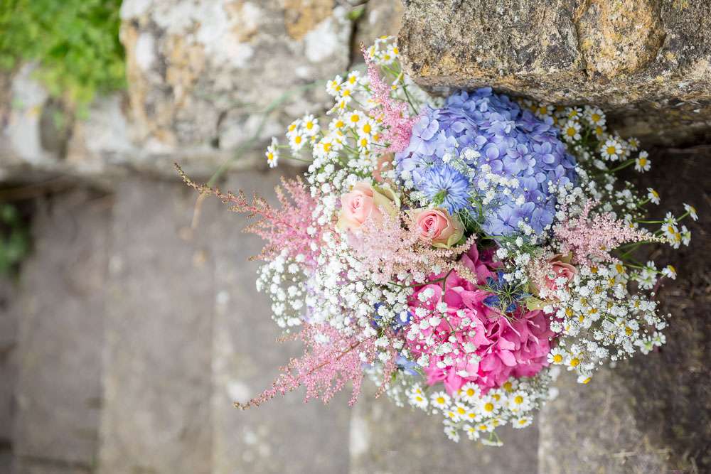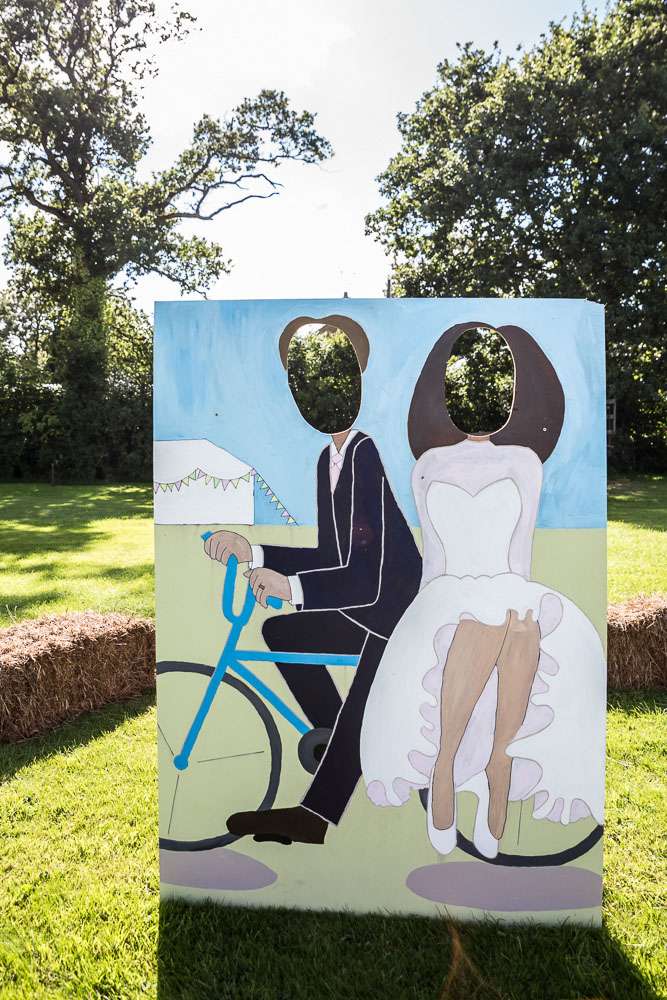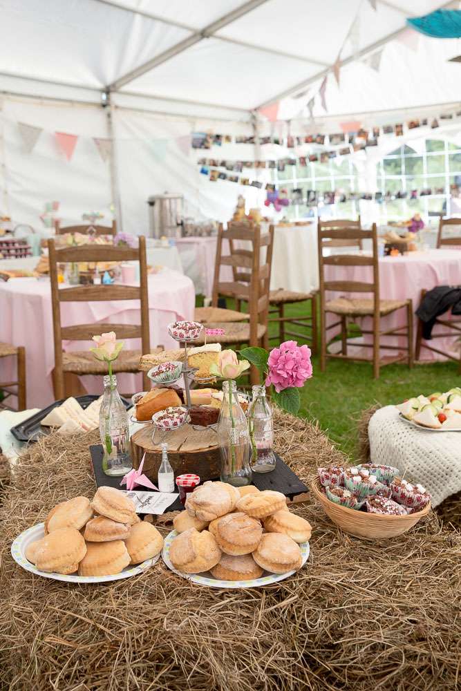 Their wedding theme was a country fete, vintage tea party. “We really just focused on family, children and fun”, she continued. “We didn’t do a receiving line, table plan or sit down dinner as that just isn’t us. We tried to include a lot of quirky and fun details throughout and everything was personal reflected us. I’m a country girl so having hay bales as seating was a necessity and the wooden cable reel drums as tables was James’ inspired idea!”