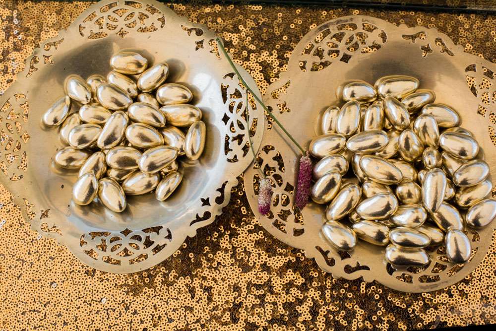 “While these were our primary sources of inspiration, I spent a long time scouring the Internet for ideas, and anything that made our hearts sing was appropriate”, she continued. “We also wanted a mystical and spiritual nature at the wedding event. I wore a gold Vesica Piscis temporary tattoo from Danielle Laporte representing the union of god and goddess. The pointed oval at the centre of the sacred geometric pattern is also said to represent the divine feminine. This was something that was really important to me as a woman.”