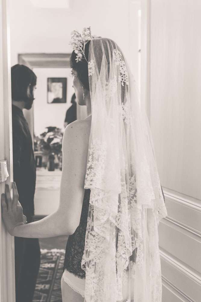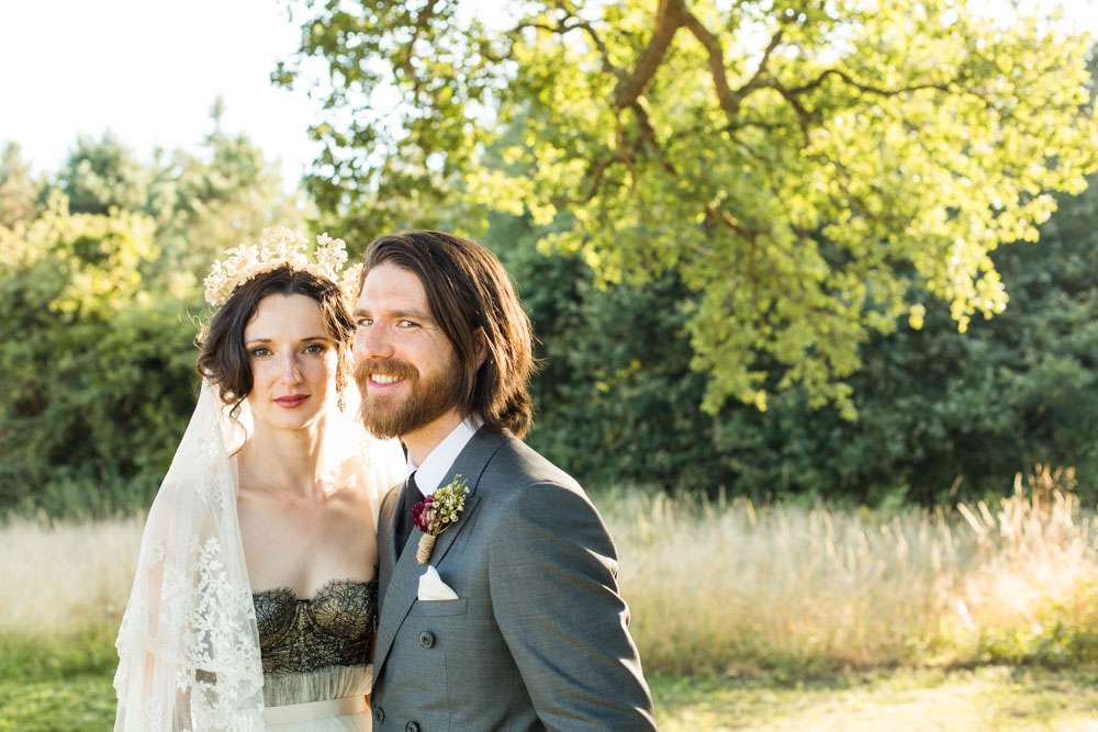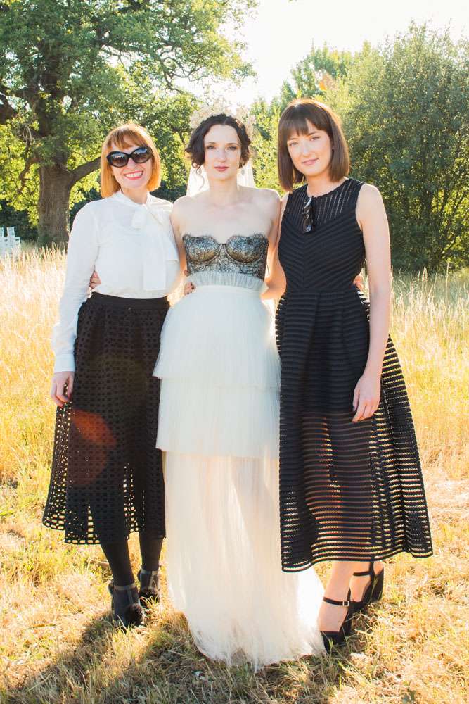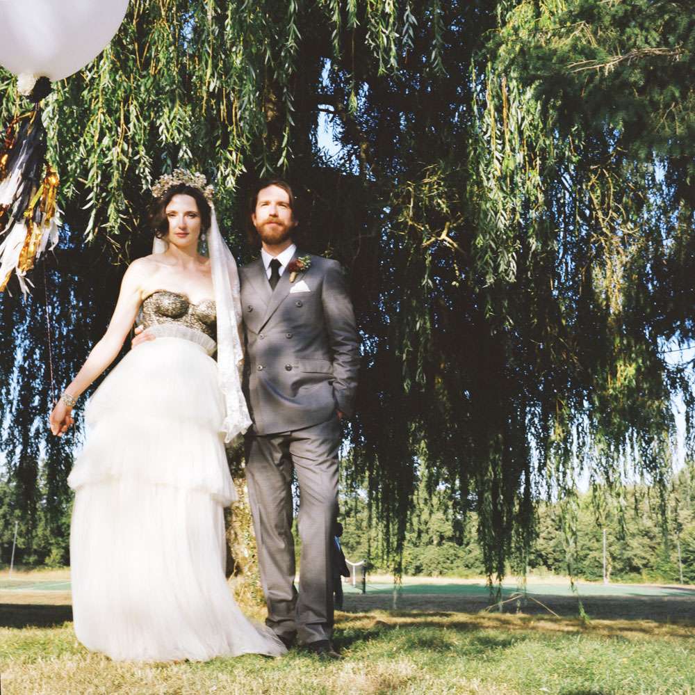 The bride wore a corset from Agent Provocateur with a tulle skirt made for her by a friend who is a designer. Her ceremony headpiece was an antique wax crown from the 1940s and her amazing veil was made in 1890. After the ceremony she changed into a Jenny Packham crystal headpiece which she rented, instead of bought, in order to save money. “Having my dress made for me by my incredibly talented (genius!) designer friend was one of the best things about planning the wedding. It’s not every day you get a couture dress and I really did feel totally beautiful, and like myself (most importantly).”